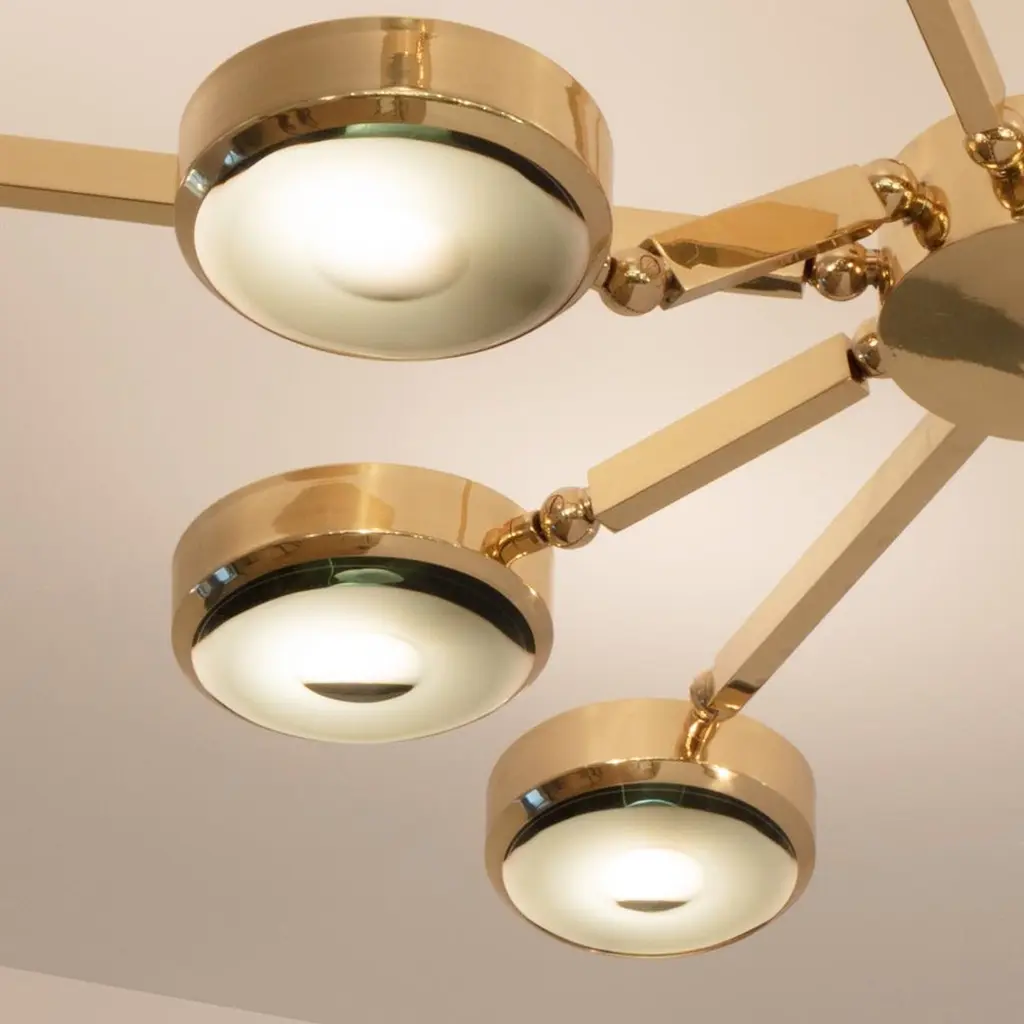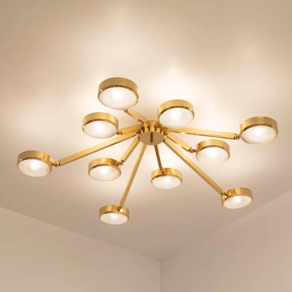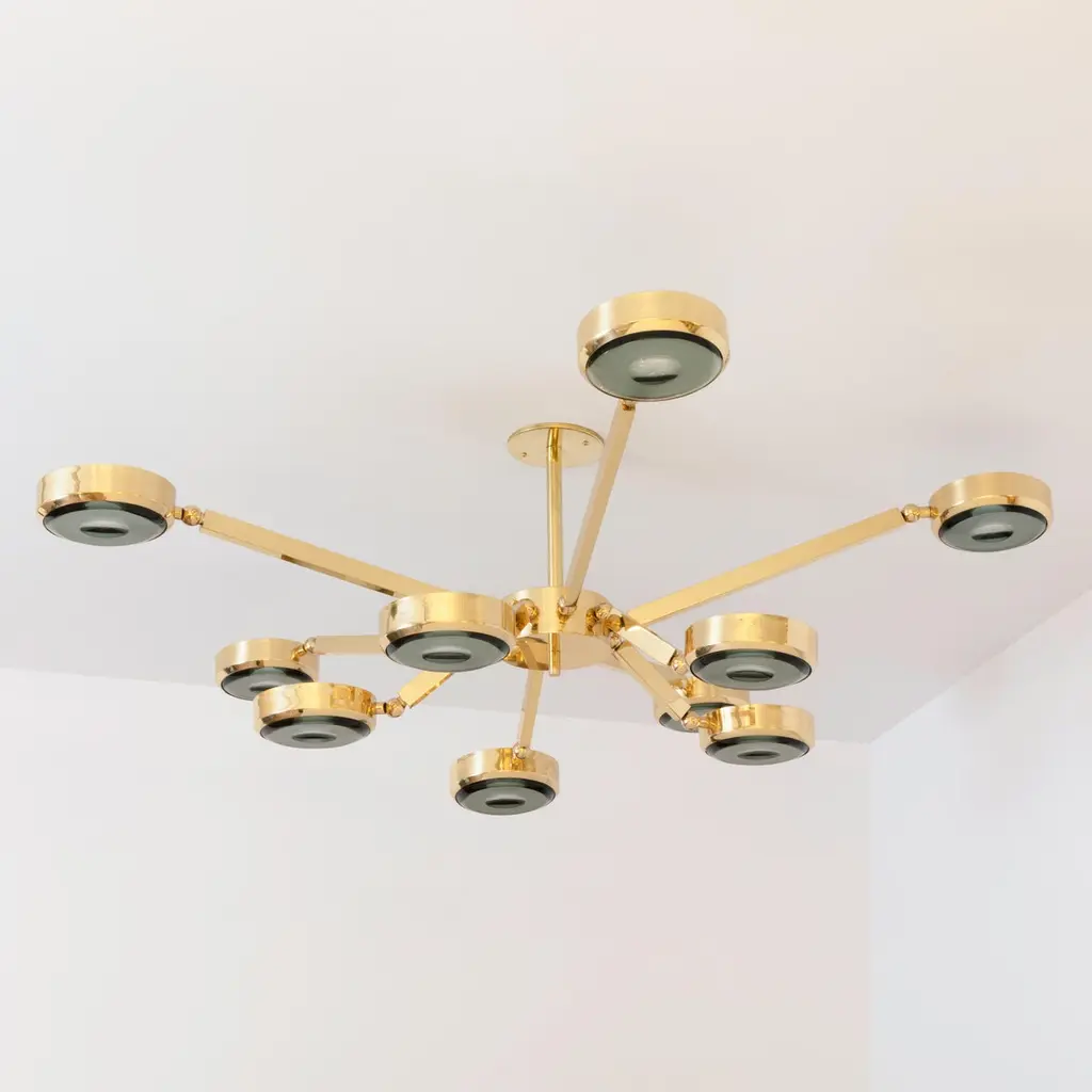 The Oculus ceiling light features an innovative articulating design that allows the ten arms to have a wide range of motion for endless configurations. The brass constructed frame can be flush mounted or installed on a stem and is fitted with our carved glass made in Milan. The first images show the fixture in our polished nickel finish-subsequent pictures show it in a selection of alternative finishes. Starting at $ 17,400 for standard finishes.Starting at $ 18,900 for premium finishes.Customization Options:Each fixture is hand crafted in Italy and can be customized in size, layout and number of shades. Available in any of our 10 finishes and 8 enamel colors. Compatible with our carved glasses, Murano bubble glass and Murano frosted glass.Lead Time: 10-12 weeks plus shipping.Diameter: 52”Height: 15”. Overall height can be adjusted as needed. 2.5” minimum heightElectrical: Ten E12 40W incandescent or 75W LED equivalentModel#: LTZ581/A