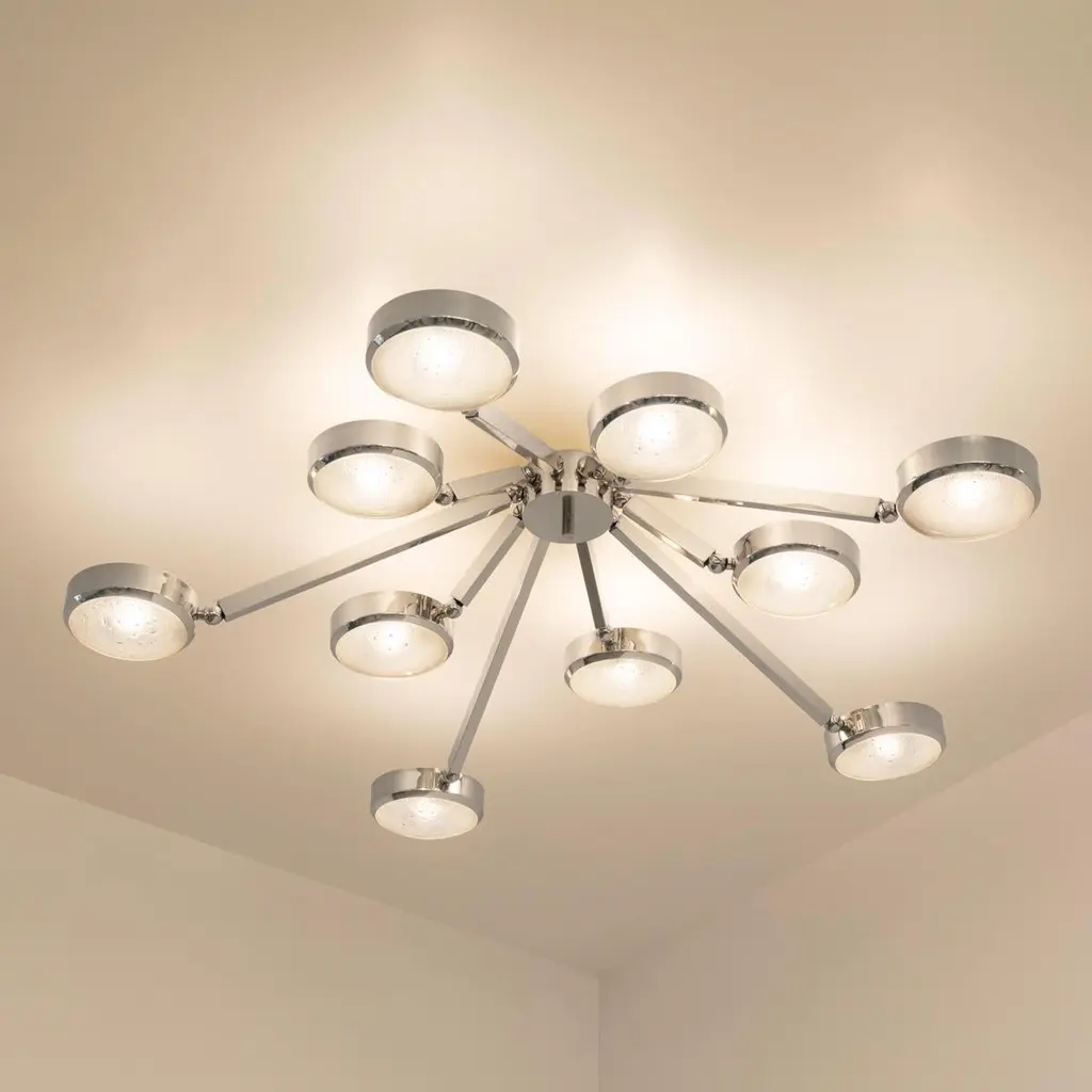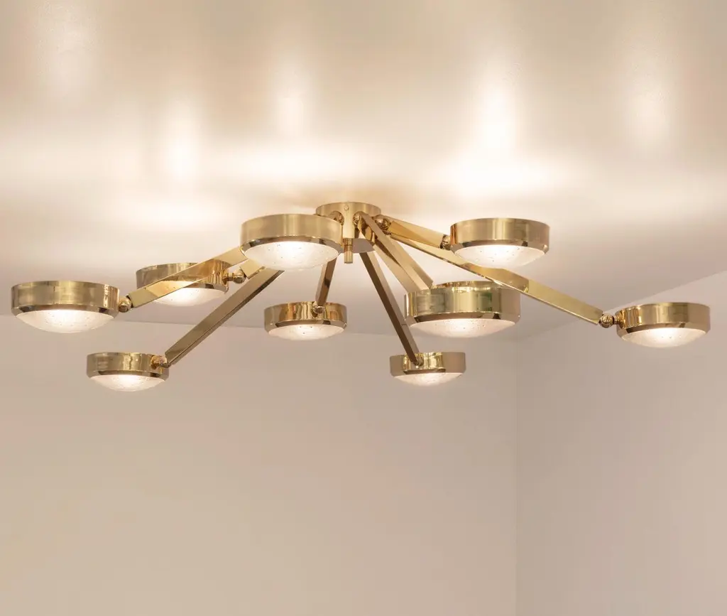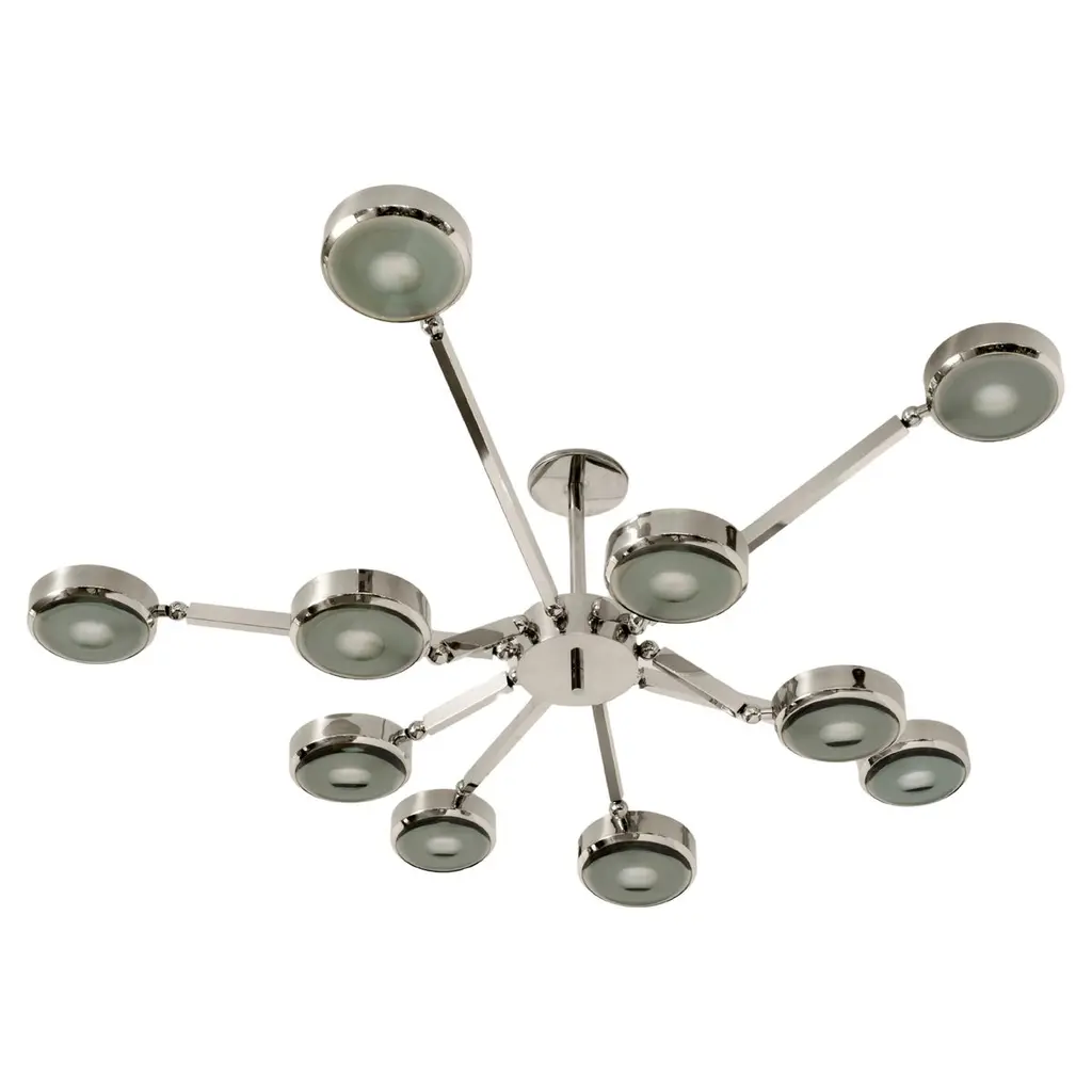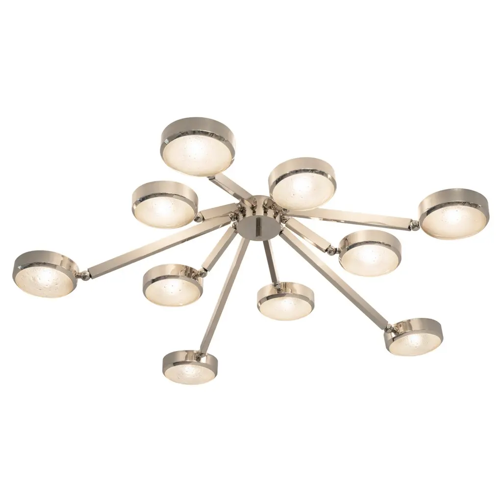 The Oculus ceiling light features an innovative articulating design that allows the ten arms to have a wide range of motion for endless configurations. The brass constructed frame can be flush mounted or installed on a stem.The first images show the fixture in our polished nickel finish with Murano Bubble glass -subsequent pictures show it in a selection of alternative finishes. Starting at $ 12,400 for standard finishes.Starting at $ 13,500 for premium finishes.Customization Options:Each fixture is hand crafted in Italy and can be customized in size, layout and number of shades. Available in any of our 10 finishes and 8 enamel colors. Compatible with our Murano bubble glass, Murano frosted glass and carved glasses.Lead Time: 10-12 weeks plus shipping.Diameter: 52”Height: 10”. Overall height can be adjusted as needed. 2.5” minimum heightElectrical: Ten E12 40W incandescent or 75W LED equivalentModel#: LTZ581/B