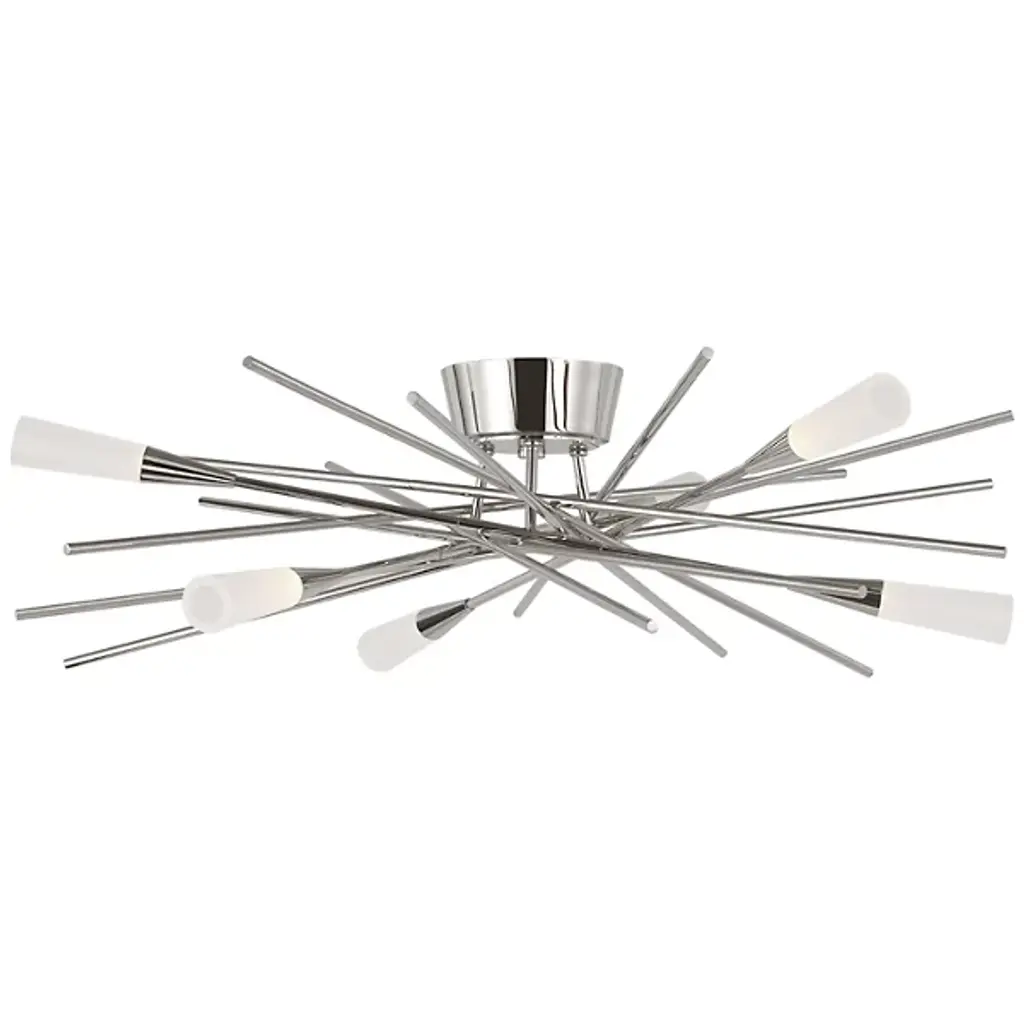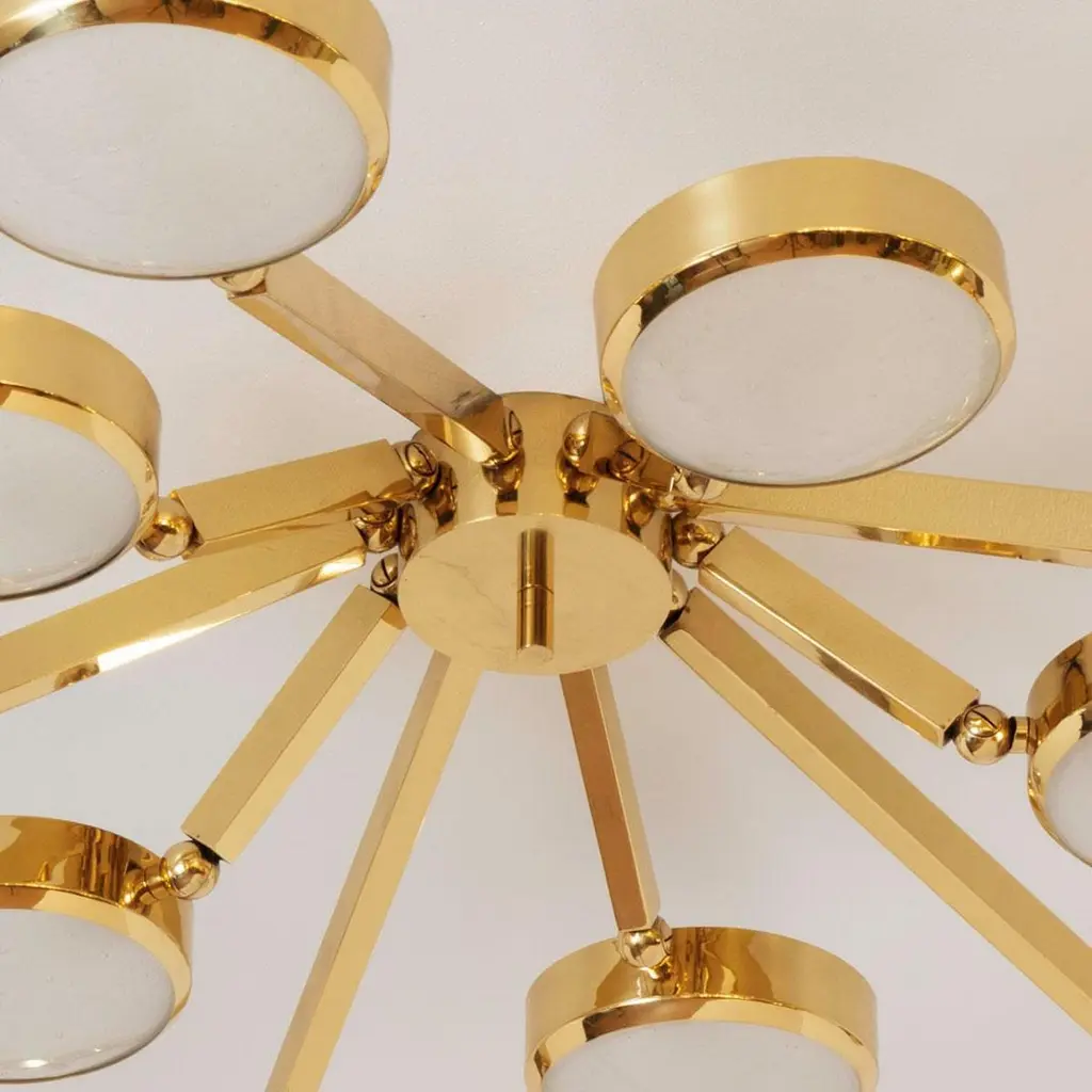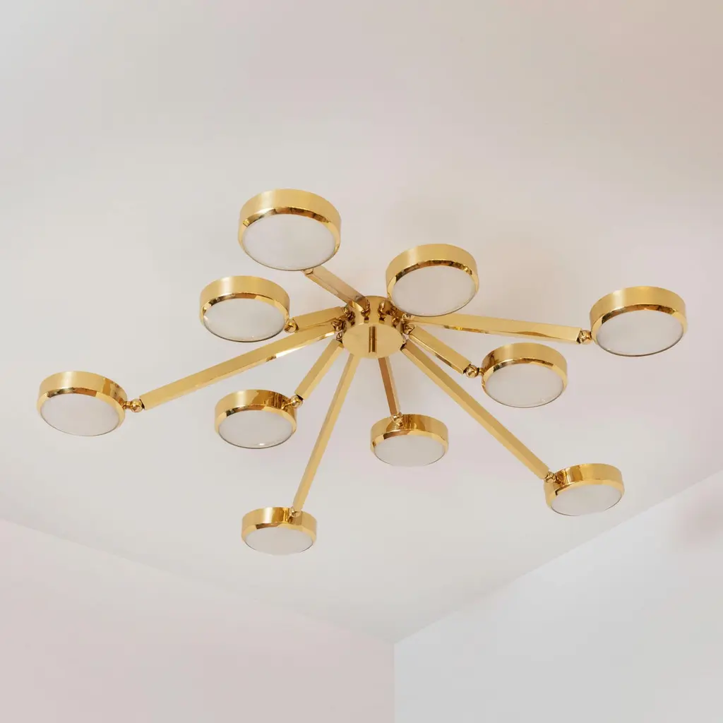 The Oculus ceiling light features an innovative articulating design that allows the ten arms to have a wide range of motion for endless configurations. The brass constructed frame can be flush mounted or installed on a stem.The first images show the fixture in our polished nickel finish with Murano Bubble glass -subsequent pictures show it in a selection of alternative finishes. Starting at $ 12,400 for standard finishes.Starting at $ 13,500 for premium finishes.Customization Options:Each fixture is hand crafted in Italy and can be customized in size, layout and number of shades. Available in any of our 10 finishes and 8 enamel colors. Compatible with our Murano bubble glass, Murano frosted glass and carved glasses.Lead Time: 10-12 weeks plus shipping.Diameter: 52”Height: 10”. Overall height can be adjusted as needed. 2.5” minimum heightElectrical: Ten E12 40W incandescent or 75W LED equivalentModel#: LTZ581/B