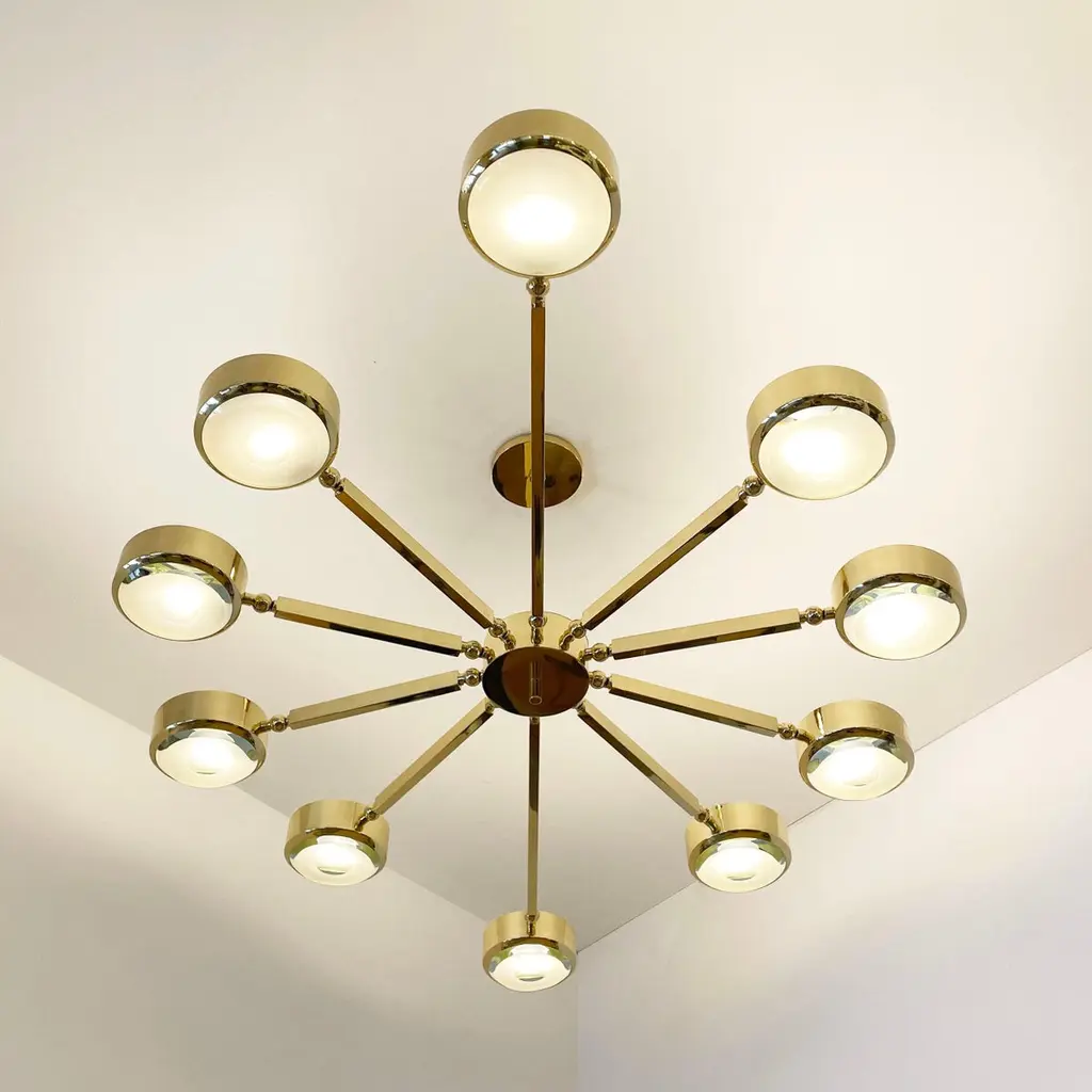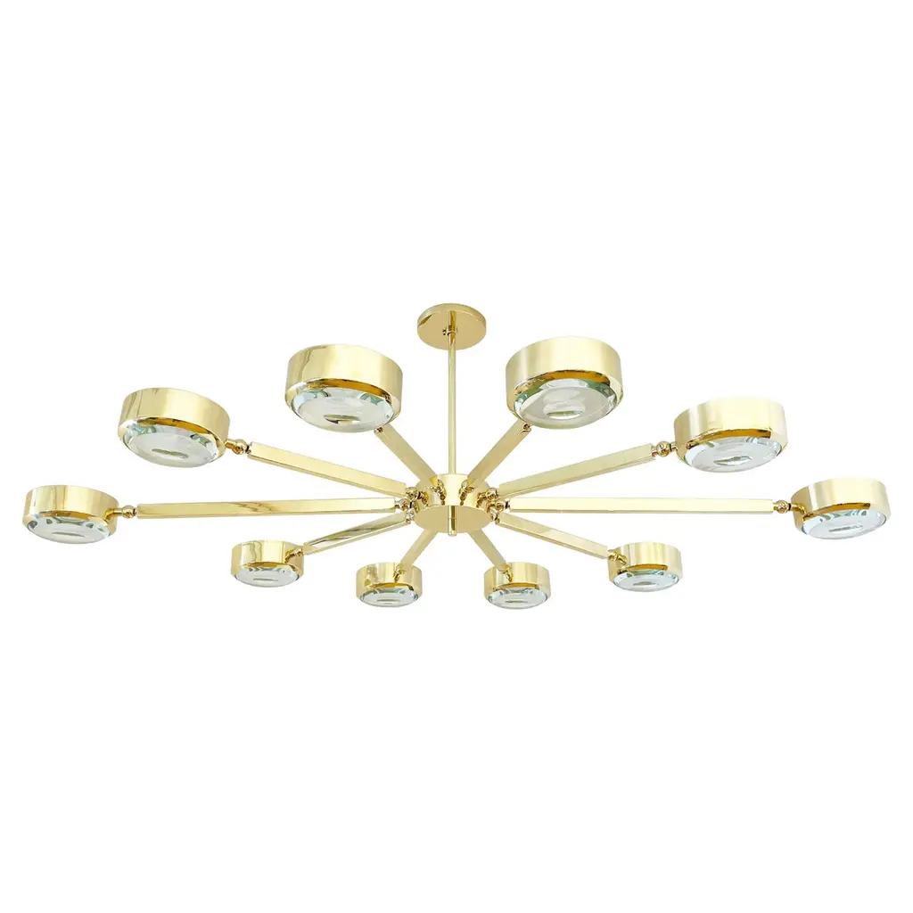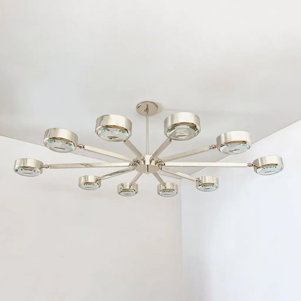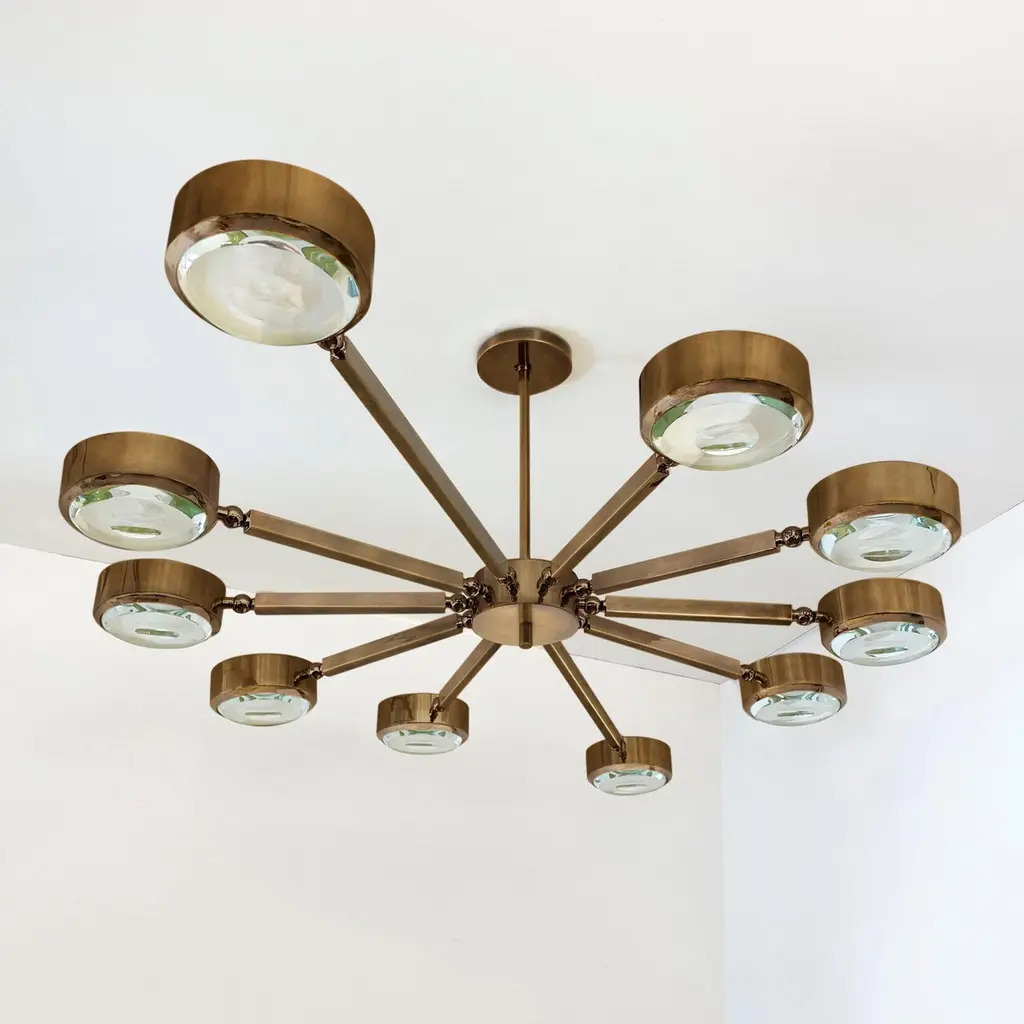 The Oculus ceiling light features an innovative articulating design that allows the ten arms to have a wide range of motion for endless configurations. The brass constructed frame can be flush mounted or installed on a stem and can be fitted with either our carved glass made in Milan or our blown glass made in Murano. This version has an oval footprint which makes it ideal for elongated spaces and over dining tables (The standard version has a round layout). The first images show the fixture in Bronzo Nuvolato (bronze) with clear carved glass -subsequent pictures show it in a selection of alternative finishes. Starting at $17,400 in standard finishes.Starting at $18,900 in Premium finishes.Customization options: Each fixture is hand crafted in Italy and can be customized in size, layout and number of shades. Available in any of our 10 finishes and 8 enamel colors. Compatible with our carved glasses, Murano bubble glass and Murano frosted glass.Lead Time: 10-12 weeks plus shipping.Measures: Width: 60”Depth: 40”Height: 15”. Overall height can be adjusted as needed. 2.5” minimum heightElectrical: Ten E12 40W incandescent or 75W LED equivalentModel#: LTZ581/O.