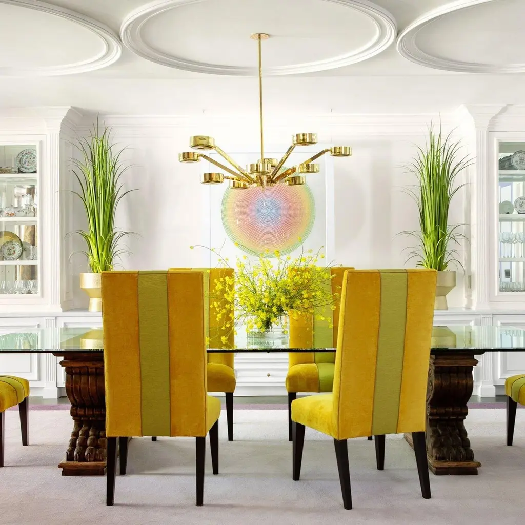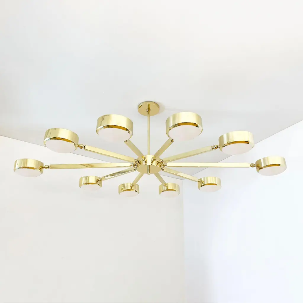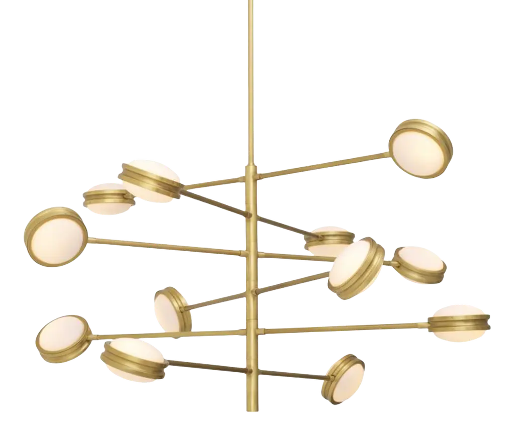 The Oculus ceiling light features an innovative articulating design that allows the ten arms to have a wide range of motion for endless configurations. The brass constructed frame can be flush mounted or installed on a stem and can be fitted with either our carved glass made in Milan or our blown glass made in Murano. This version has an oval footprint which makes it ideal for elongated spaces and over dining tables (The standard version has a round layout). Shown in polished brass and fitted with our Murano bubble glass.Starting at $ 12,400 for standard finishes.Starting at $ 13,500 for premium finishes.Customization Options:Each fixture is hand crafted in Italy and can be customized in size, layout and number of shades. Available in any of our 10 finishes and 8 enamel colors. Compatible with our Murano bubble glass, Murano frosted glass and carved glasses.Lead Time: 10-12 weeks plus shipping.Measures: Width: 60”Depth: 40”Height: 15”. Overall height can be adjusted as needed. 2.5” minimum heightElectrical: Ten E12 40W incandescent or 75W LED equivalentModel#: LTZ581/O.