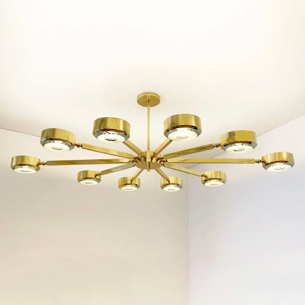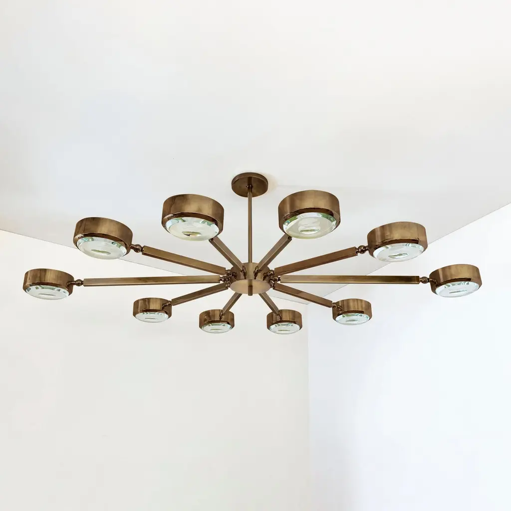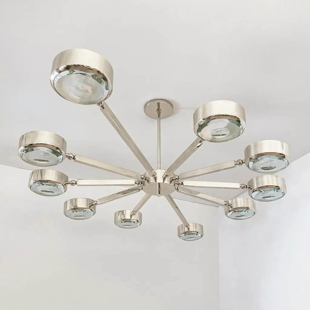 The Oculus ceiling light features an innovative articulating design that allows the ten arms to have a wide range of motion for endless configurations. The brass constructed frame can be flush mounted or installed on a stem and can be fitted with either our carved glass made in Milan or our blown glass made in Murano. This version has an oval footprint which makes it ideal for elongated spaces and over dining tables (The standard version has a round layout). The first images show the fixture in polished nickel with clear carved glass -subsequent pictures show it in a selection of alternative finishes. Starting at $17,400 in standard finishes.Starting at $18,900 in Premium finishes.Customization options: Each fixture is hand crafted in Italy and can be customized in size, layout and number of shades. Available in any of our 10 finishes and 8 enamel colors. Compatible with our carved glasses, Murano bubble glass and Murano frosted glass.Lead Time: 10-12 weeks plus shipping.Measures: Width: 60”Depth: 40”Height: 15”. Overall height can be adjusted as needed. 2.5” minimum heightElectrical: Ten E12 40W incandescent or 75W LED equivalentModel#: LTZ581/O.