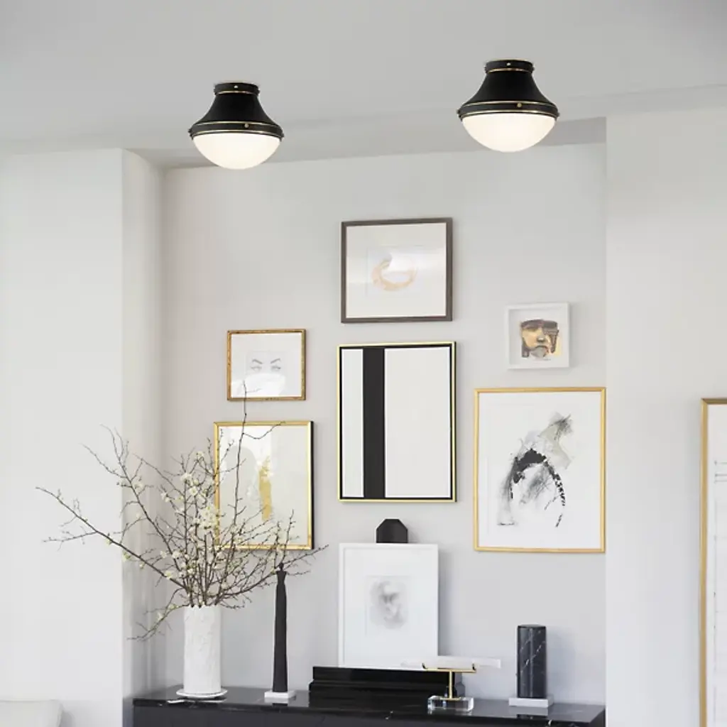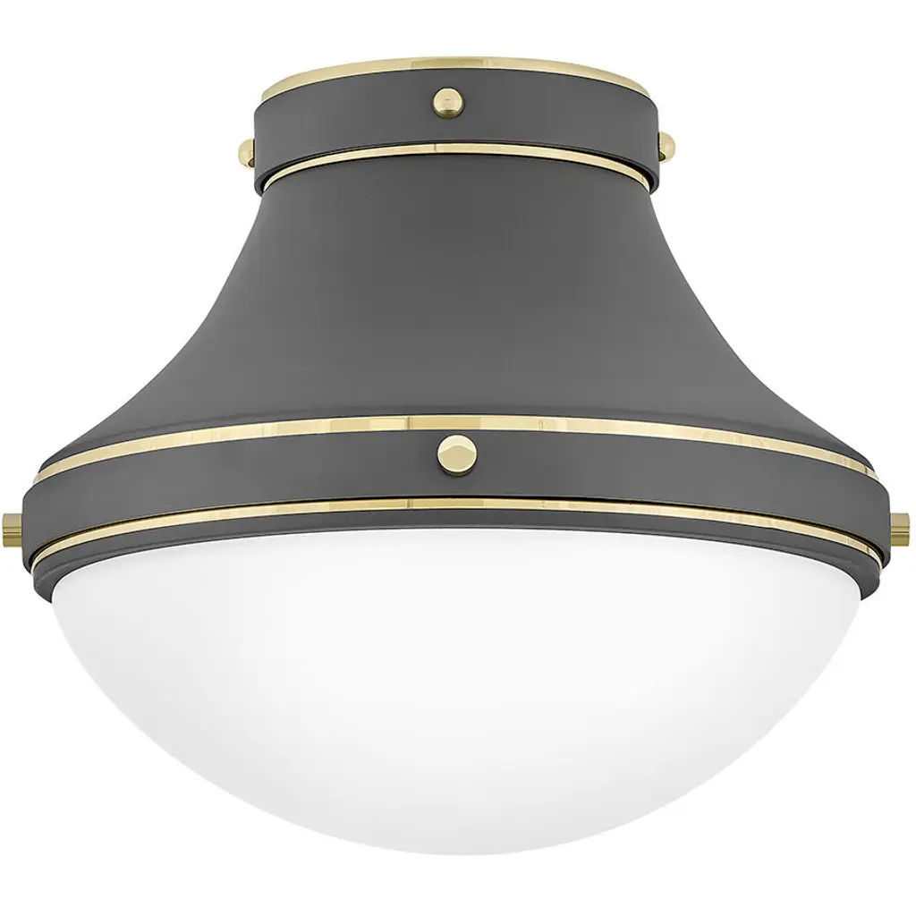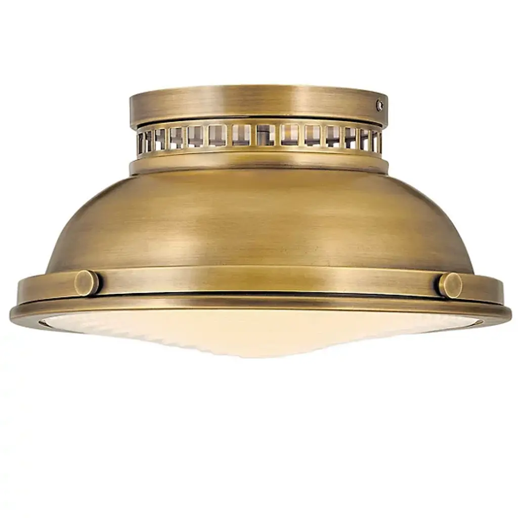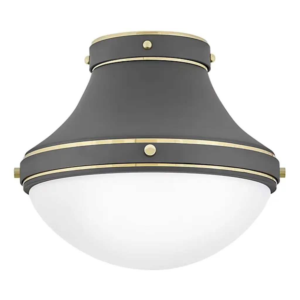 Dot your nooks, rooms, or hallways with the light-glazed curves of the Oliver Flushmount from Hinkley Lighting. The transitional design keeps its low profile with clear shape and neat decoration. It rests close to the ceiling for versatility in mounting. The piece swoops down in a smooth, tapering form. The edges of this form sport attractive protruding accents reminiscent of industrial fixtures. The bold finish of the metal hardware heightens the brightness of the etched glass dome resting below. The glass dishes out a glare-free light that evenly casts below.