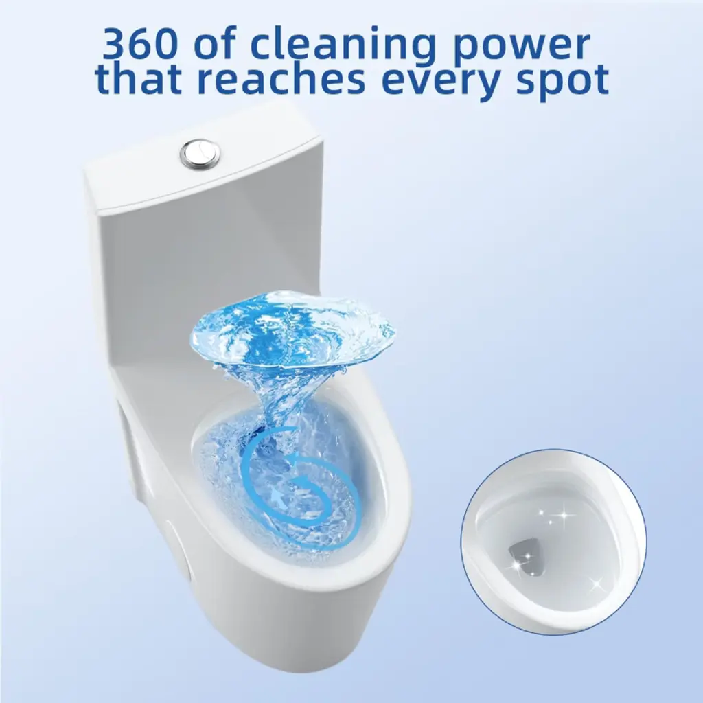 1.Powerful & Efficient 1.28 GPF Flush System Experience exceptional performance with every flush. This toilet features an advanced flushing system that delivers a strong, forceful washdown while using only 1.28 gallons per flush (GPF). This powerful action effectively clears the bowl, helping to prevent clogs and reduce water consumption, which can lead to significant savings on your water bills. 2.Sleek One-Piece Design for Easy Cleaning Enjoy a streamlined, hygienic bathroom centerpiece. The one-piece construction seamlessly integrates the tank and bowl, eliminating the hard-to-reach gap and crevices common in two-piece models. This creates a smooth, continuous surface that is not only visually modern but also remarkably easy to wipe down and keep clean, simplifying your maintenance routine. 3.Quiet-Close Seat with Quick-Release Hinge Say goodbye to loud, slamming toilet seats. The included premium seat features a soft-closing mechanism that gently lowers the lid and seat silently. Additionally, the quick-release hinges allow you to detach the entire seat effortlessly without tools for thorough cleaning, ensuring both convenience and long-term, rattle-free stability. 4.Comfort Height Elongated Bowl Design Designed with user comfort in mind, the elongated bowl provides extra room and support compared to standard round-front bowls. This ergonomic shape offers added comfort for users of all ages. The design is also compact, ensuring it fits comfortably in most bathroom layouts without sacrificing the premium comfort of an elongated style. 5.Durable, Sanitary Glazed Ceramic Construction Built to last from high-quality, industrial-grade ceramic with a glossy glazed finish. This material is exceptionally durable, resistant to scratches, fading, and chemicals. The non-porous, stain-resistant surface ensures easy cleaning and maintains its brilliant white appearance for years, guaranteeing hygiene and durability. Specifications: