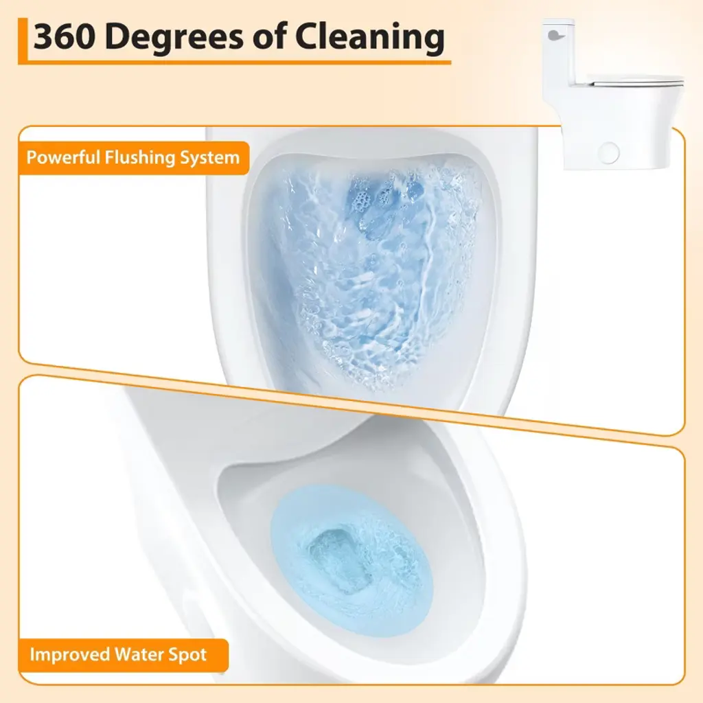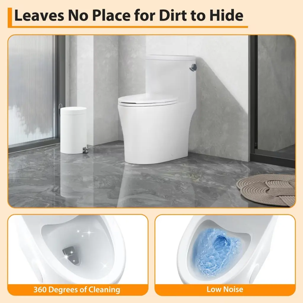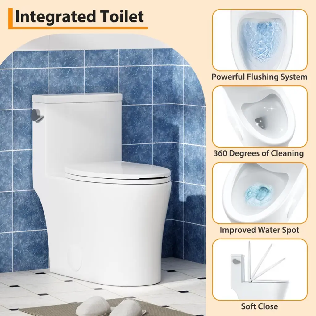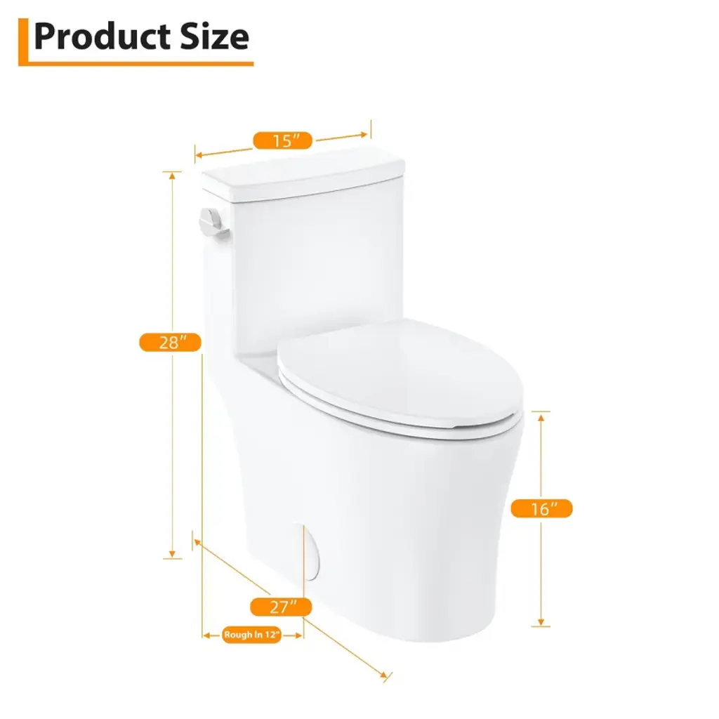 1.Powerful & Efficient 1.28 GPF Flush System Experience exceptional performance with every flush. This toilet features an advanced flushing system that delivers a strong, forceful washdown while using only 1.28 gallons per flush (GPF). This powerful action effectively clears the bowl, helping to prevent clogs and reduce water consumption, which can lead to significant savings on your water bills. 2.Sleek One-Piece Design for Easy Cleaning Enjoy a streamlined, hygienic bathroom centerpiece. The one-piece construction seamlessly integrates the tank and bowl, eliminating the hard-to-reach gap and crevices common in two-piece models. This creates a smooth, continuous surface that is not only visually modern but also remarkably easy to wipe down and keep clean, simplifying your maintenance routine. 3.Quiet-Close Seat with Quick-Release Hinge Say goodbye to loud, slamming toilet seats. The included premium seat features a soft-closing mechanism that gently lowers the lid and seat silently. Additionally, the quick-release hinges allow you to detach the entire seat effortlessly without tools for thorough cleaning, ensuring both convenience and long-term, rattle-free stability. 4.Comfort Height Elongated Bowl Design Designed with user comfort in mind, the elongated bowl provides extra room and support compared to standard round-front bowls. This ergonomic shape offers added comfort for users of all ages. The design is also compact, ensuring it fits comfortably in most bathroom layouts without sacrificing the premium comfort of an elongated style. 5.Durable, Sanitary Glazed Ceramic Construction Built to last from high-quality, industrial-grade ceramic with a glossy glazed finish. This material is exceptionally durable, resistant to scratches, fading, and chemicals. The non-porous, stain-resistant surface ensures easy cleaning and maintains its brilliant white appearance for years, guaranteeing hygiene and durability. Specifications: