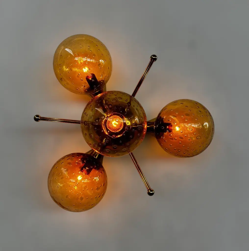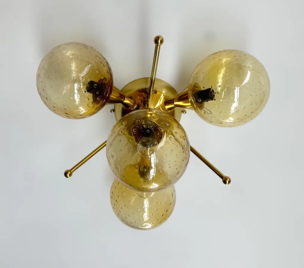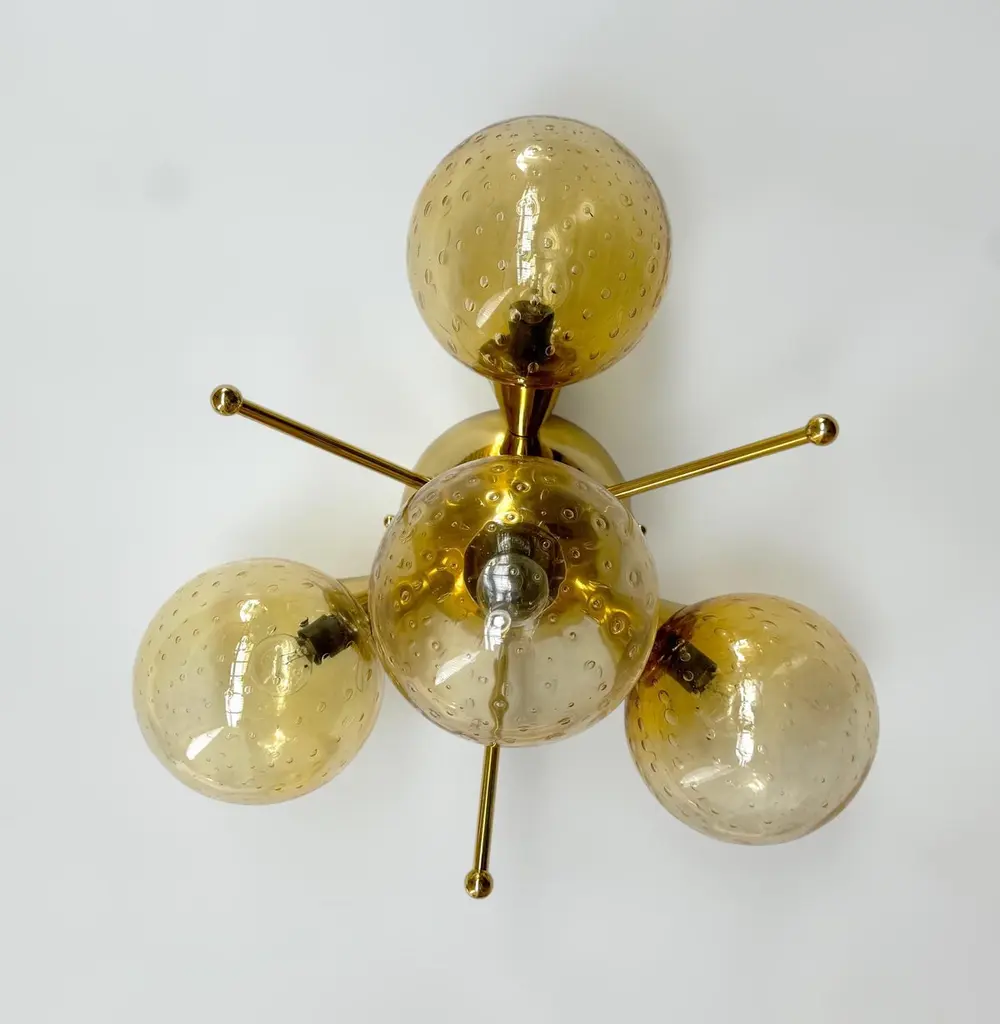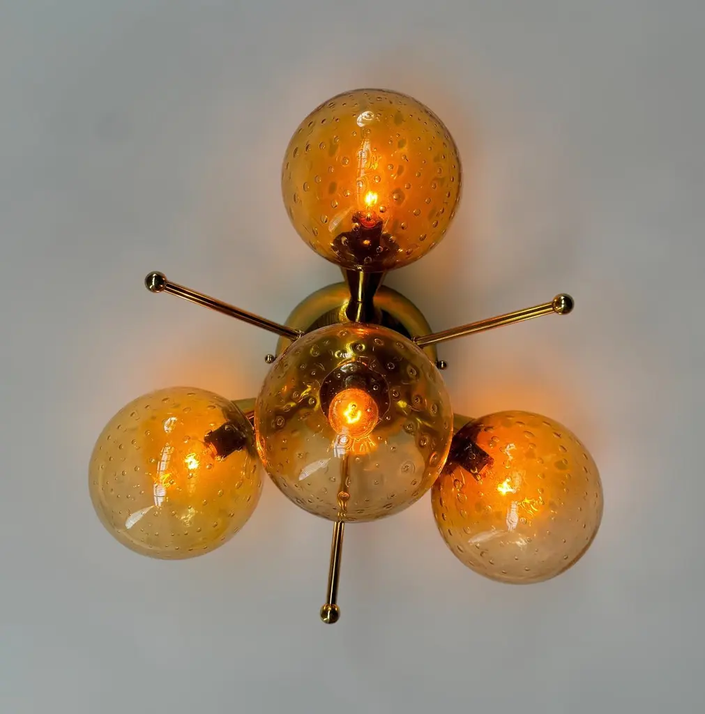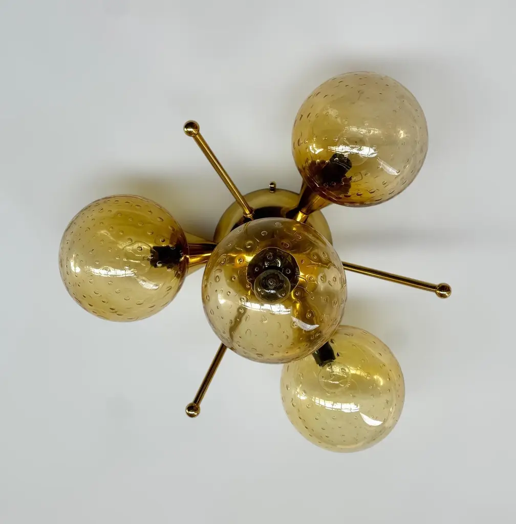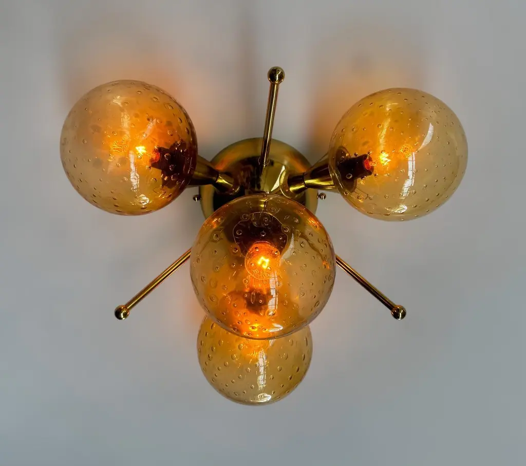 Italian flush mount with 4 Murano glass globes mounted on solid brass frame in lacquered polished brass finishDesigned by Fabio Bergomi / Made in Italy4 lights / E12 or E14 type / max 40W eachDiameter: `18 inches / Height: 10 inchesOrder only / This item ships from ItalyOrder Reference #: FABIOLTD ORCHIDEA GLOBEThe listed price applies to all Brass finishes : Unlacquered Natural Brass, Unlacquered Polished Brass, Lacquered Polished Brass, Lacquered Satin BrassOther finishes available with upcharge of $200: Bronze, Polished Chrome, Satin Chrome, Polished Nickel, Satin Nickel, Polished Black Nickel, Satin Black Nickel, Polished Copper, Satin Copper