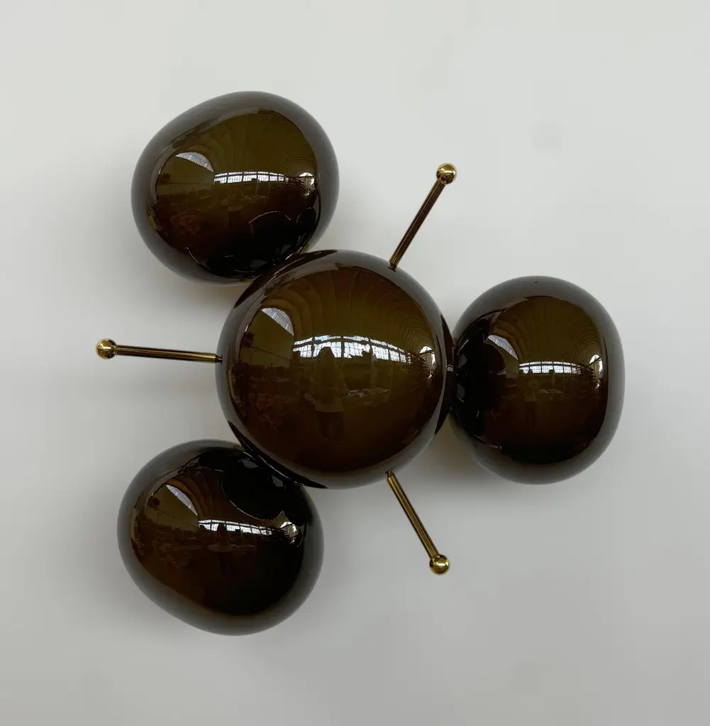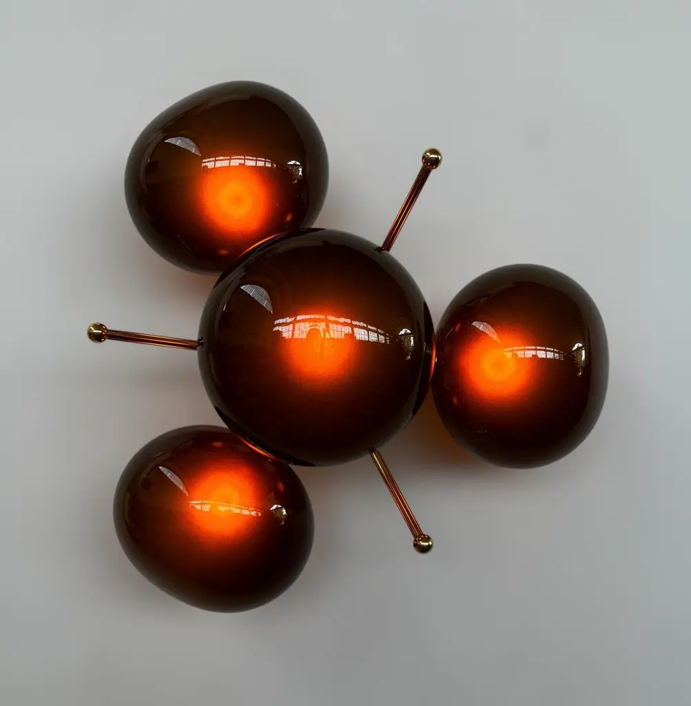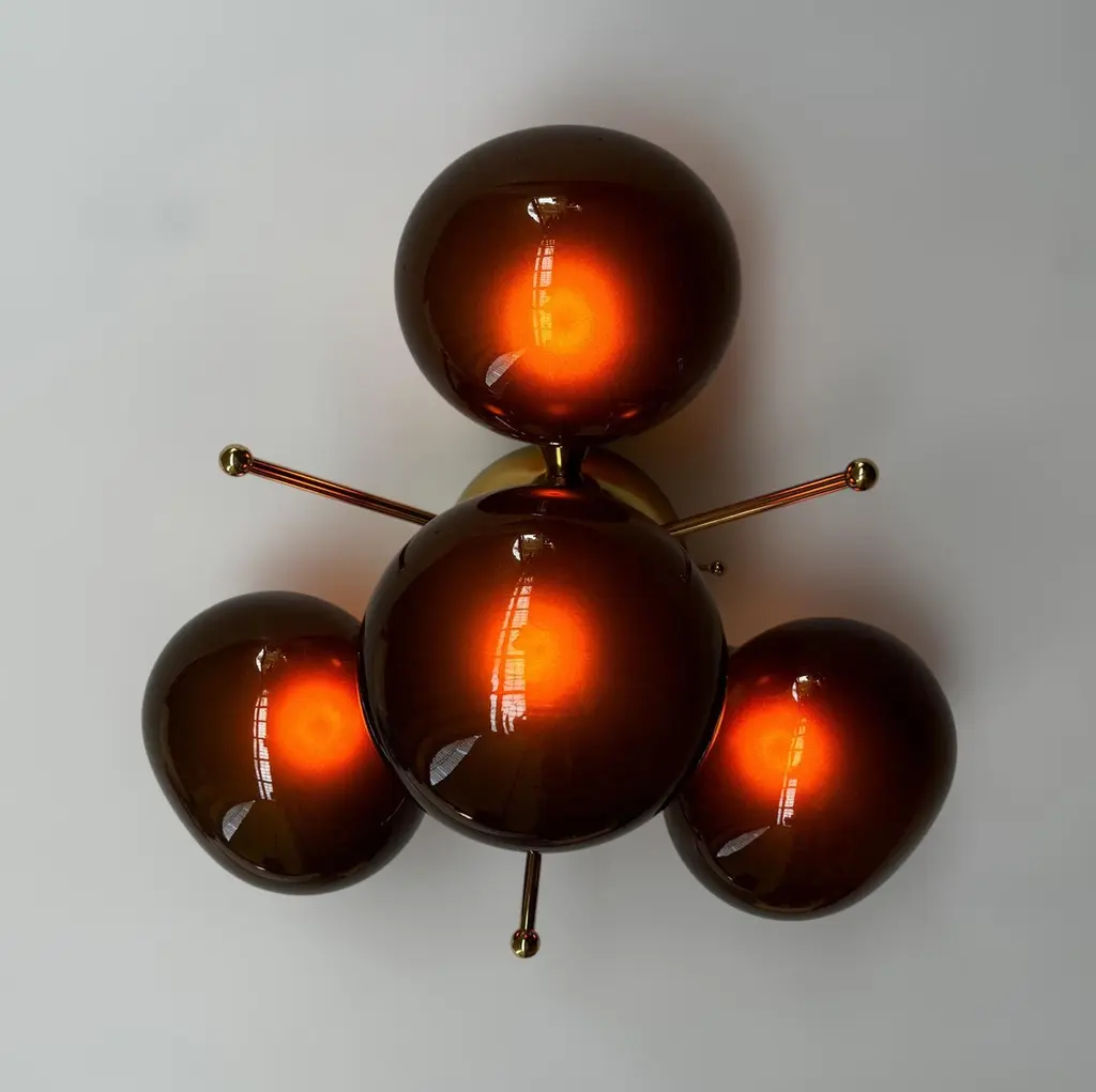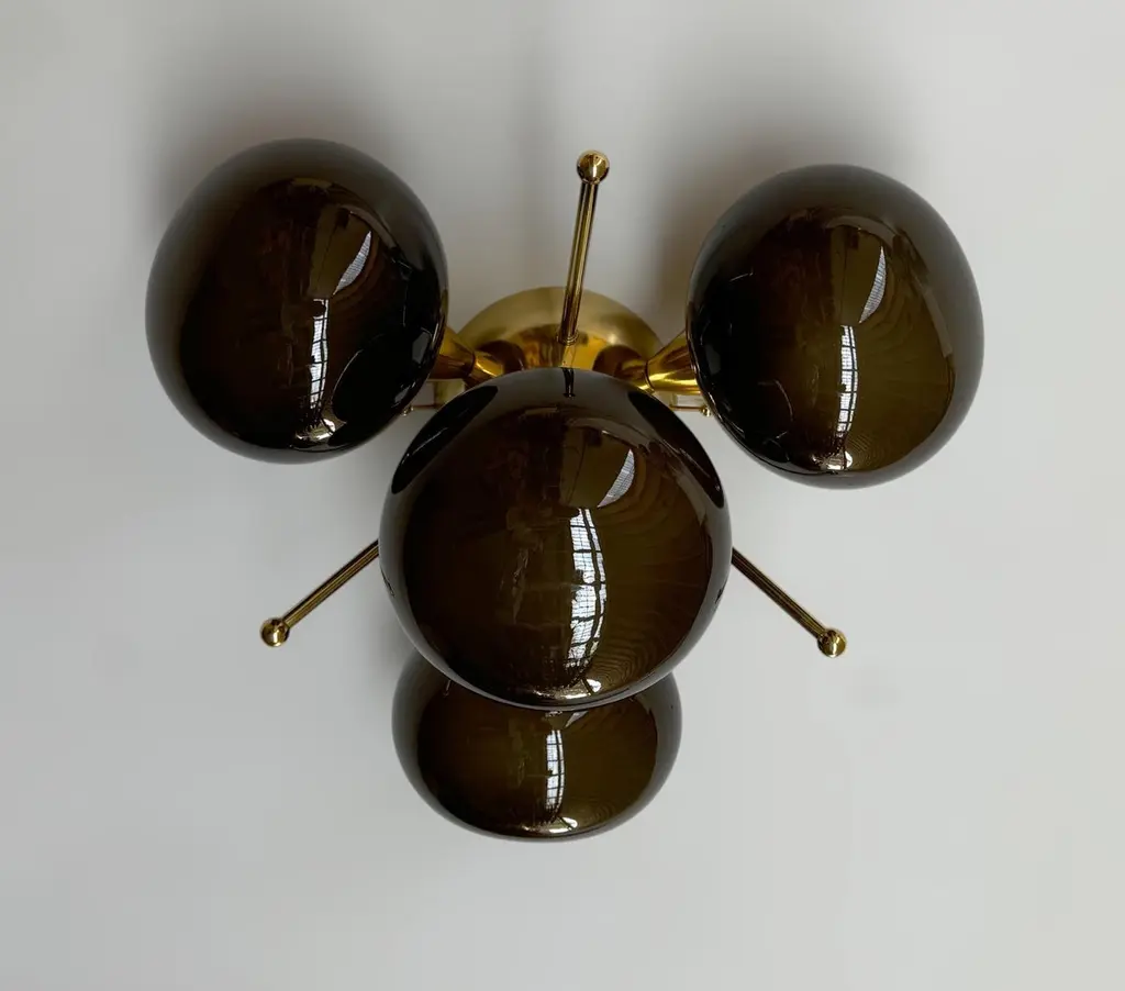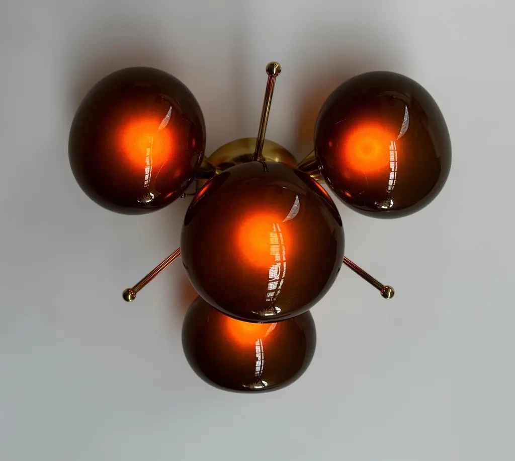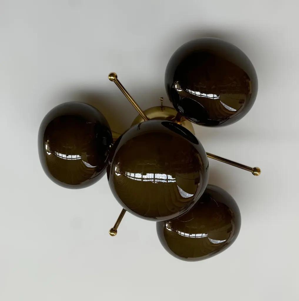 Italian flush mount with 4 pebble shaped Murano glass shades mounted on solid brass frame in lacquered polished brass finishDesigned by Fabio Bergomi / Made in Italy4 lights / E12 or E14 type / max 40W eachDiameter: `20 inches / Height: 10.5 inchesOrder only / This item ships from ItalyOrder Reference #: FABIOLTD ORCHIDEA PEBBLEThe listed price applies to all Brass finishes : Unlacquered Natural Brass, Unlacquered Polished Brass, Lacquered Polished Brass, Lacquered Satin BrassOther finishes available with upcharge of $200: Bronze, Polished Chrome, Satin Chrome, Polished Nickel, Satin Nickel, Polished Black Nickel, Satin Black Nickel, Polished Copper, Satin Copper