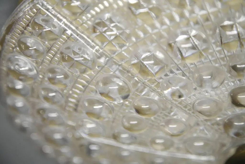 Orrefors Flush Mounts, Crystal and Brass,1960, Sweden in all vintage condition with five European candelabra sockets on a brass frame.The shade is a thick domed cast crystal with a smooth surface with bubble structure designed by Carl Fagerlund for Orrefors.A collection is available.