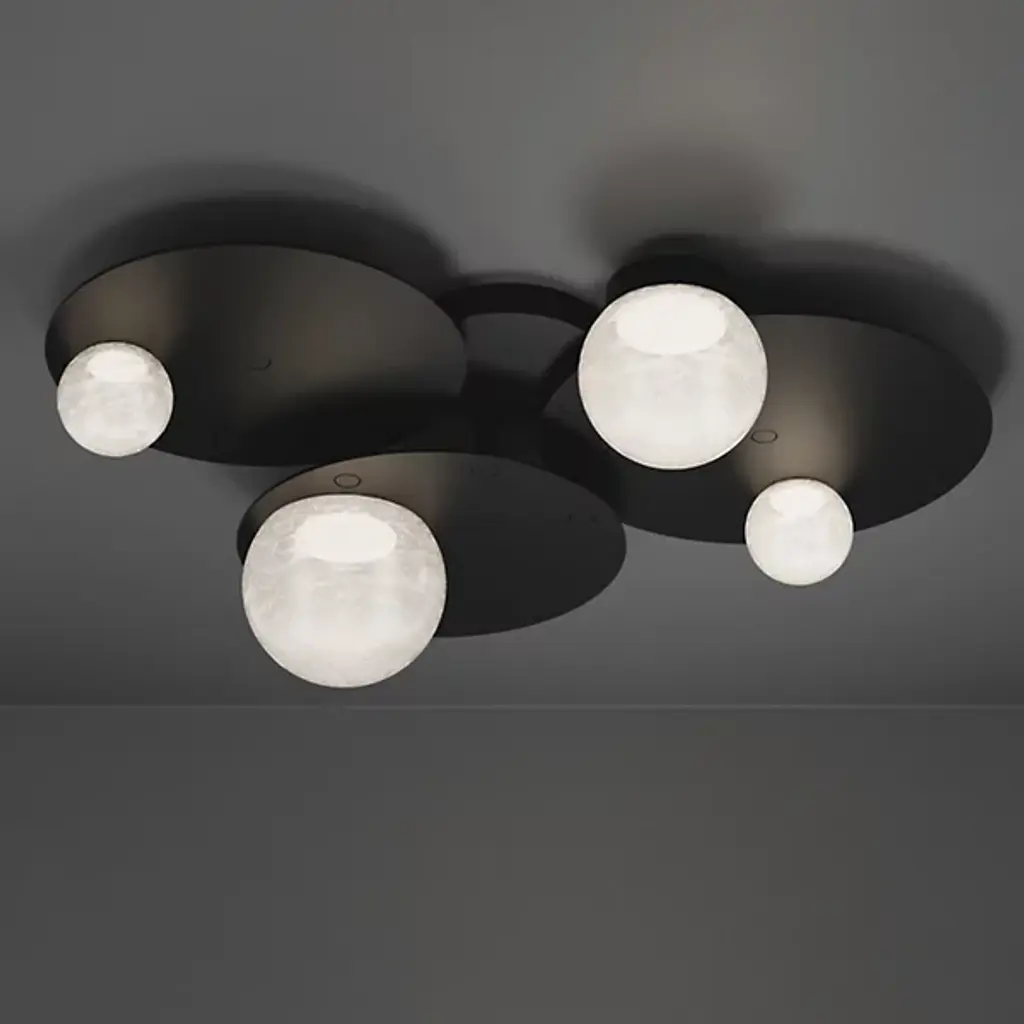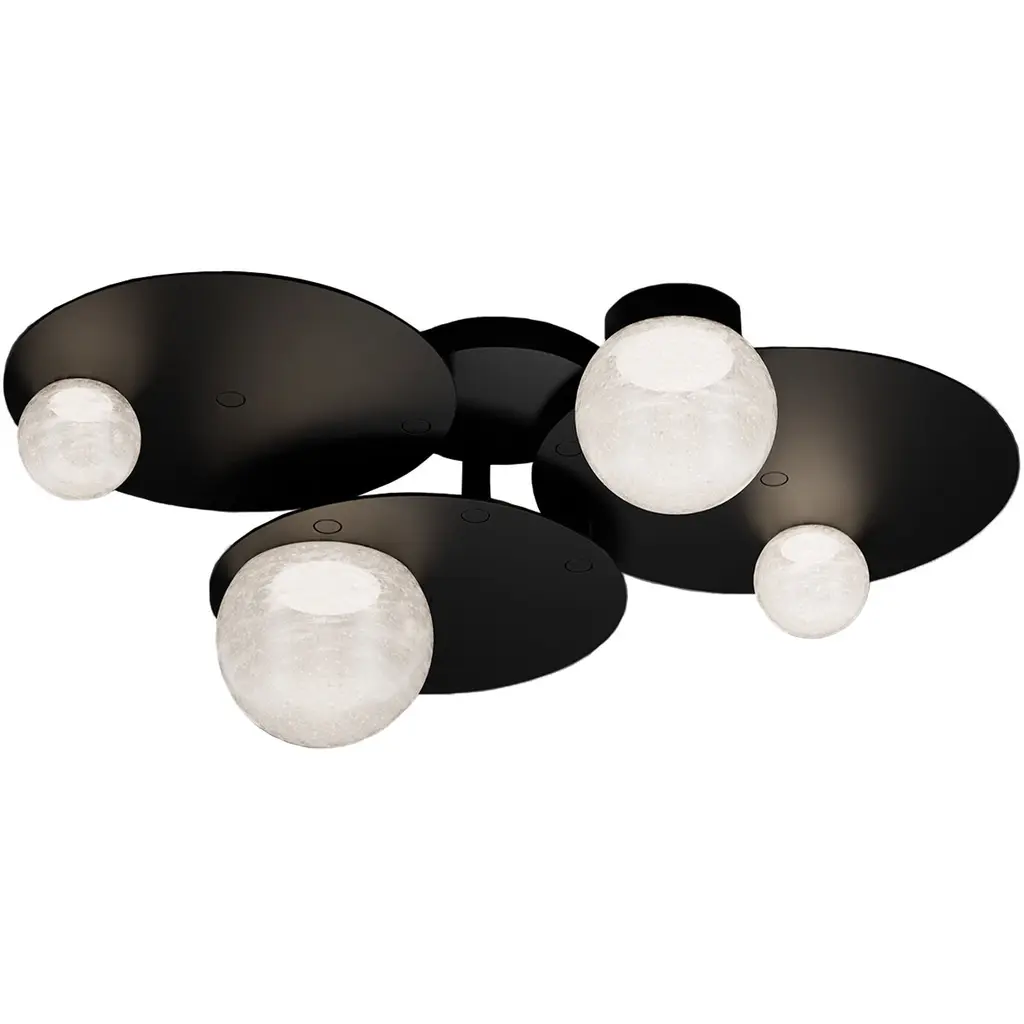 The Out Of This World LED Flushmount from Modern Forms scatters mouth-blown seedy glass orbs across flat aluminum ovals in an asymmetrical ceiling composition. Each glass sphere displays individual texture patterns created during the blowing process, while the oval plates provide contrasting smooth surfaces against the organic glass forms. Multiple globe shapes in varying proportions create depth and movement across the ceiling plane. Internal LEDs illuminate each glass element while the aluminum ovals serve as both mounting points and design counterpoints to the spherical forms.