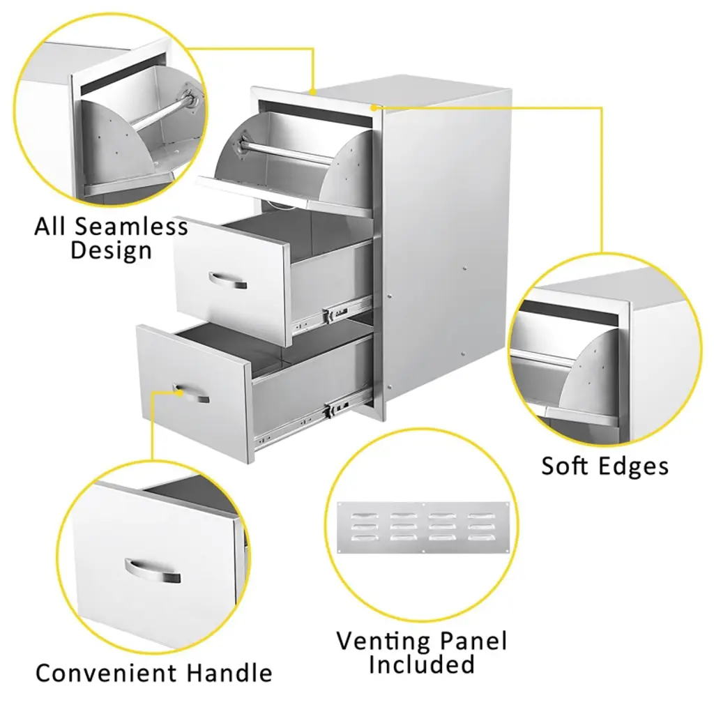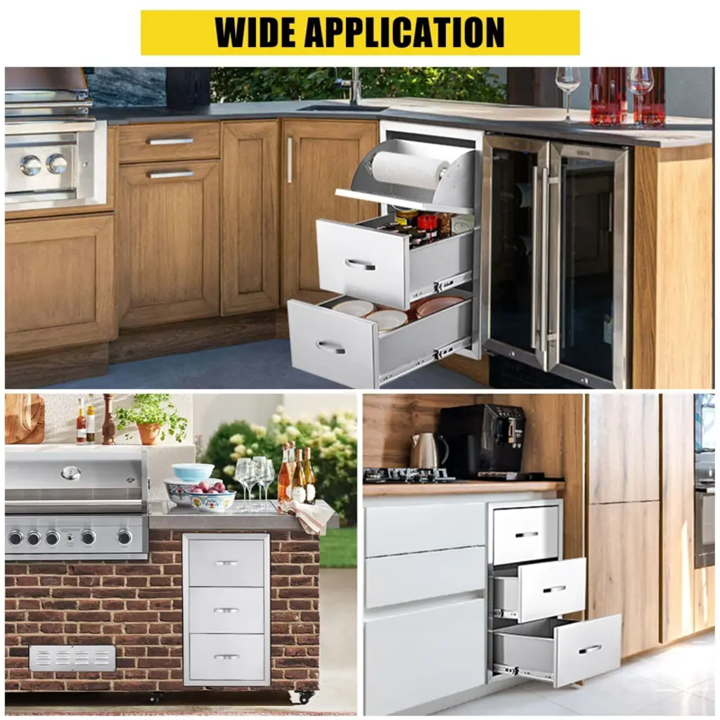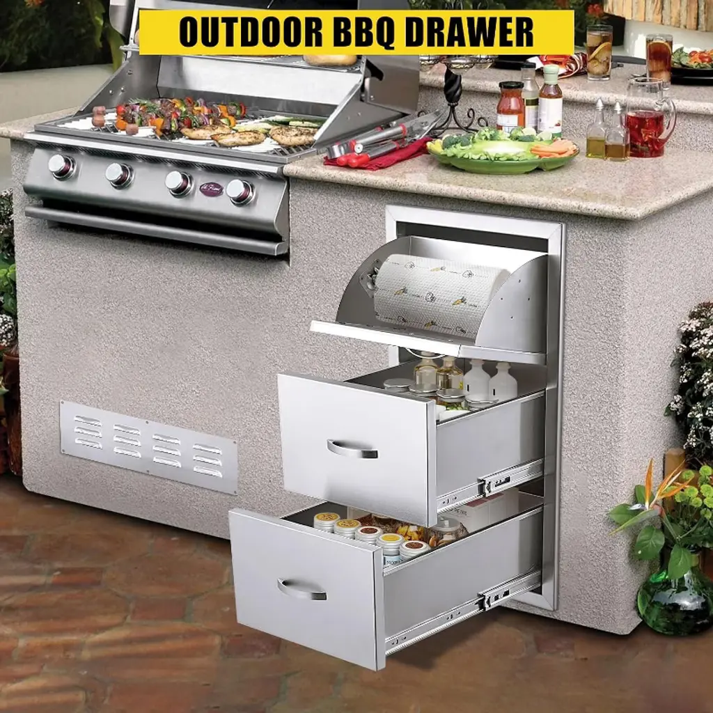 Durable Stainless Steel ConstructionCrafted from high-quality stainless steel, these outdoor kitchen drawers are built to endure the rigors of outdoor use. Resistant to rust, corrosion, and wear from sun, rain, and temperature fluctuations, they maintain their strength and appearance over time¡ªensuring long-lasting reliability for your outdoor cooking space.Weatherproof Design for All ConditionsEngineered as enclosed, weatherproof storage, these built-in drawers protect your BBQ tools, utensils, and accessories from the elements. Whether facing heavy rain, intense sunlight, or humidity, they keep contents dry and secure, making them a trustworthy addition to any outdoor kitchen or BBQ island.Efficient Organization with Built-in DividerThe integrated divider splits the drawer into dedicated sections, keeping grilling tools, tongs, brushes, and accessories neatly separated. This thoughtful design eliminates clutter, making it easy to find what you need quickly during cooking¡ªstreamlining your outdoor grilling experience and enhancing efficiency.Seamless Flush Mount InstallationDesigned for flush mount setup, these drawers blend smoothly into your BBQ island or outdoor kitchen, creating a sleek, cohesive look. The seamless integration enhances the overall aesthetic of your outdoor space, turning functional storage into a stylish design element that complements your setup.Versatile Storage for Grilling EssentialsPerfect for outdoor kitchens and BBQ islands, these drawers offer ample space to store all your grilling necessities. From small tools to larger accessories, they accommodate a range of items, ensuring everything you need for outdoor cooking is organized and within reach¡ªmaking them an essential addition for any grilling enthusiast.