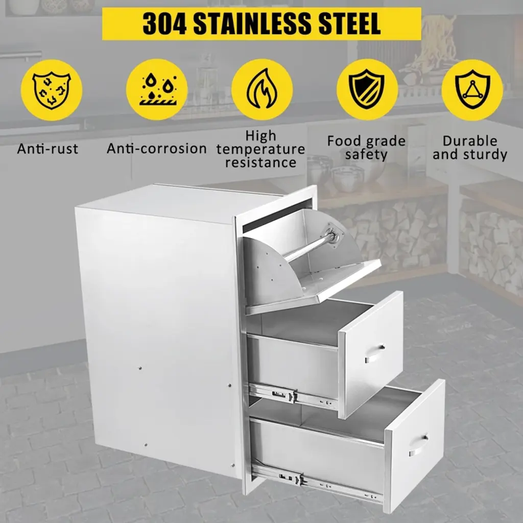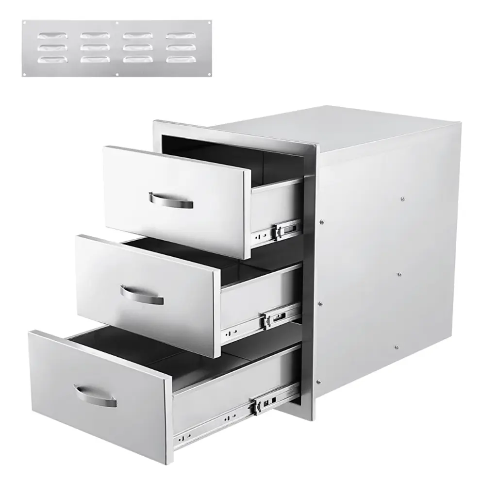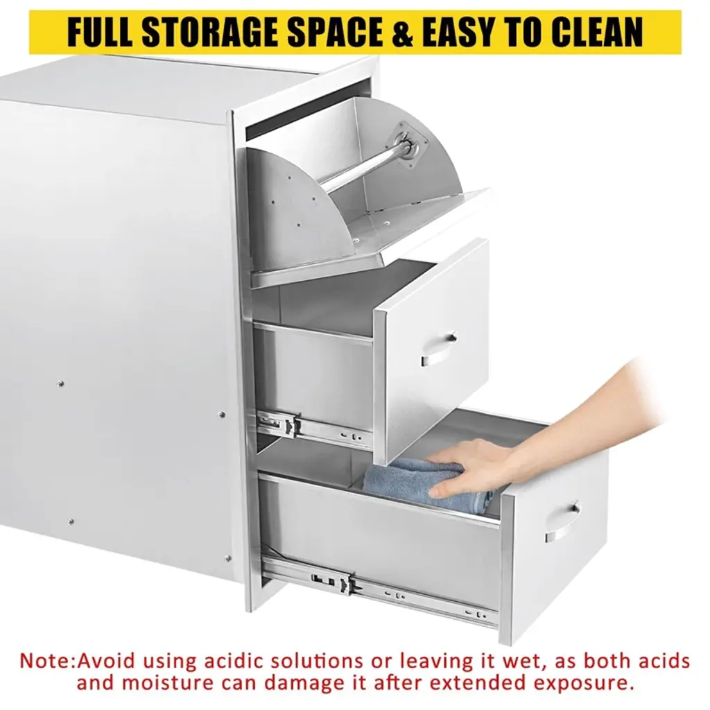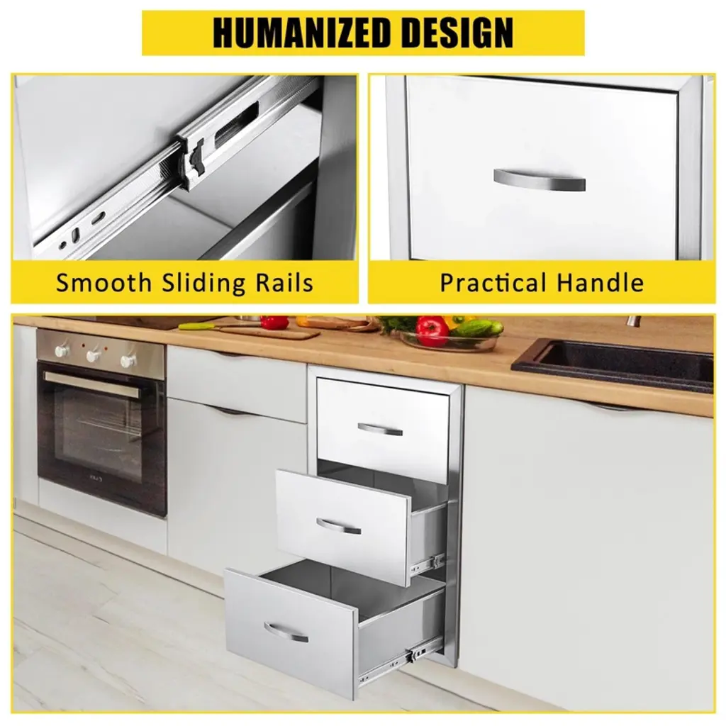 Durable Stainless Steel ConstructionCrafted from high-quality stainless steel, these outdoor kitchen drawers are built to endure the rigors of outdoor use. Resistant to rust, corrosion, and wear from sun, rain, and temperature fluctuations, they maintain their strength and appearance over time¡ªensuring long-lasting reliability for your outdoor cooking space.Weatherproof Design for All ConditionsEngineered as enclosed, weatherproof storage, these built-in drawers protect your BBQ tools, utensils, and accessories from the elements. Whether facing heavy rain, intense sunlight, or humidity, they keep contents dry and secure, making them a trustworthy addition to any outdoor kitchen or BBQ island.Efficient Organization with Built-in DividerThe integrated divider splits the drawer into dedicated sections, keeping grilling tools, tongs, brushes, and accessories neatly separated. This thoughtful design eliminates clutter, making it easy to find what you need quickly during cooking¡ªstreamlining your outdoor grilling experience and enhancing efficiency.Seamless Flush Mount InstallationDesigned for flush mount setup, these drawers blend smoothly into your BBQ island or outdoor kitchen, creating a sleek, cohesive look. The seamless integration enhances the overall aesthetic of your outdoor space, turning functional storage into a stylish design element that complements your setup.Versatile Storage for Grilling EssentialsPerfect for outdoor kitchens and BBQ islands, these drawers offer ample space to store all your grilling necessities. From small tools to larger accessories, they accommodate a range of items, ensuring everything you need for outdoor cooking is organized and within reach¡ªmaking them an essential addition for any grilling enthusiast.