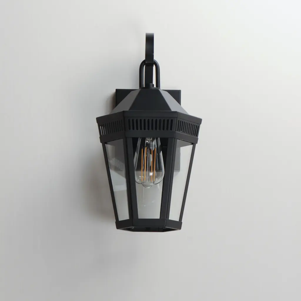Stately lanterns with perforated filigree along the hood casts a beautiful lighting effect. Finished in Matte Black, the collection is available in multiple sizes as well as flush mount, deck lantern, and two sizes of pendants.