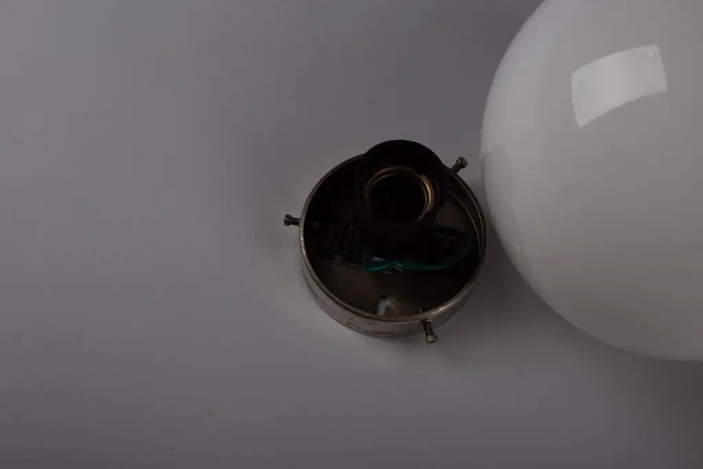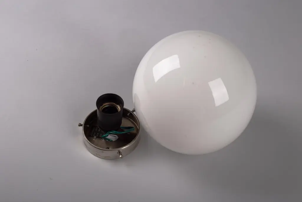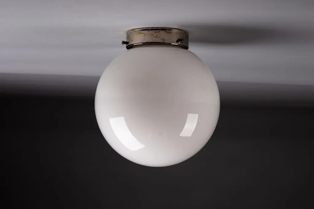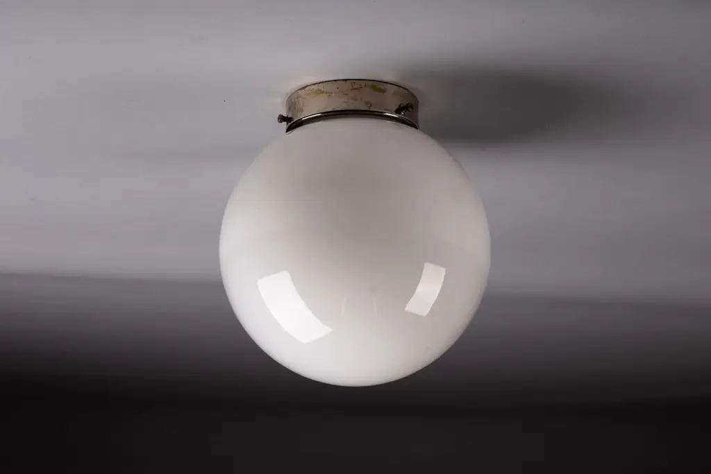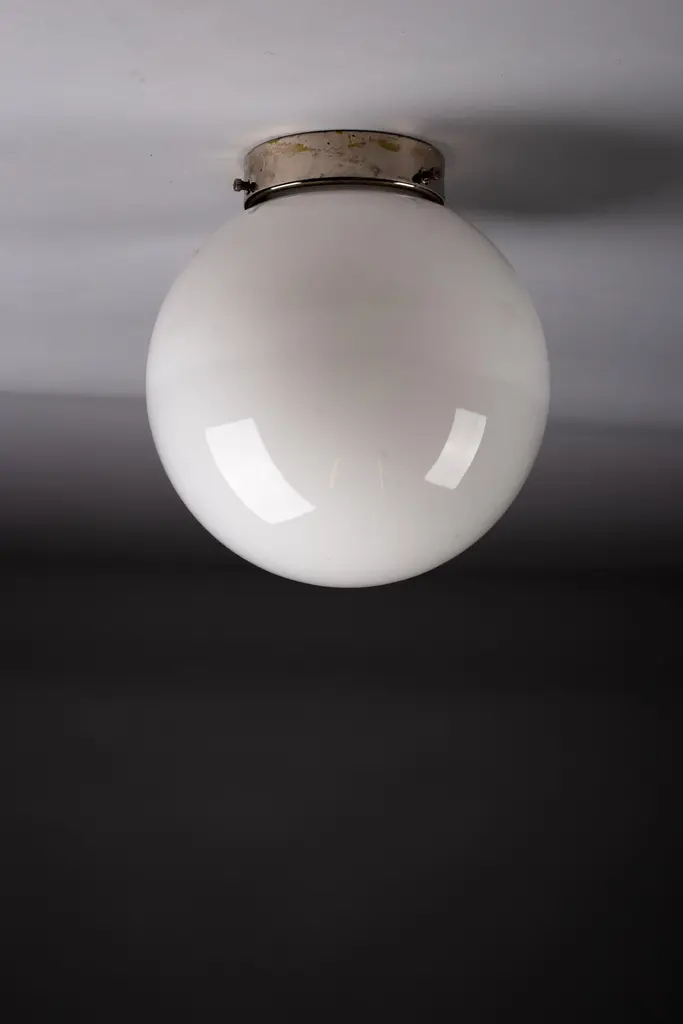 Illuminate your home with timeless elegance using this c. 1940's flush mount by renowned designer Paavo Tynell, crafted by Idman Oy, Finland. This opaline glass sphere flush mounts is perfect for your ceiling or wall, breathing classic Scandinavian design into your hallway with its subtle yet sophisticated presence. We celebrate the beauty of Scandinavian Vintage Design, ensuring each piece adds real value and authenticity to your décor. Discover the perfect fusion of form and function with this meticulously crafted fixtures, making your hallway a beacon of refined taste.