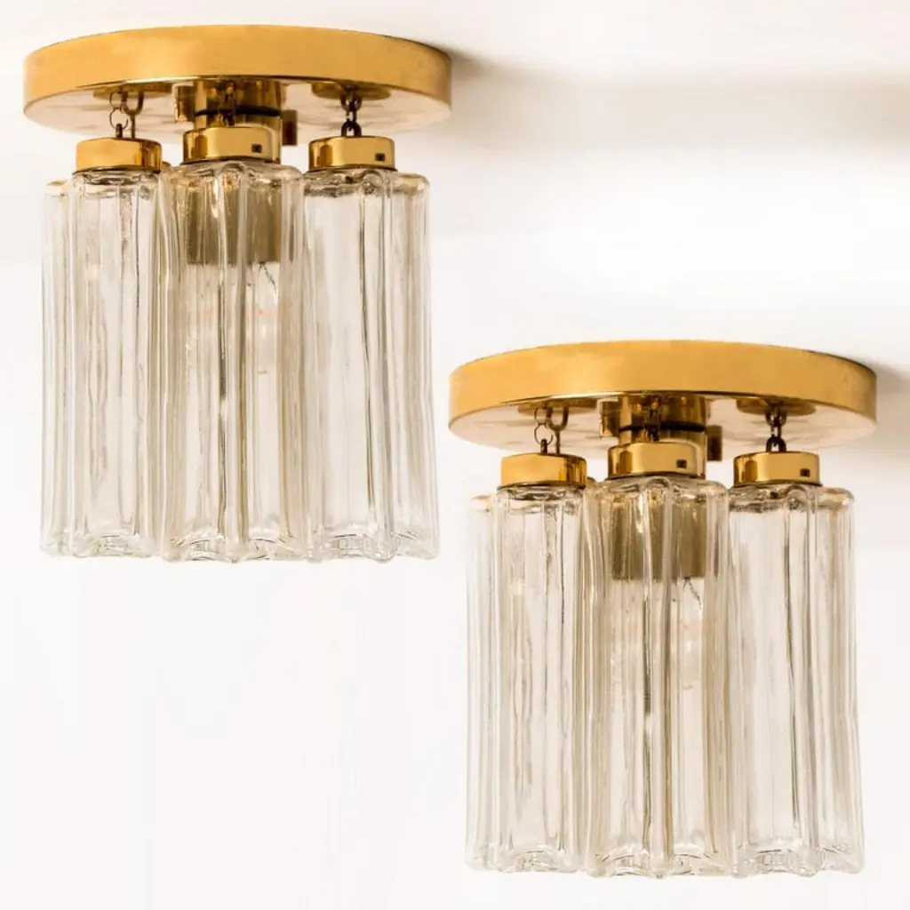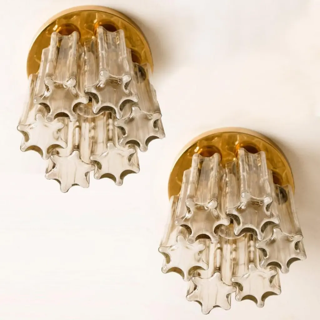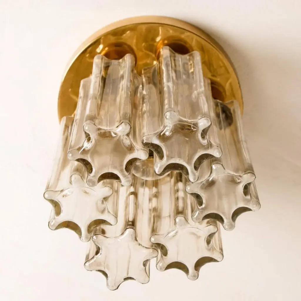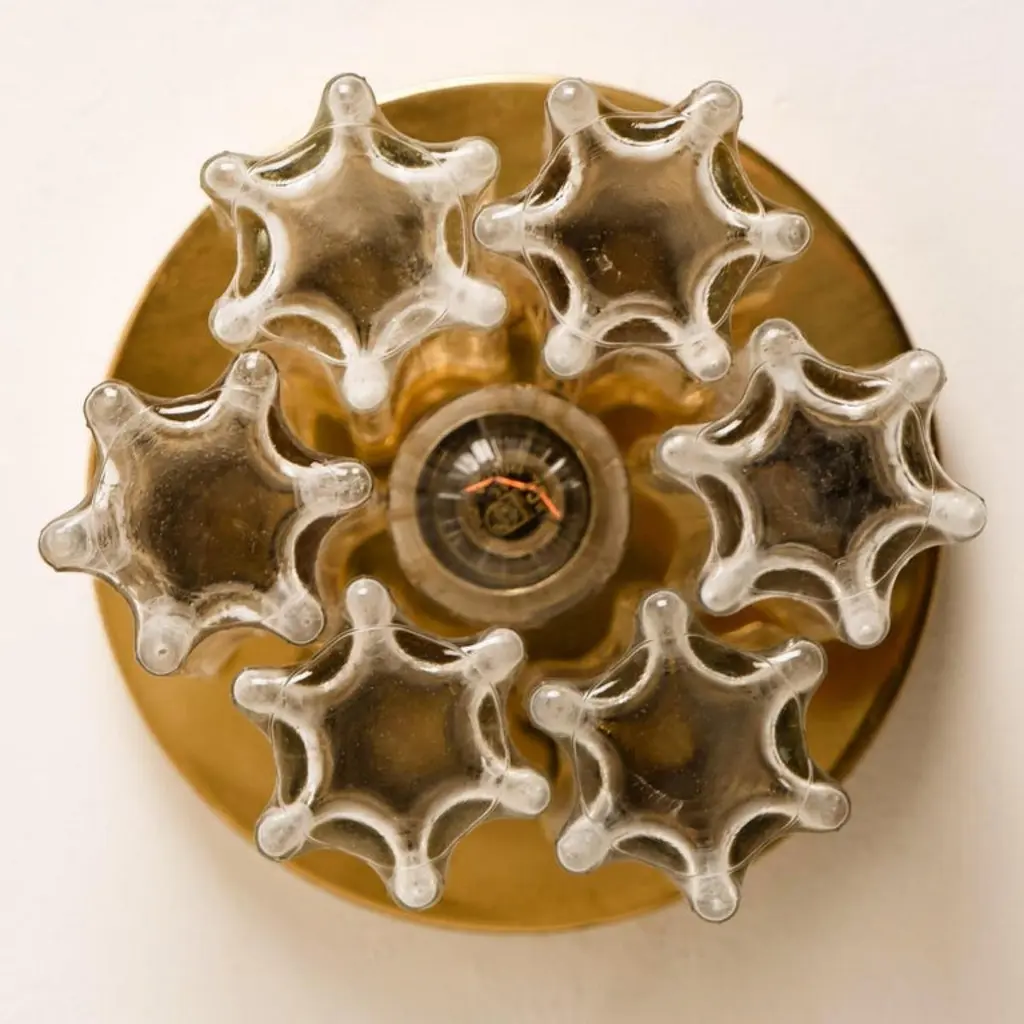 Each individual glass shade is column shaped with a six-sided star at the base, all of which are the same size. Together these sculptural forms add depth and reflection. Presently fitted with clear light bulbs but can take different shaped light bulbs to vary the look.Please notice the price is for the pair. They will be sold as a set as a pair or individually.Also larges sizes of the same model series available. Feel free to ask for additional informationFlush mount small (two on stock)H overall 9.8" x D 8.7" (H overall 25 cm x D 22 Cm)Heavy quality and in very good vintage condition. Cleaned, re-wired and ready to use. The light fixtures can be disassembled and the glass shades individually wrapped for easy transport. Each flush mount requires E27 standard light bulbs (Max 40W).