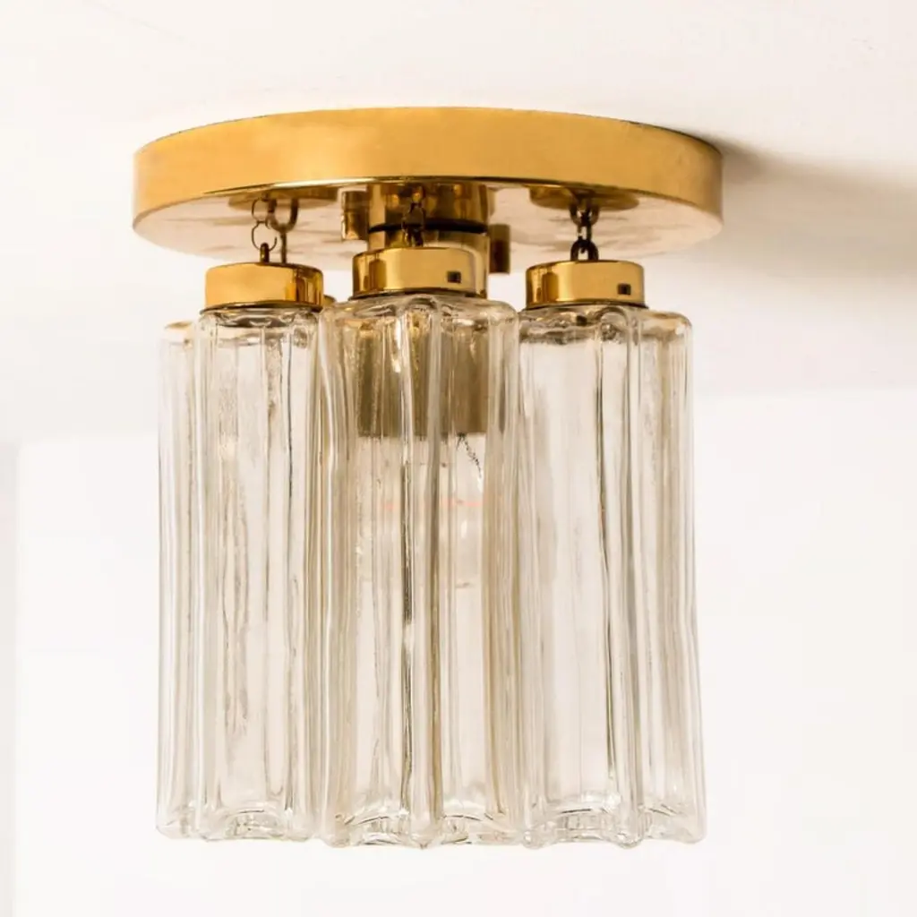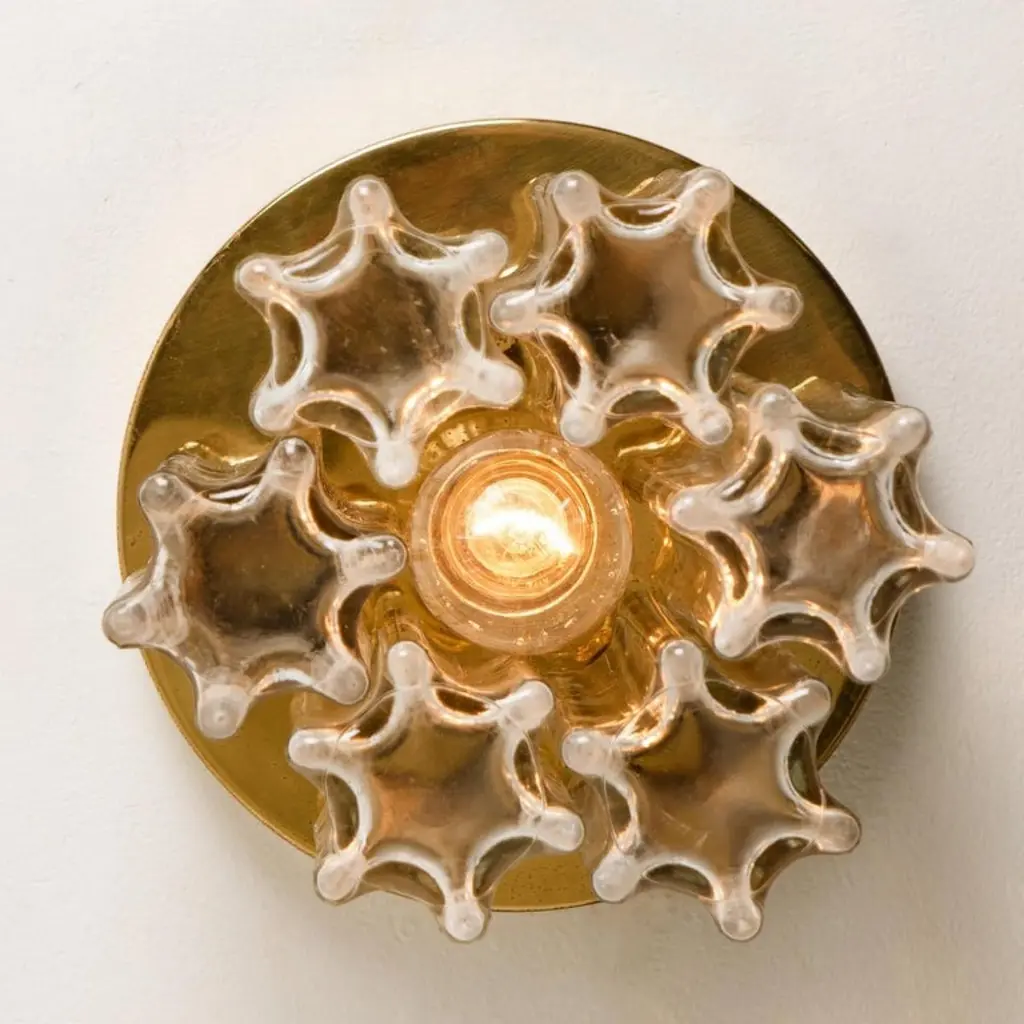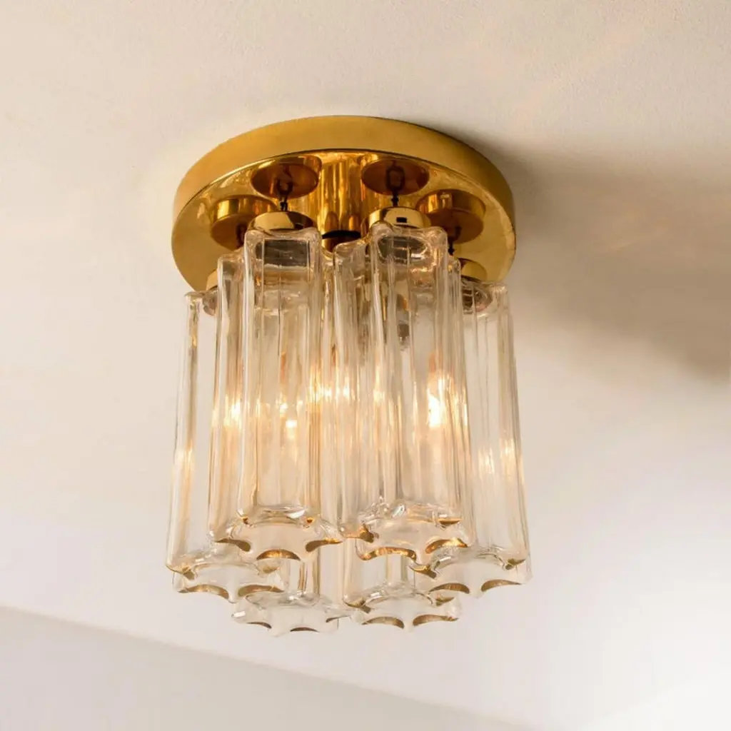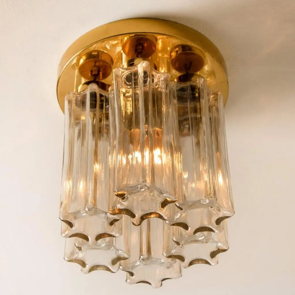 Each individual glass shade is column shaped with a six-sided star at the base, all of which are the same size. Together these sculptural forms add depth and reflection. Presently fitted with clear light bulbs but can take different shaped light bulbs to vary the look.Please notice the price is for the pair. They will be sold as a set as a pair or individually.Also larges sizes of the same model series available. Feel free to ask for additional informationFlush mount small (two on stock)H overall 9.8" x D 8.7" (H overall 25 cm x D 22 Cm)Heavy quality and in very good vintage condition. Cleaned, re-wired and ready to use. The light fixtures can be disassembled and the glass shades individually wrapped for easy transport. Each flush mount requires E27 standard light bulbs (Max 40W).