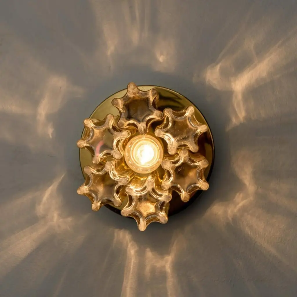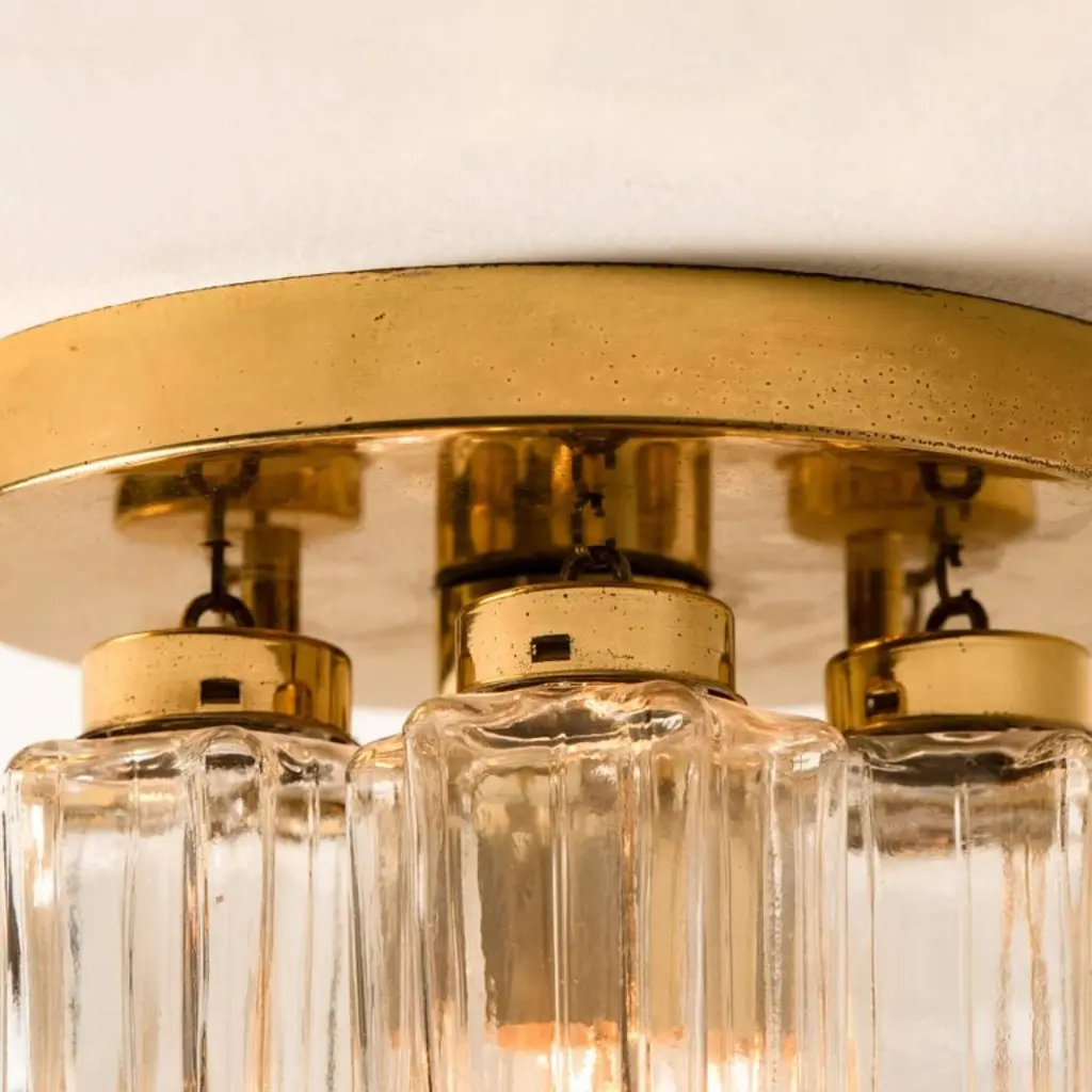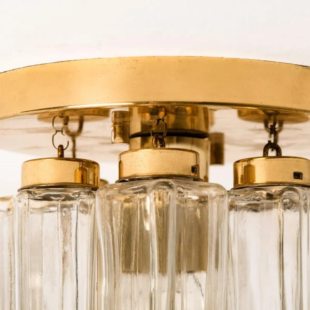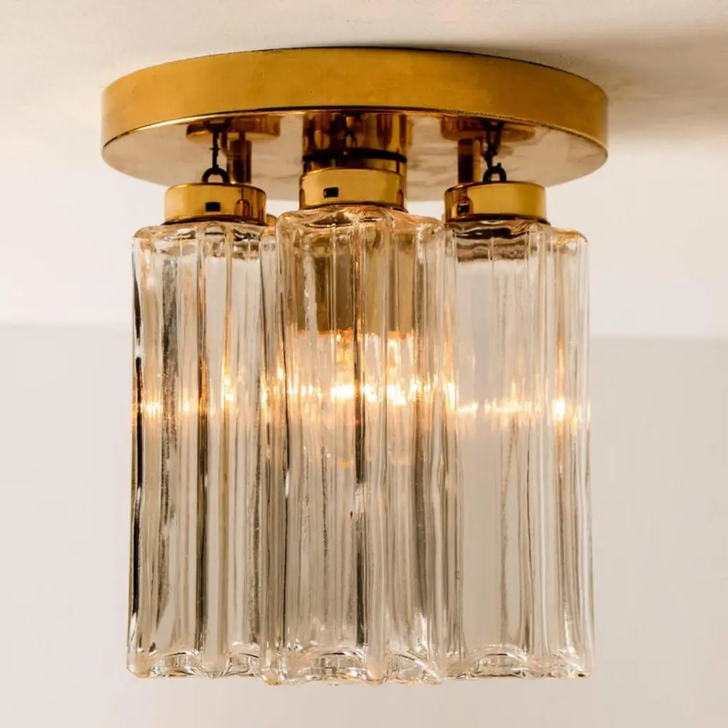 Each individual glass shade is column shaped with a six-sided star at the base, all of which are the same size. Together these sculptural forms add depth and reflection. Presently fitted with clear light bulbs but can take different shaped light bulbs to vary the look.Please notice the price is for the pair. They will be sold as a set as a pair or individually.Also larges sizes of the same model series available. Feel free to ask for additional informationFlush mount small (two on stock)H overall 9.8" x D 8.7" (H overall 25 cm x D 22 Cm)Heavy quality and in very good vintage condition. Cleaned, re-wired and ready to use. The light fixtures can be disassembled and the glass shades individually wrapped for easy transport. Each flush mount requires E27 standard light bulbs (Max 40W).
