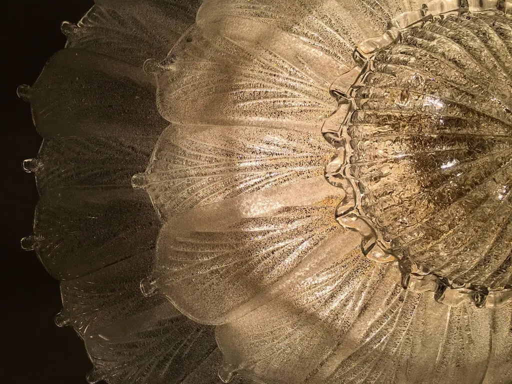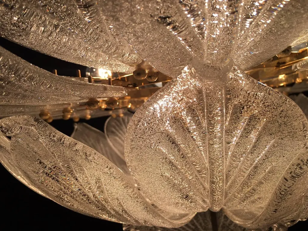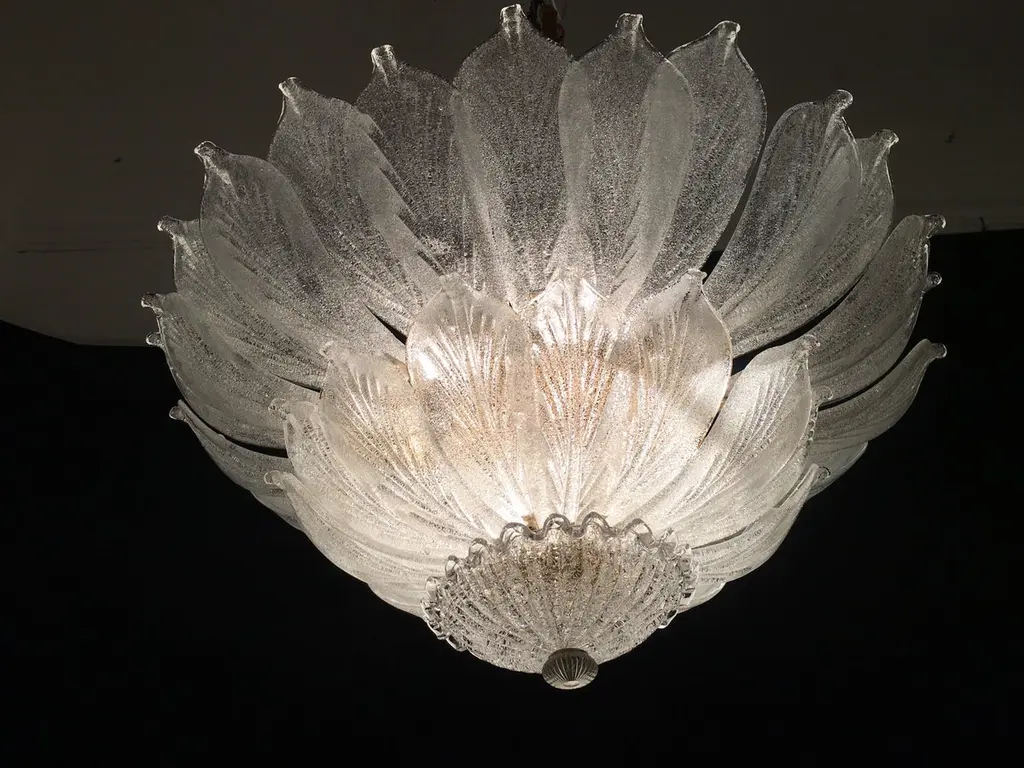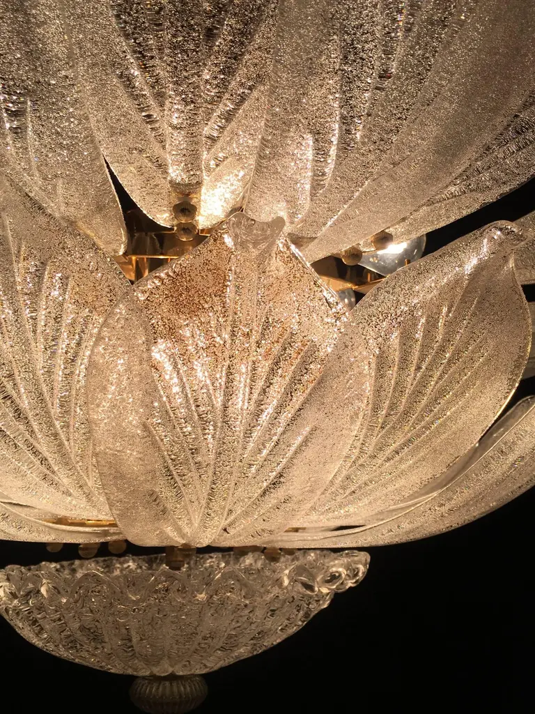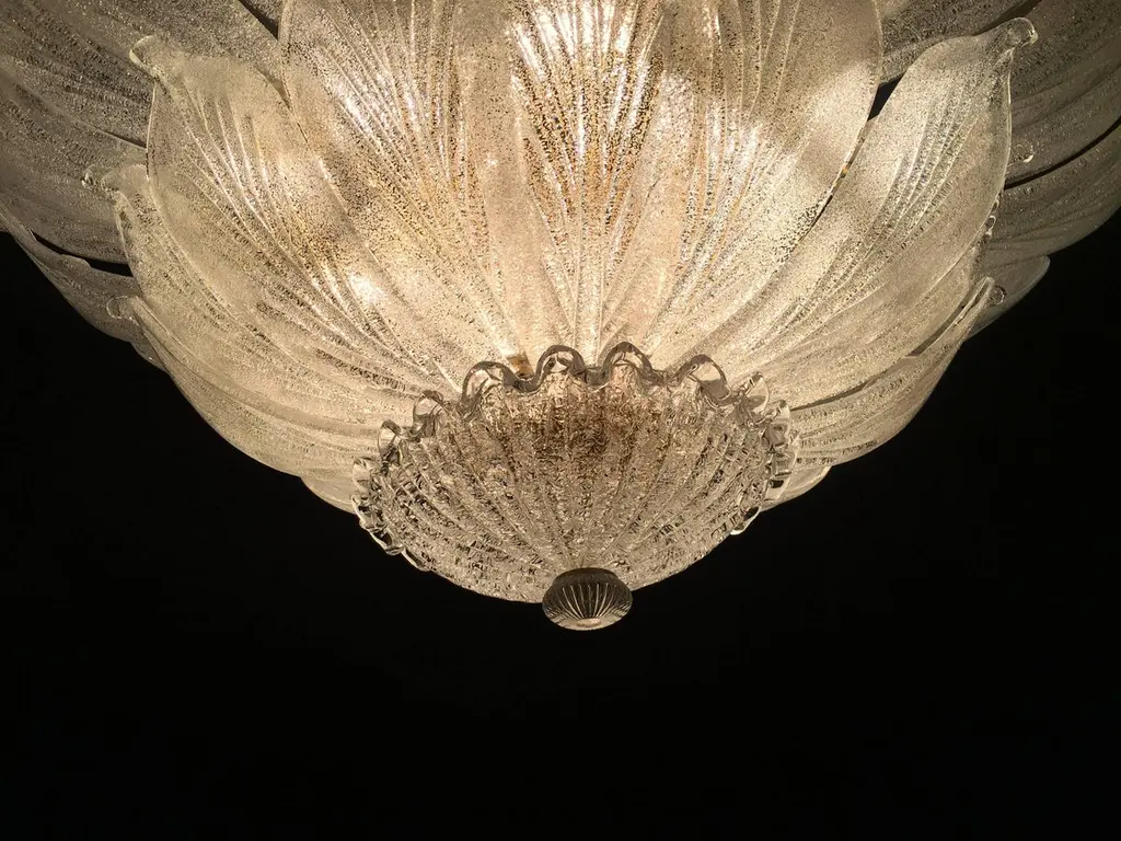Realized in pure Murano glass each chandelier consists of an incredible number of leaves. The structure ispainted gold color. 18-light spread a magical light.Measures: Diameter 100 cm, height 46 cm without the chain.