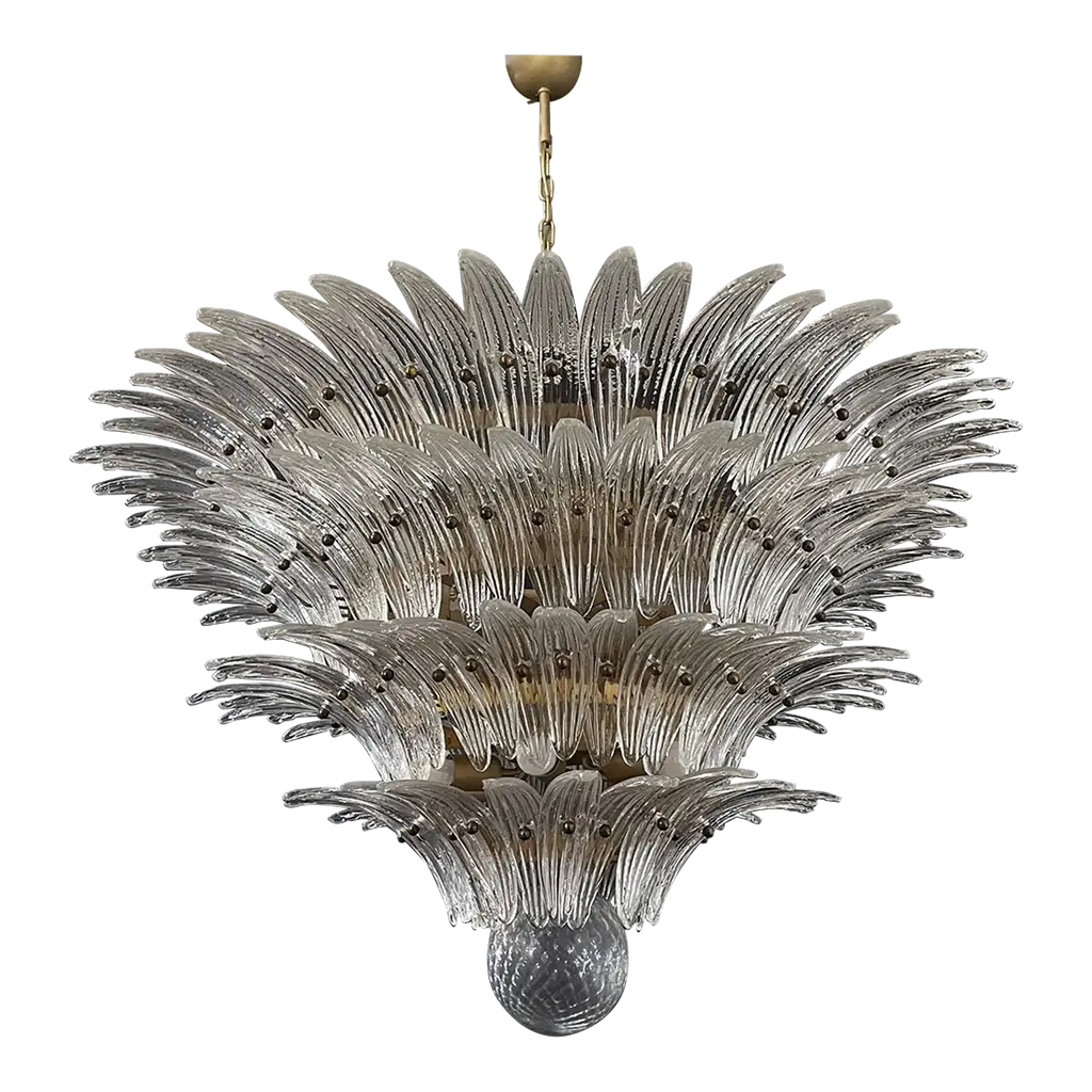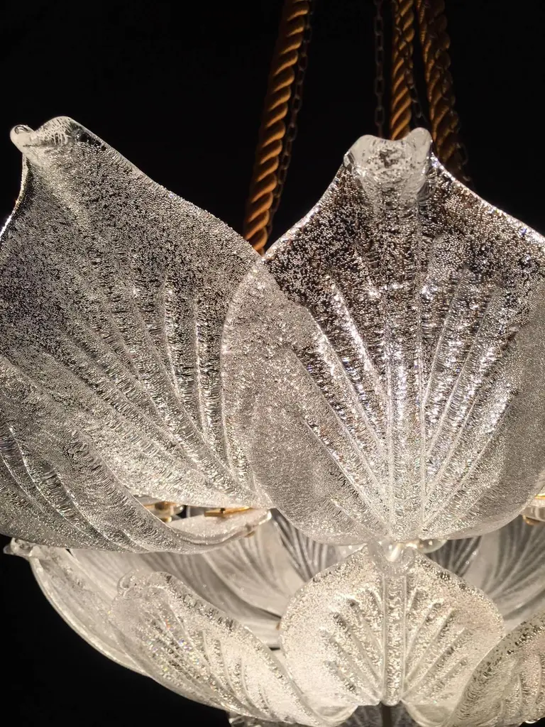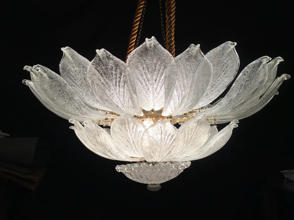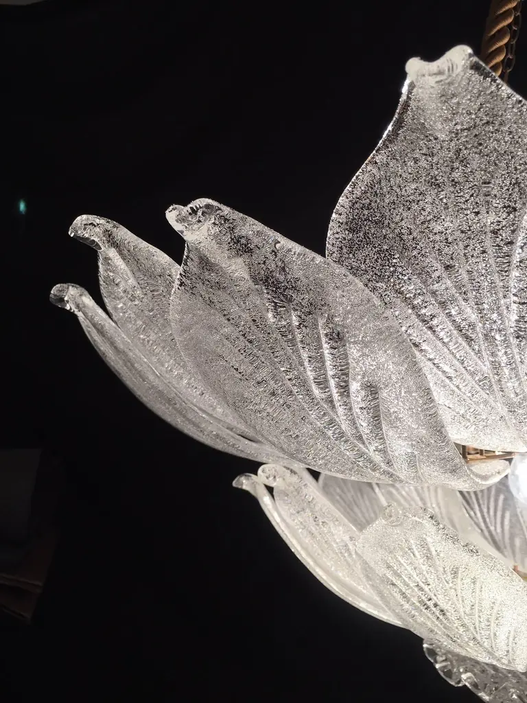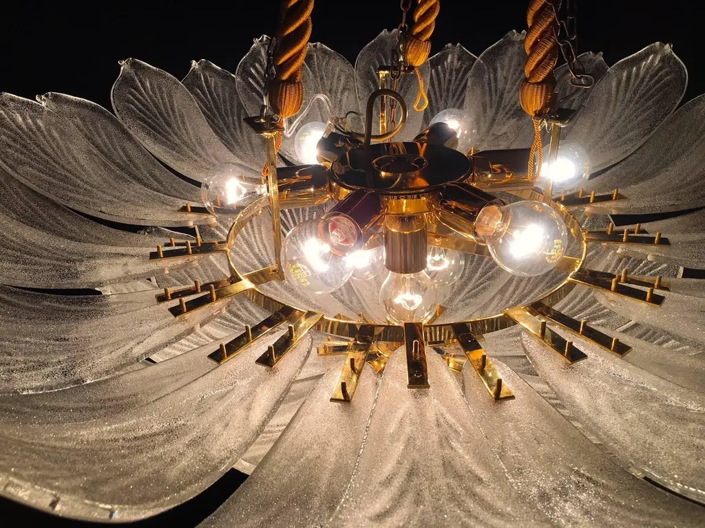 Realized in pure Murano glass each chandelier consists of an incredible number of leaves. The structure ispainted gold color. 18-light spread a magical light.Measures: Diameter 100 cm, height 46 cm without the chain.