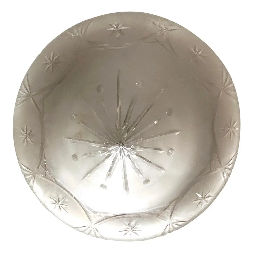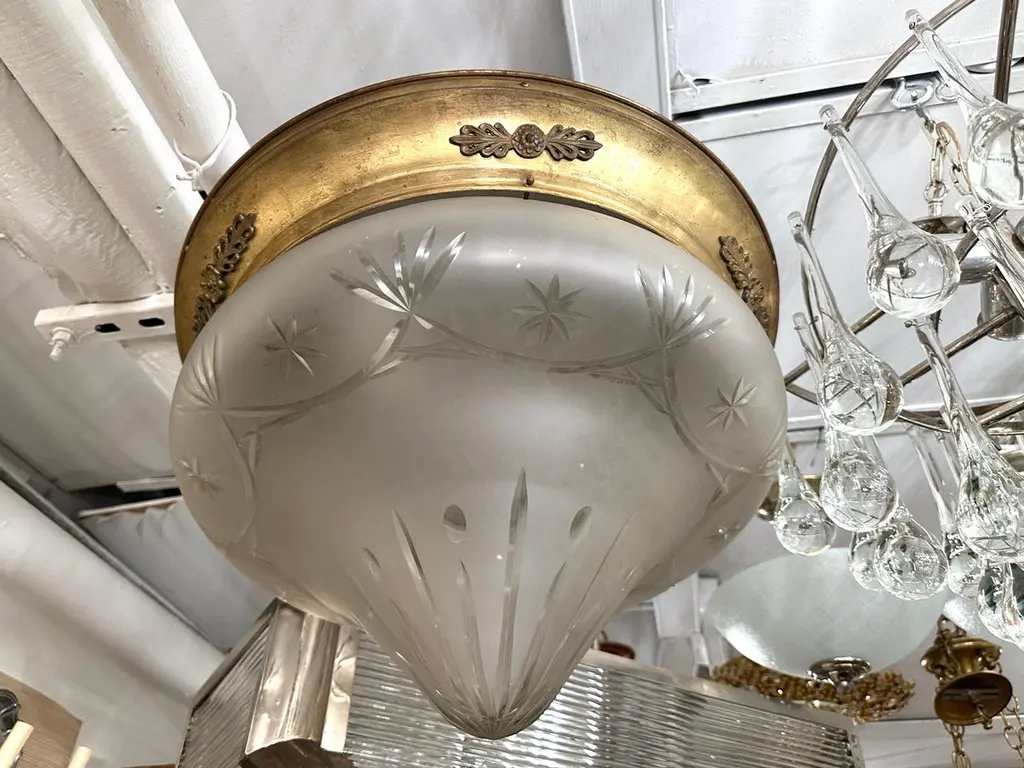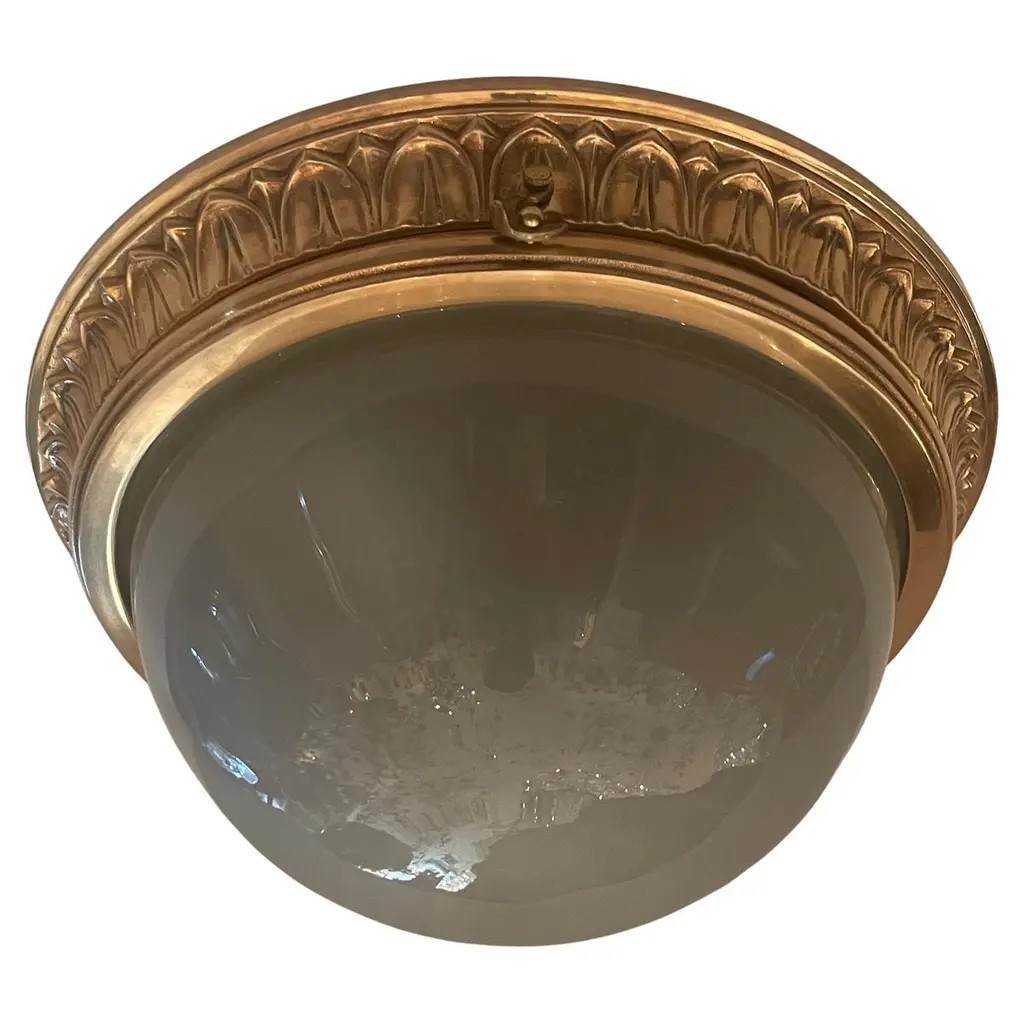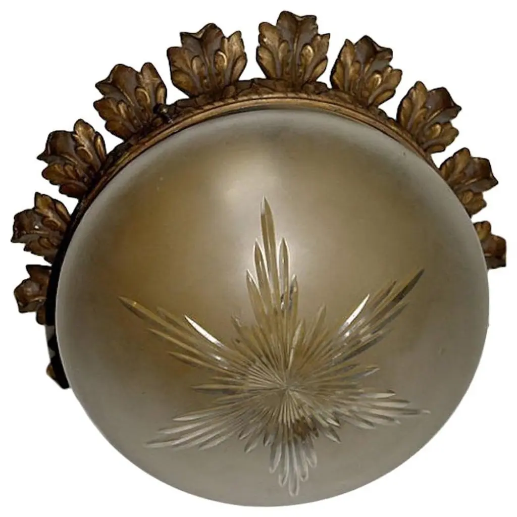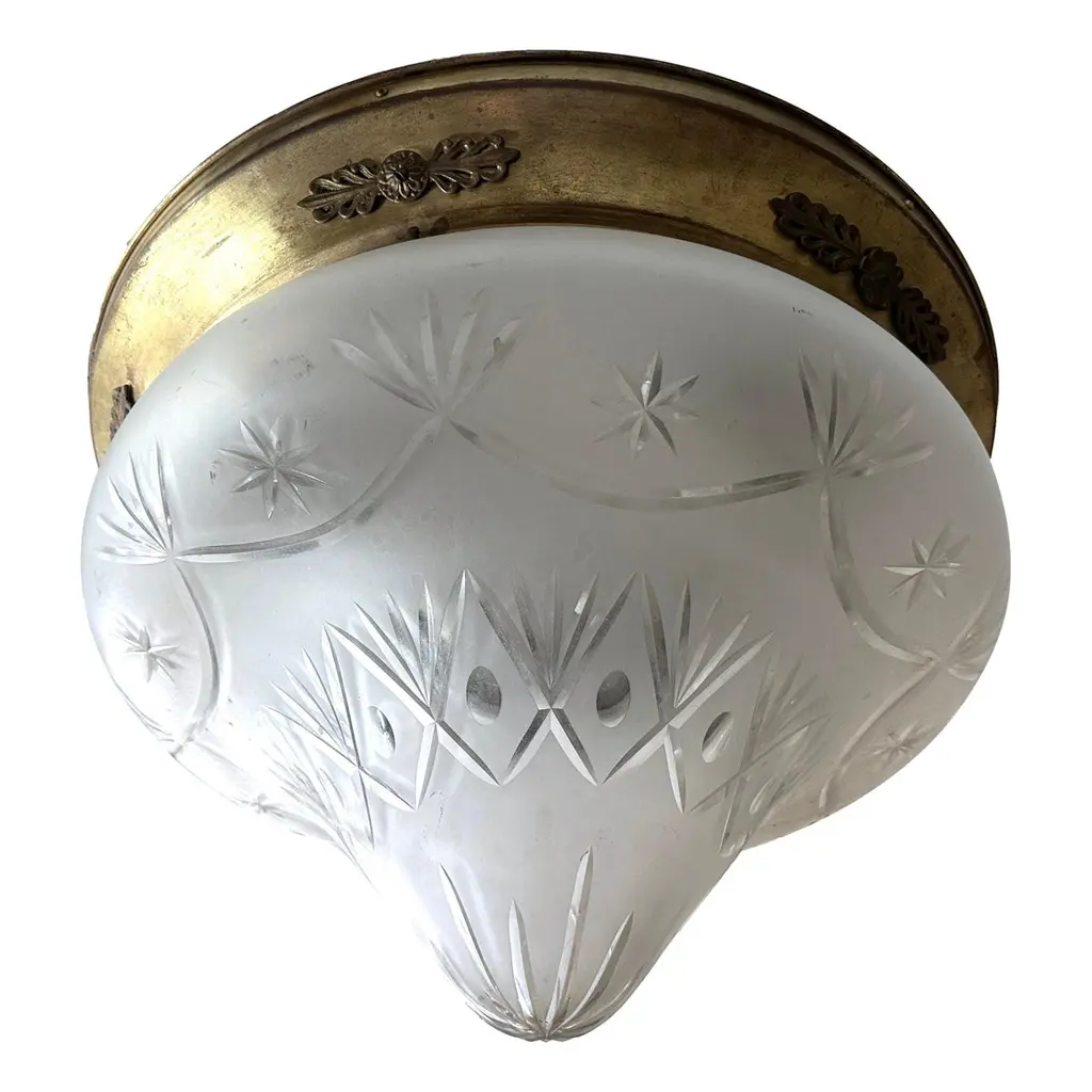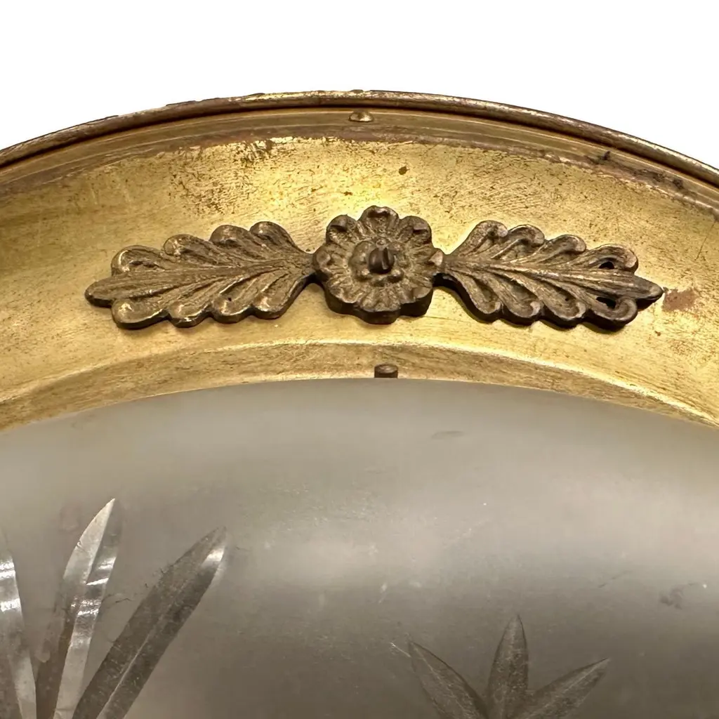 Pair of large circa 1930's French gilt metal flush-mount light fixtures with etched glass bowl. Sold individually.MeasurementsHeight: 12.5"Diameter: 20"