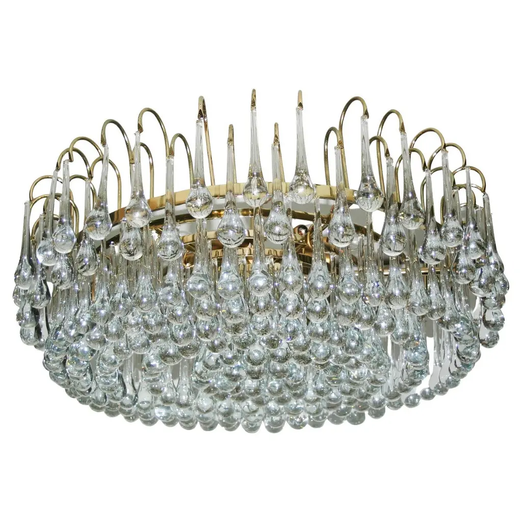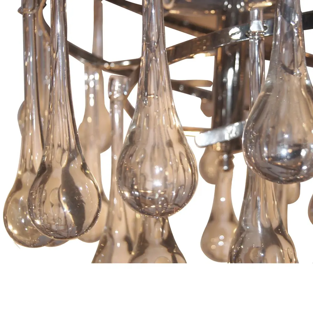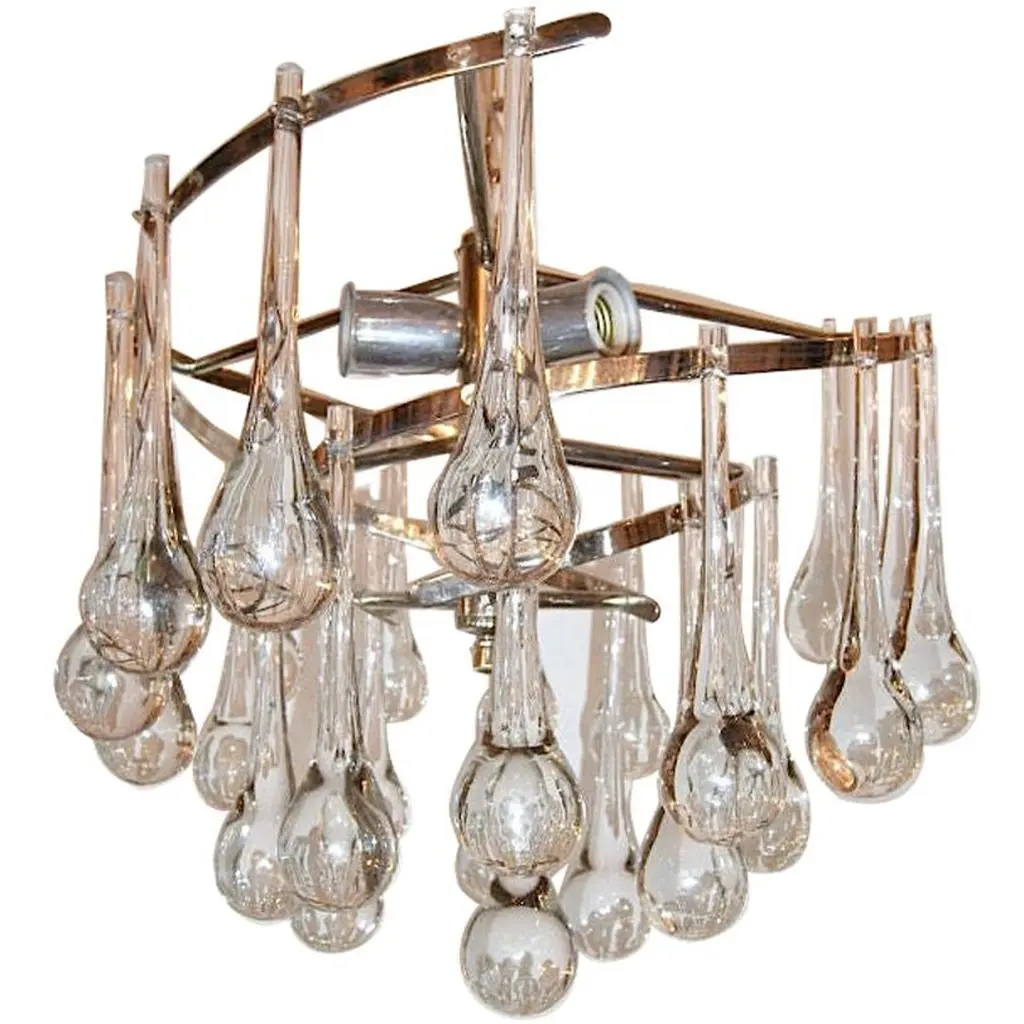 A pair of Italian circa 1950s flush-mounted nickel-plated light fixtures with oversized glass drops and with interior lights. Sold Individually. Measurements:Diameter: 18" Minimum drop: 16".