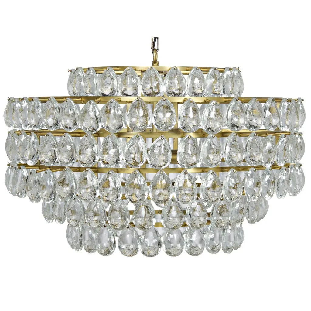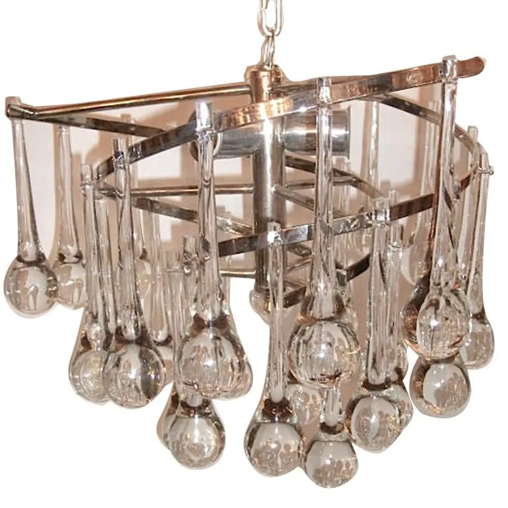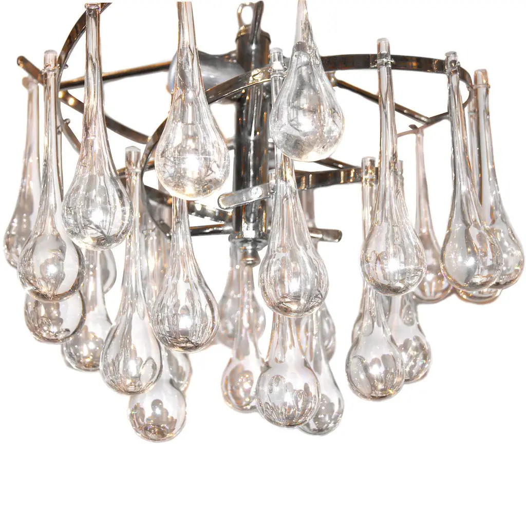 A pair of Italian circa 1950s flush-mounted nickel-plated light fixtures with oversized glass drops and with interior lights. Sold Individually. Measurements:Diameter: 18" Minimum drop: 16".