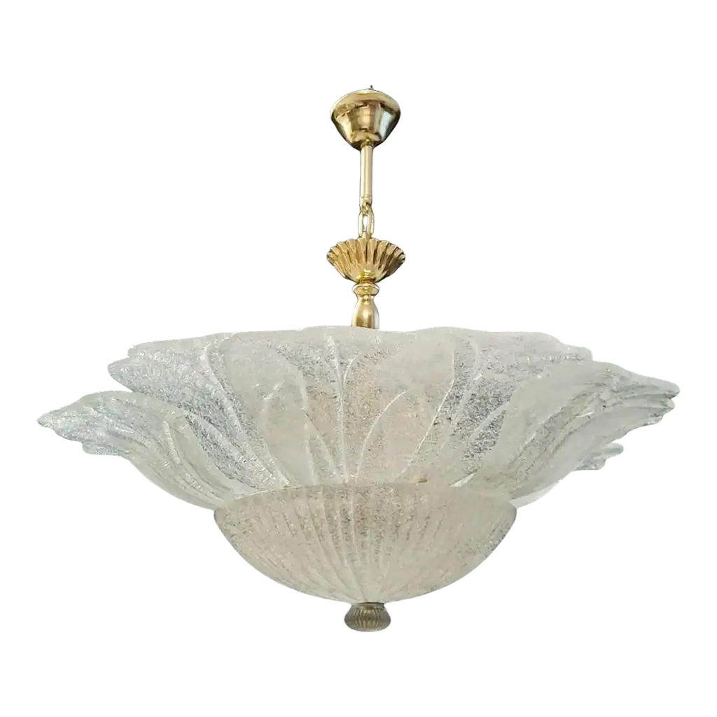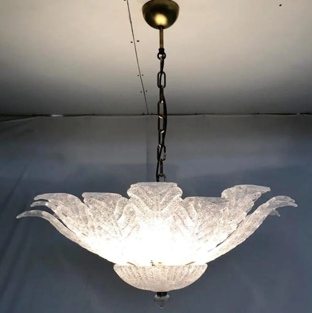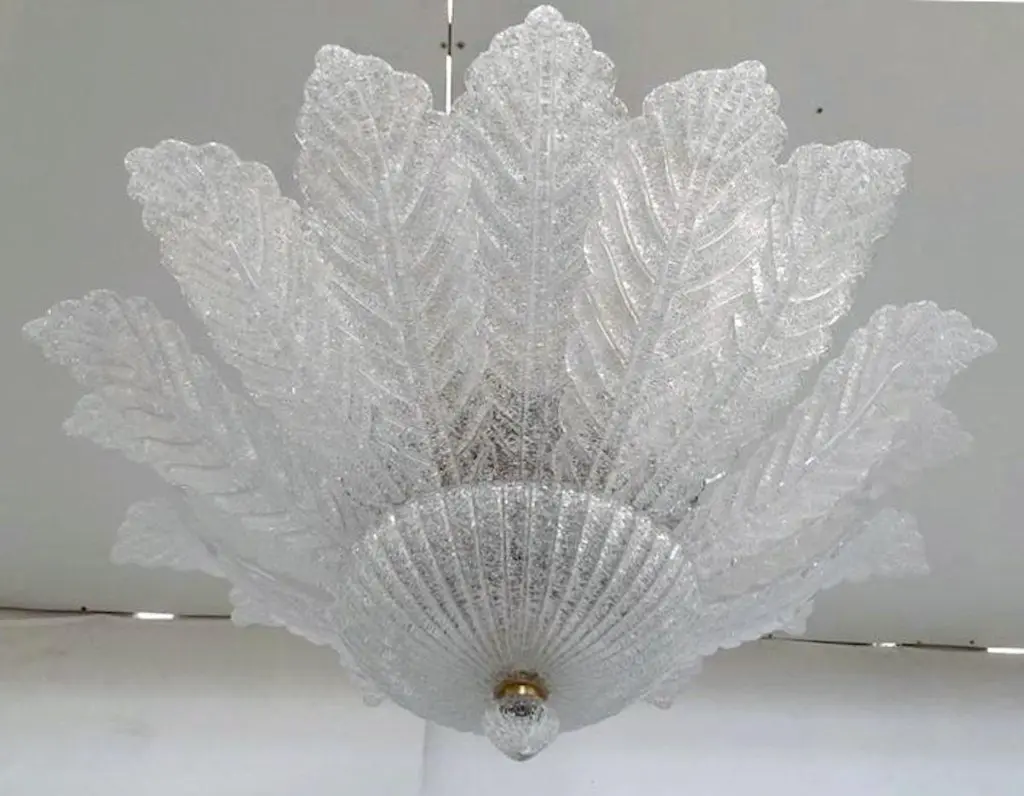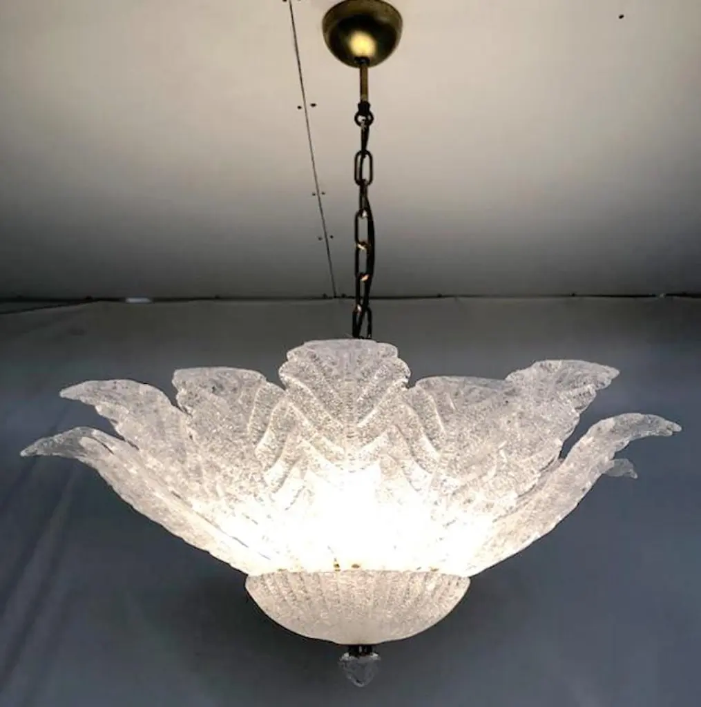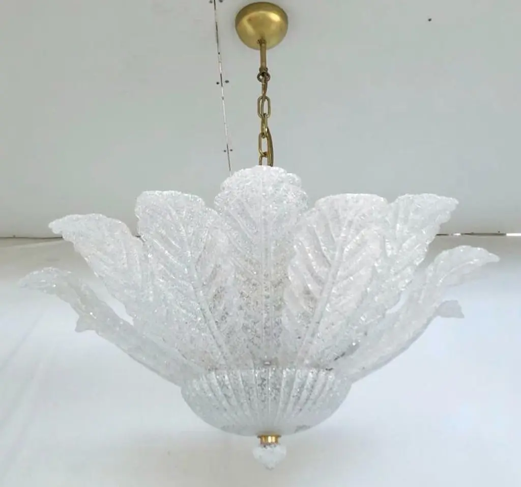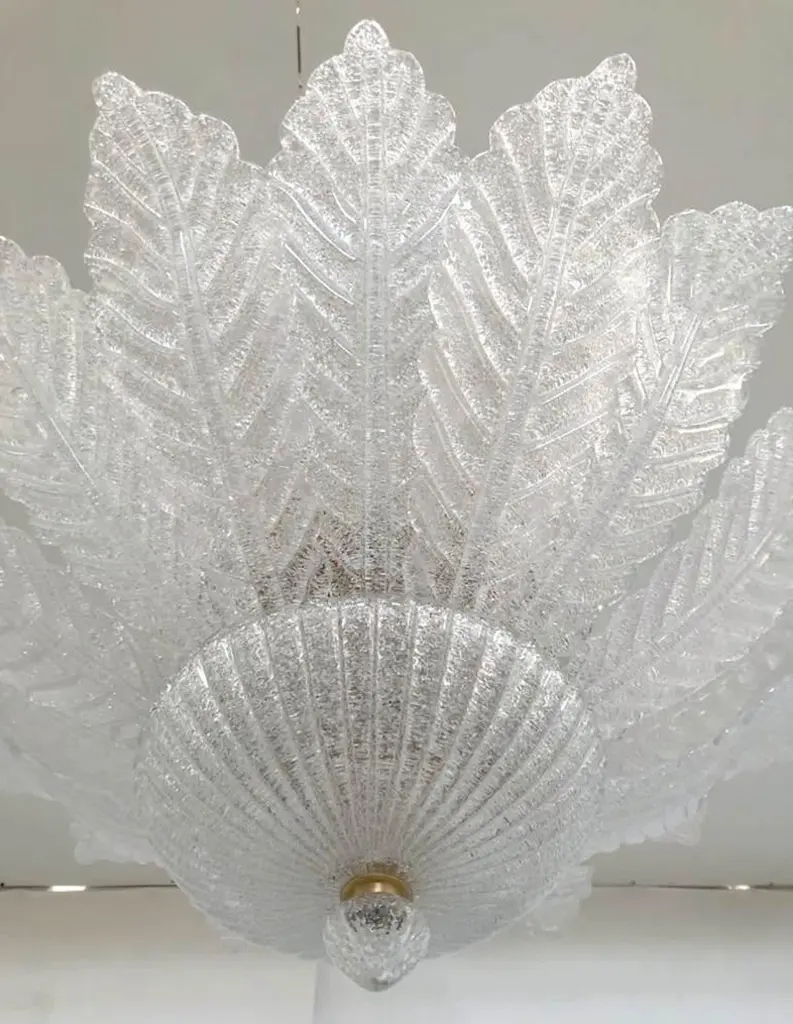Italian flush mount or chandelier with clear Murano glass leaves hand blown in Graniglia technique to produce a granular textured effect, mounted on gold finish internal frame and unlacquered natural brass chain and canopy / Designed by Fabio Bergomi for Fabio Ltd, inspired by Barovier e Toso / Made in Italy.8 lights / E26 or E27 type / max 60W eachMeasures: diameter 32 inches, height 18 inches plus chain and canopyOrder only / This item ships from Italy.