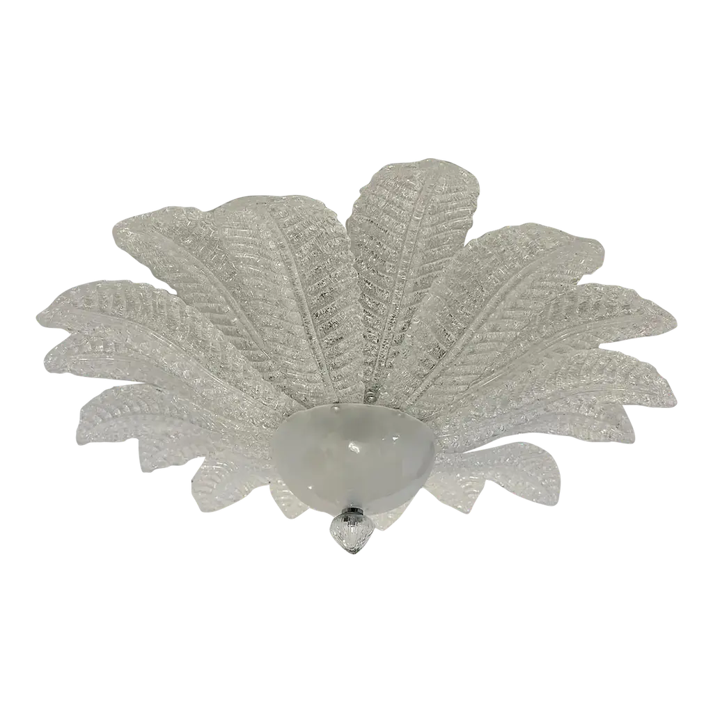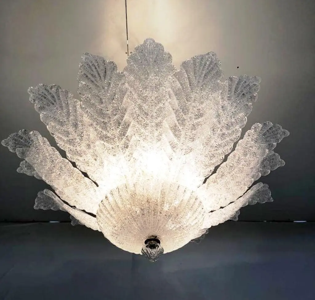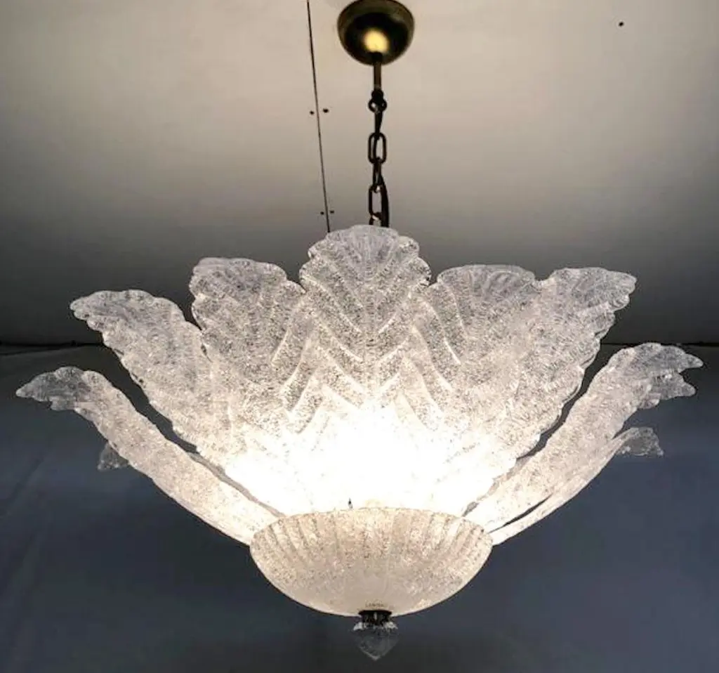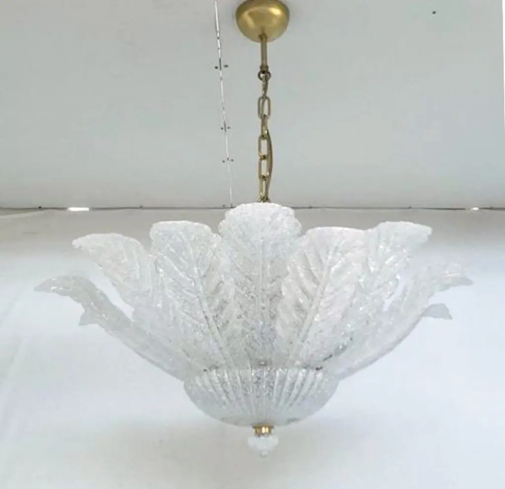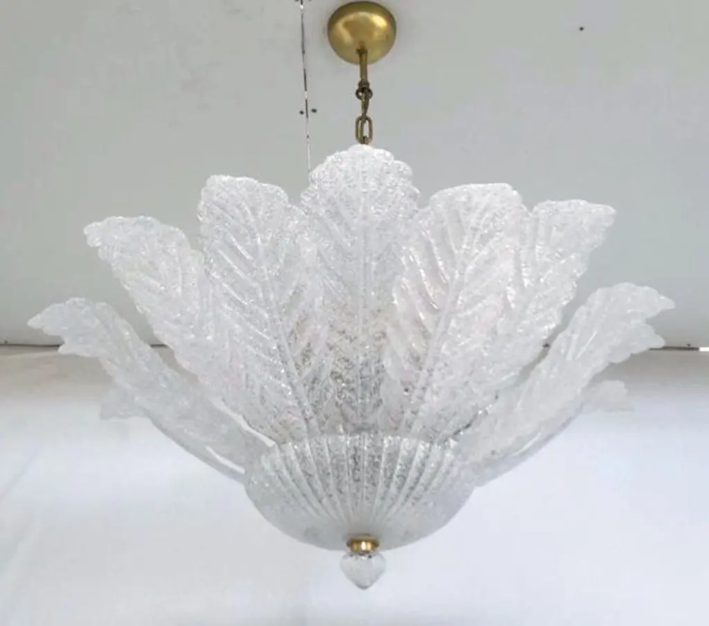 Italian flush mount or chandelier with clear Murano glass leaves hand blown in Graniglia technique to produce a granular textured effect, mounted on gold finish internal frame and unlacquered natural brass chain and canopy / Designed by Fabio Bergomi for Fabio Ltd, inspired by Barovier e Toso / Made in Italy.8 lights / E26 or E27 type / max 60W eachMeasures: diameter 32 inches, height 18 inches plus chain and canopyOrder only / This item ships from Italy.