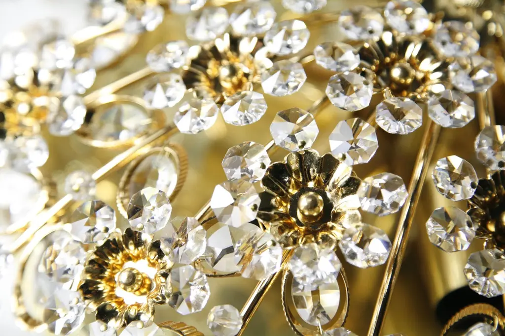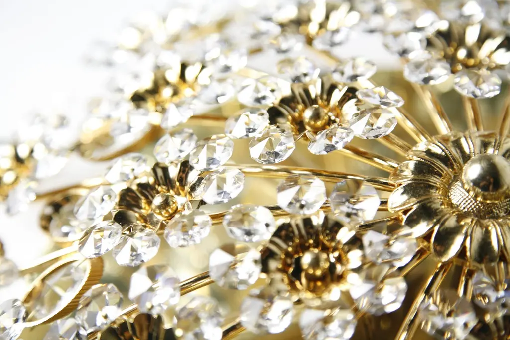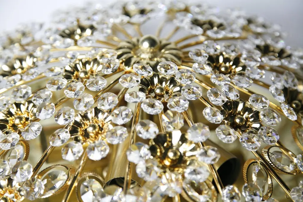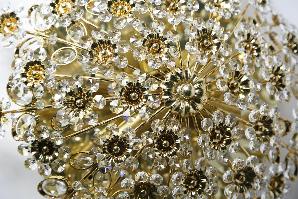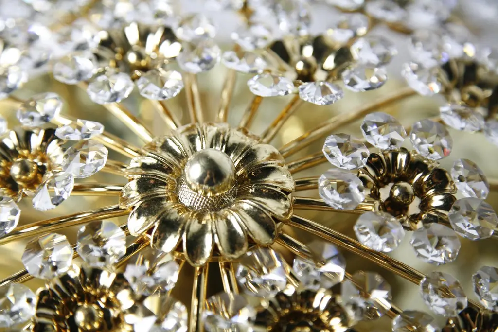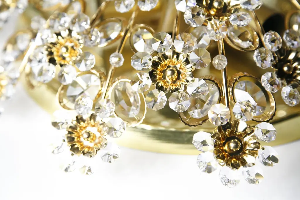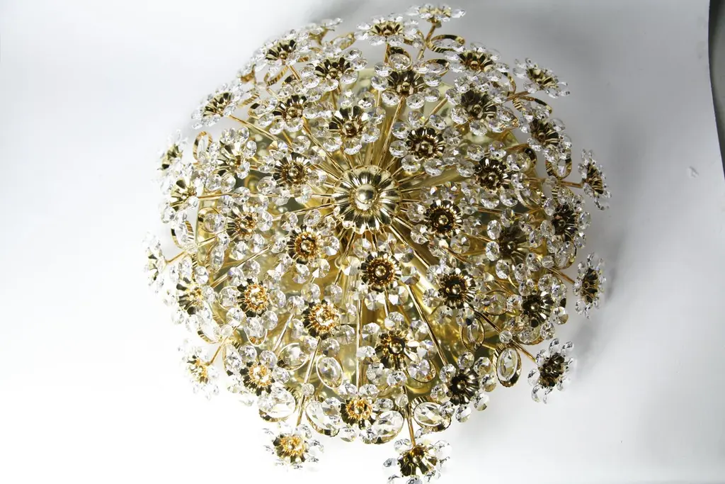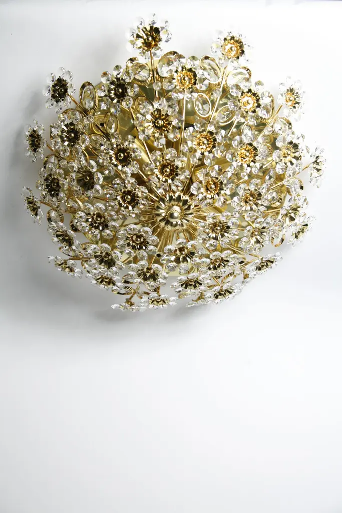 1970s round flush mount gilded frame that has numerous cut crystals and beads in various sizes in the placed in shapes of flowers , Austria.Six European candelabra sockets.Signed and numbered Christoph Palme, Palwa.