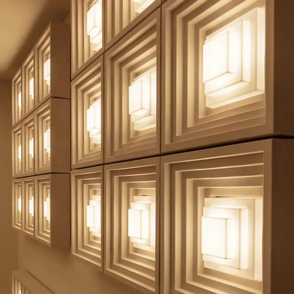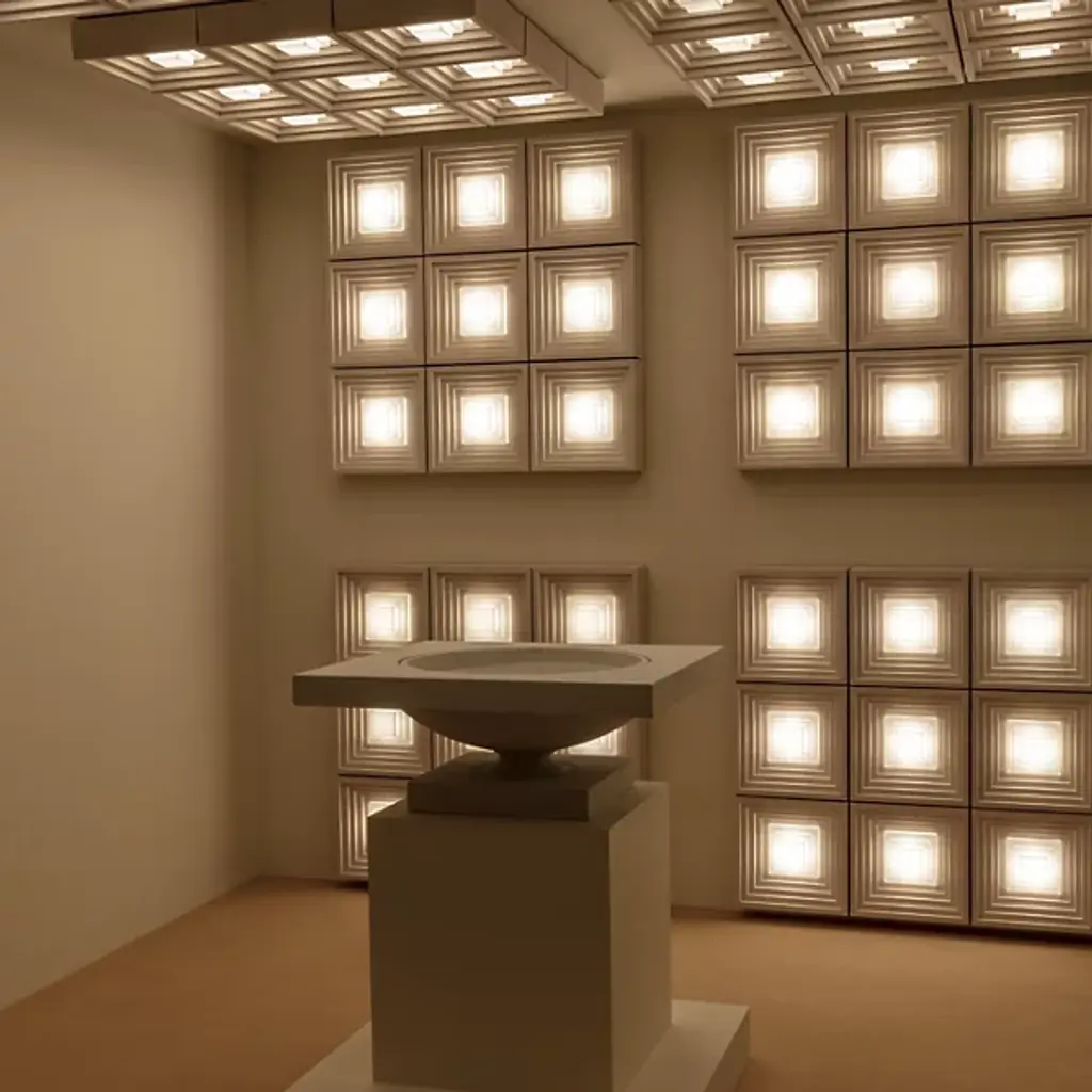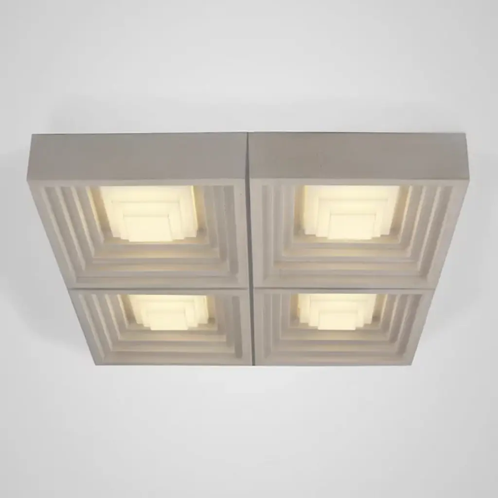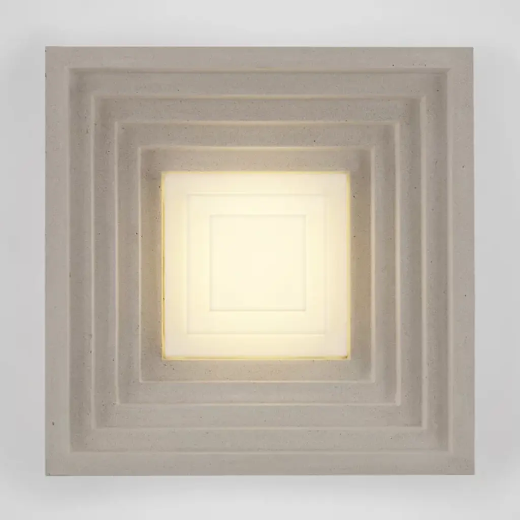 An architectural standout inspired by the awe-inspiring geometry of the ancient Pantheon's dome ceiling. The award-winning Pantheum Wall/Flushmount from Lee Broom mesmerizes with handcrafted materials glazed in sequenced light. Creator Lee Broom's pieces are underscored by their blend of classicism and modernity. A modern mounting system makes the piece a great choice on the ceiling or the wall, whether as a single or expansive group. Cast from jesmonite, the geometric structure achieves a time-tested look with a sandblasted surface and a familiar stepped pattern. The pattern of the structure receives crisp highlights from the acrylic diffused light, making for a hypnotic image.