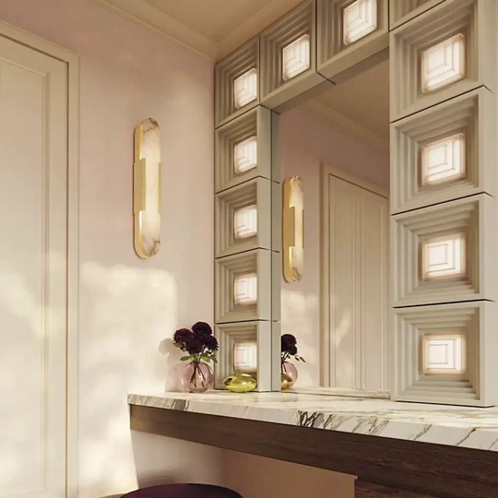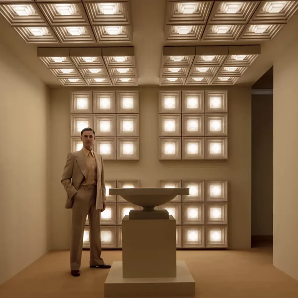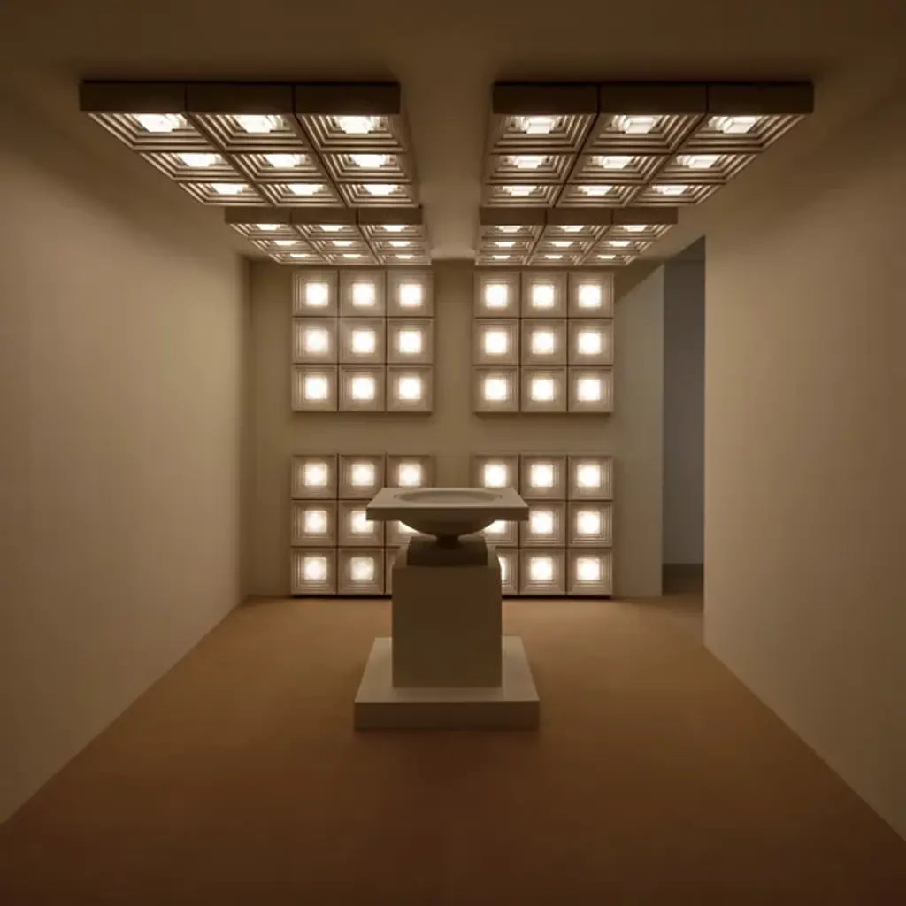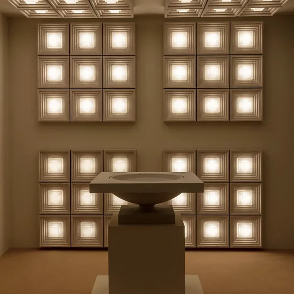 An architectural standout inspired by the awe-inspiring geometry of the ancient Pantheon's dome ceiling. The award-winning Pantheum Wall/Flushmount from Lee Broom mesmerizes with handcrafted materials glazed in sequenced light. Creator Lee Broom's pieces are underscored by their blend of classicism and modernity. A modern mounting system makes the piece a great choice on the ceiling or the wall, whether as a single or expansive group. Cast from jesmonite, the geometric structure achieves a time-tested look with a sandblasted surface and a familiar stepped pattern. The pattern of the structure receives crisp highlights from the acrylic diffused light, making for a hypnotic image.