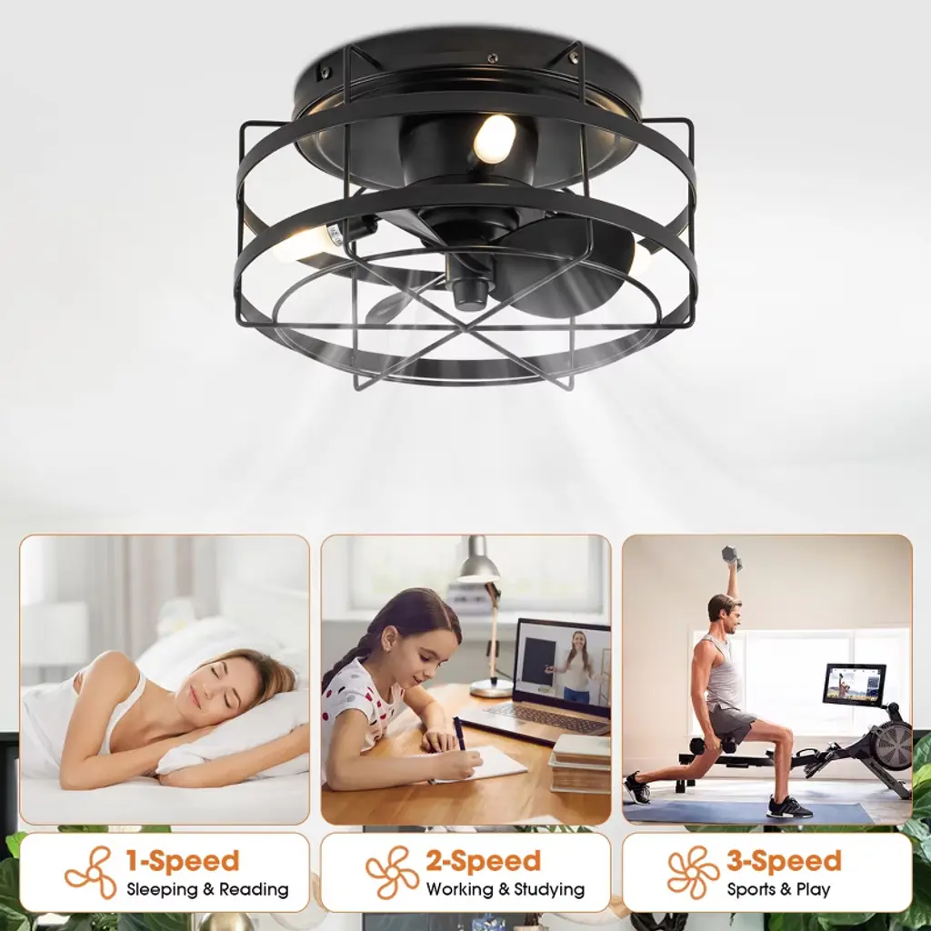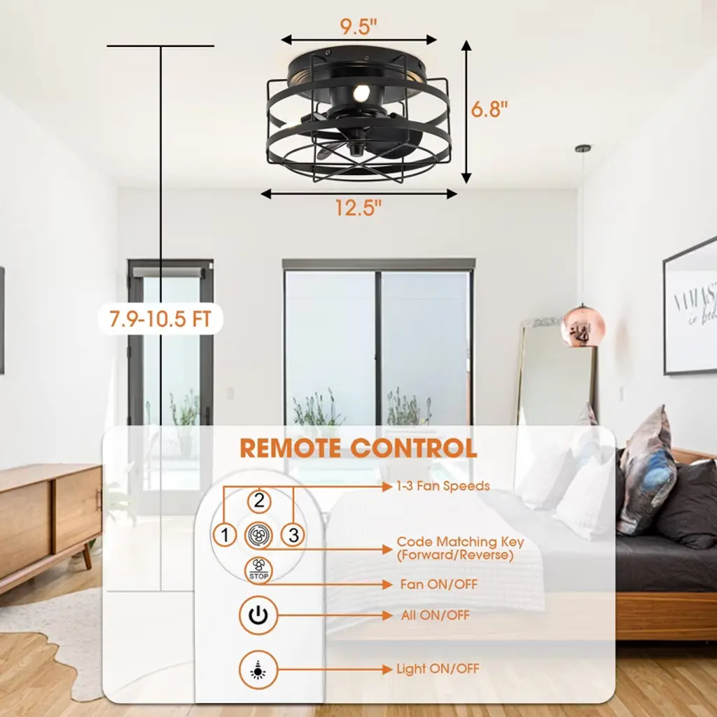 This 12.5 in. indoor black flush mount cage ceiling fan is a perfect blend of style and functionality. With its sleek black finish, it complements any modern or traditional decor. The fan features a reversible motor that allows you to change the fan's direction for optimal air circulation during different seasons. The flush mount design is ideal for rooms with low ceilings, providing ample headroom. The fan comes with a remote control, allowing you to easily change the speed from the comfort of your seat. It offers 3 fan speeds, ensuring you have the perfect amount of airflow for any situation. In addition, the fan includes 3 ABS blades known for their durability and longevity. This ceiling fan also features a cage design with three G9 light bulbs included, providing both efficient cooling and illumination. With its easy installation and low maintenance, this ceiling fan is a practical choice for any indoor space.