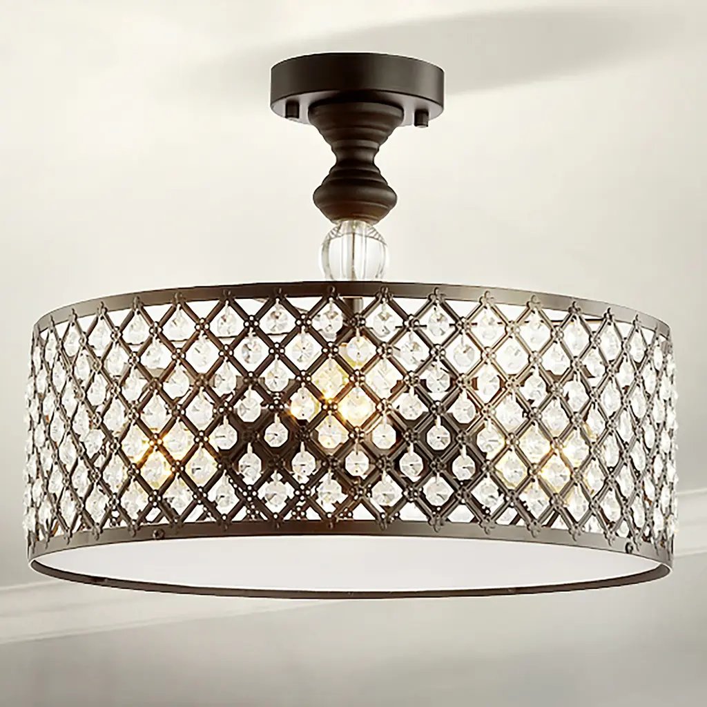 The metal finish gives the lamp a high-class texture, which can harmonize with the modern home style and show a low-key but exquisite taste. The lampshade adopts an exquisite hollow design, inlaid with sparkling crystal elements. When the light is refracted through the crystal, it will emit amazingly gorgeous light, creating a dreamy and romantic atmosphere. Whether it's in the living room, bedroom, or dining room, it can become the visual focus of the space. This drum ceiling light not only provides an excellent lighting effect, but also injects elegance and spirituality into the home environment with artistic design language, which is ideal for the pursuit of a quality life.