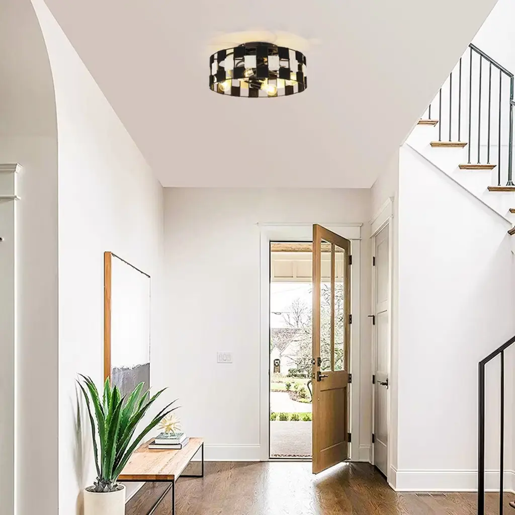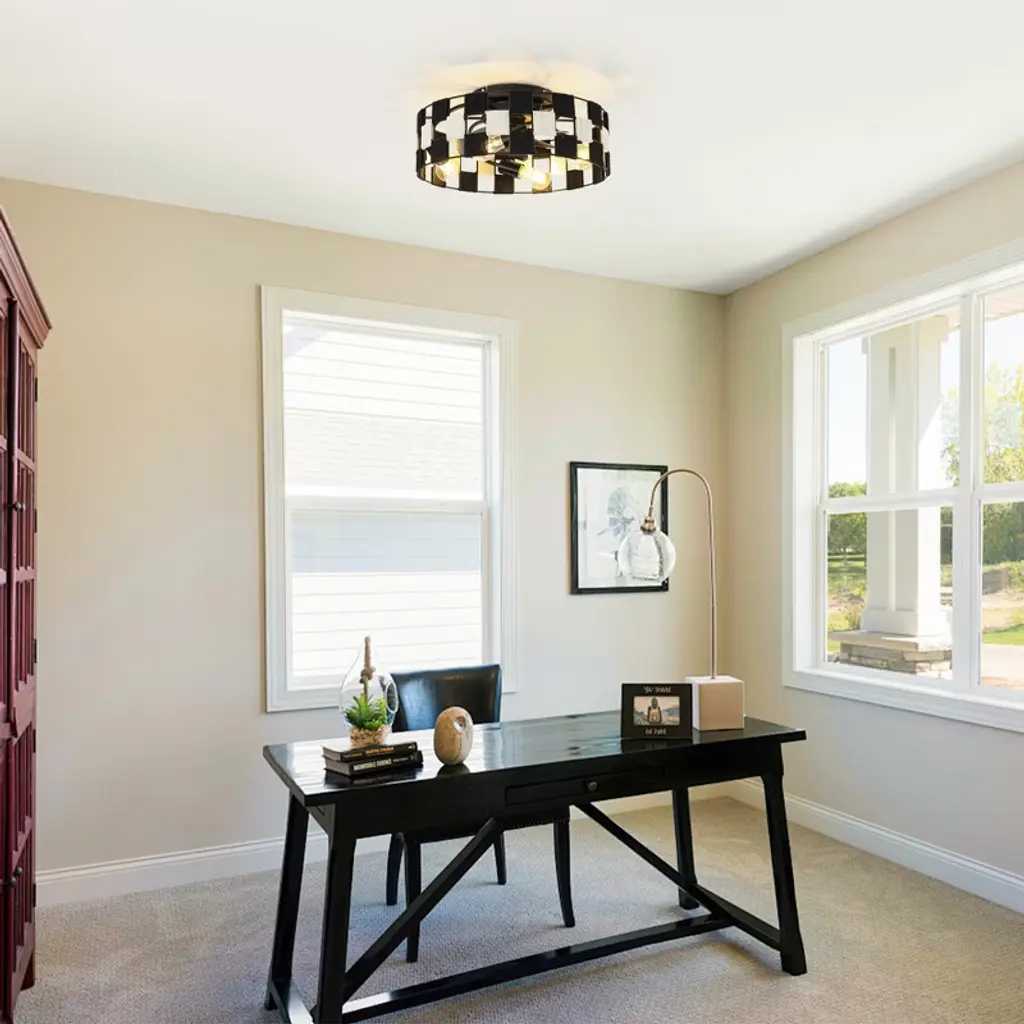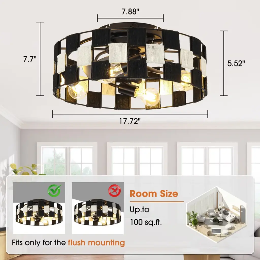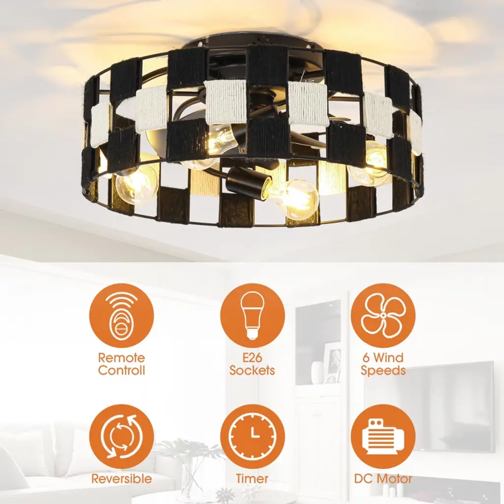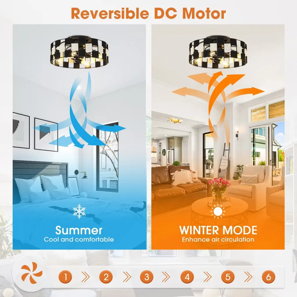 This modern flush mount ceiling fan features a checkerboard grid shade with a characteristic colour collision. It has five fan blades, a DC motor for 6-speed wind speed adjustment, and more support for remote control use. It is easy to install, and ceiling mounting can save more space. This small ceiling fan is especially suitable for bedrooms, dining rooms, entrance halls, and some other rooms with small spaces. Support multiple control methods, remote control, APP control, and voice assistant.