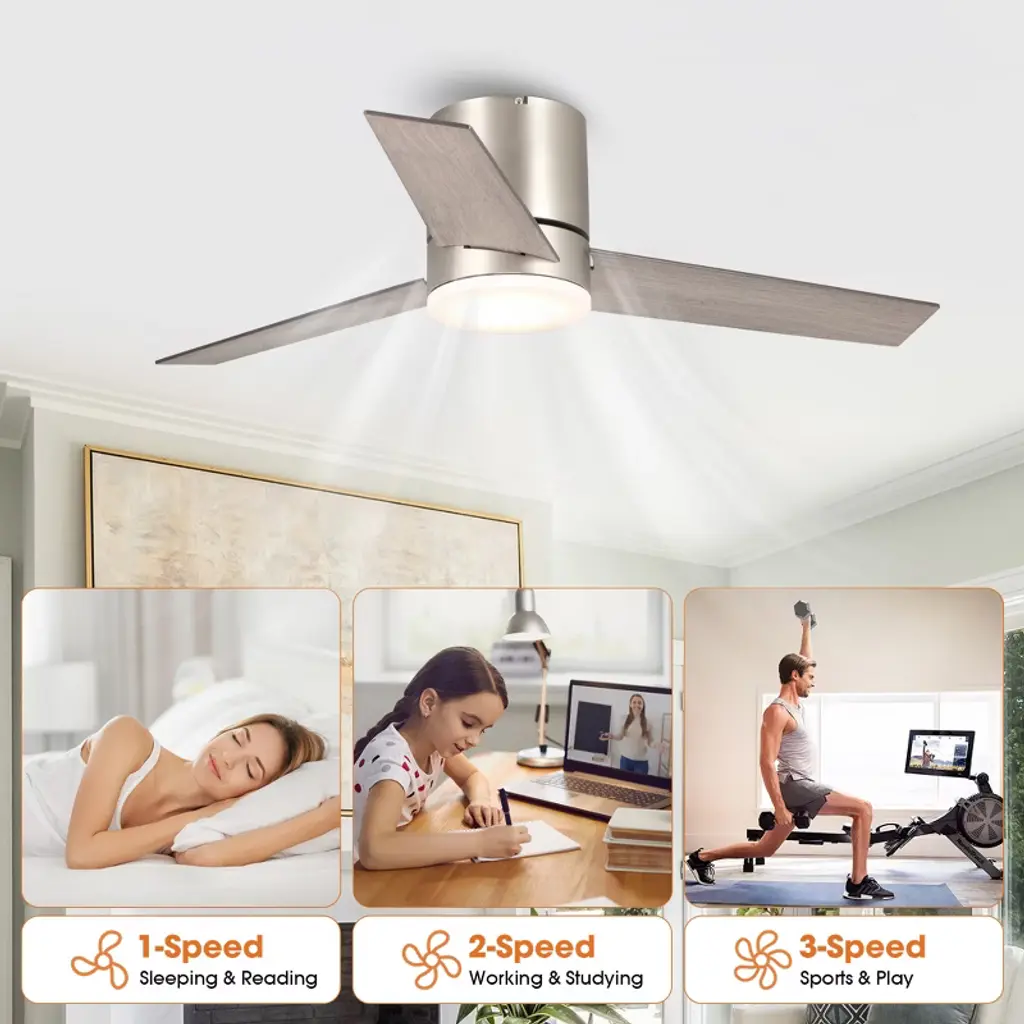 Cool your space in contemporary style with this 48" 3-blade flush mount ceiling fan. Sleek and modern, its metal body and wood blades accommodate three blades for efficient air circulation. The integrated LED light kit illuminates your room with a white shade, adding a neutral vibe. With three speeds and a reversible motor, you can customize the airflow to your preference. Plus, its low-noise design ensures a peaceful environment.