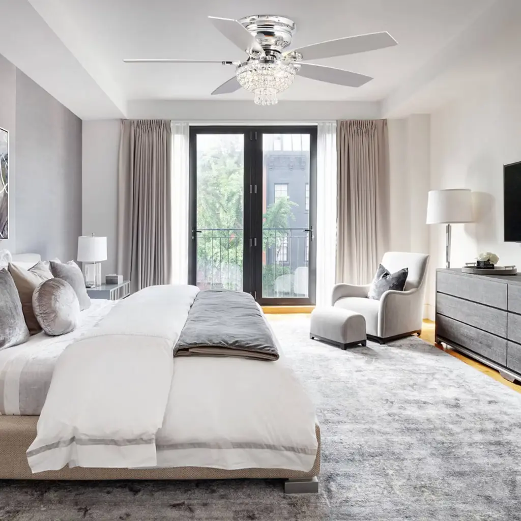 This 52-inch modern ceiling fan blends practical functionality with luxurious aesthetics, making it the finishing touch to your home décor. It is not only a silent fan with strong wind power, but also an exquisite crystal artwork that adds a noble and elegant atmosphere to your living room, bedroom, or dining room. The ceiling fan is equipped with 5 wide double-sided silver-colored fan blades, which are made of high-quality material with a fine polished surface and full of luster. The fan blades adopt reversible design, which can be switched to forward air supply in summer, bringing cool and comfortable air circulation; in winter, it can be adjusted to reverse rotation, promoting indoor warm air circulation, realizing energy saving and reducing consumption, so that you can enjoy a pleasant environment all year round.