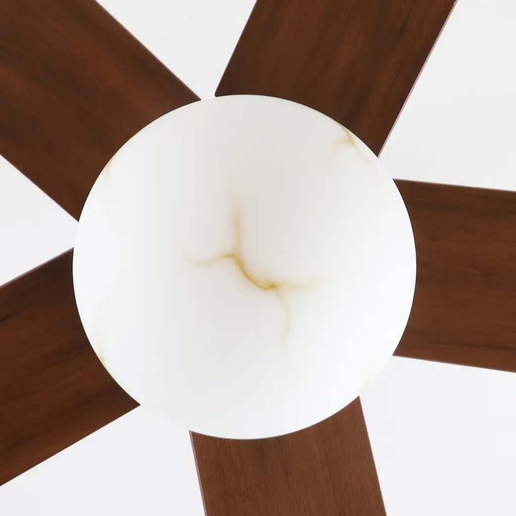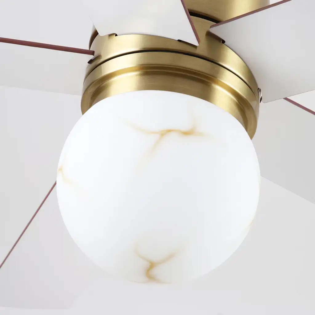 This 52-inch modern gold ceiling fan features a unique dual-tone blade design, with one side in pure white and the other in warm walnut. Not only does this present two distinct visual styles, but it also allows you to switch freely based on the season or your mood, effortlessly complementing various interior decor styles. Crafted from high-quality plywood and precision-balanced, the blades ensure quiet and stable operation, delivering a gentle yet powerful airflow experience. The ceiling fan incorporates an integrated LED light bulb design, paired with a glass sphere-shaped lampshade that emits soft, even illumination. It resembles a brilliant pearl suspended from the ceiling, serving both as lighting and decoration. The light bulb offers three color temperature settings (warm yellow, natural light, cool white), easily adjustable via the included remote control to meet your lighting needs for different scenarios. Whether it's a cozy dinner moment or focused work time, you can find the perfect lighting ambiance. The remote also controls fan speed and timer functions, letting you manage whole-home comfort without getting up. Featuring a modern gold color scheme, it exudes understated luxury. Installed in the living room, bedroom, or dining area, it becomes a visual focal point. This ceiling fan not only enhances home functionality but also embodies the elegance and comfort of modern living with the grace of a work of art.