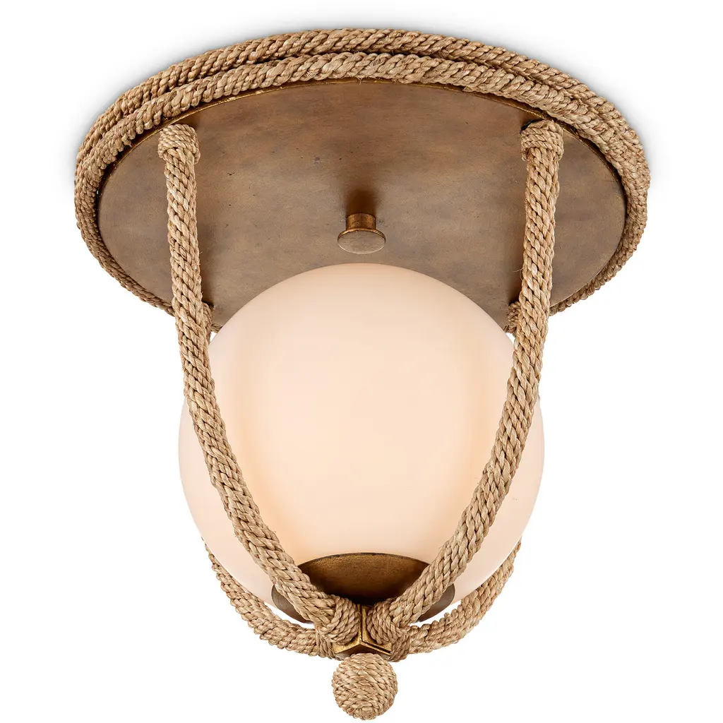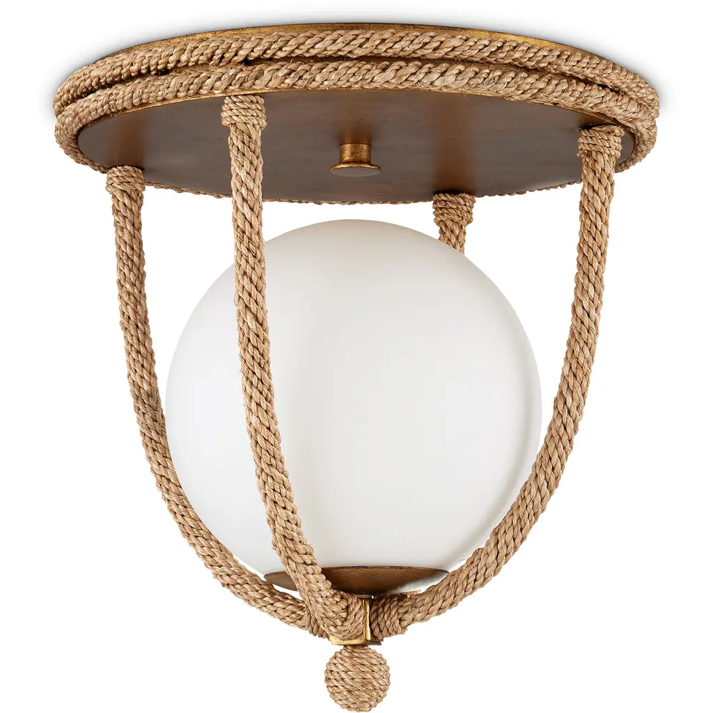 The Passageway Flush Mount is a cleverly designed rope-wrapped ceiling light by Clarence Mallari. The warmth of the rope combined with the dorado gold finish contrasts the frosted glass globe to bring this design heft. One of the arms that hold the globe in place is removable to make changing the bulbs on this brown ceiling light easy.