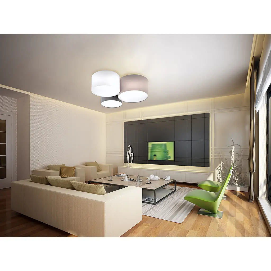 Add glamour to any ceiling with the Pastore 1 ceiling light by Eglo. Adorned with 3 fabric drum shades in taupe, white and grey clustered together