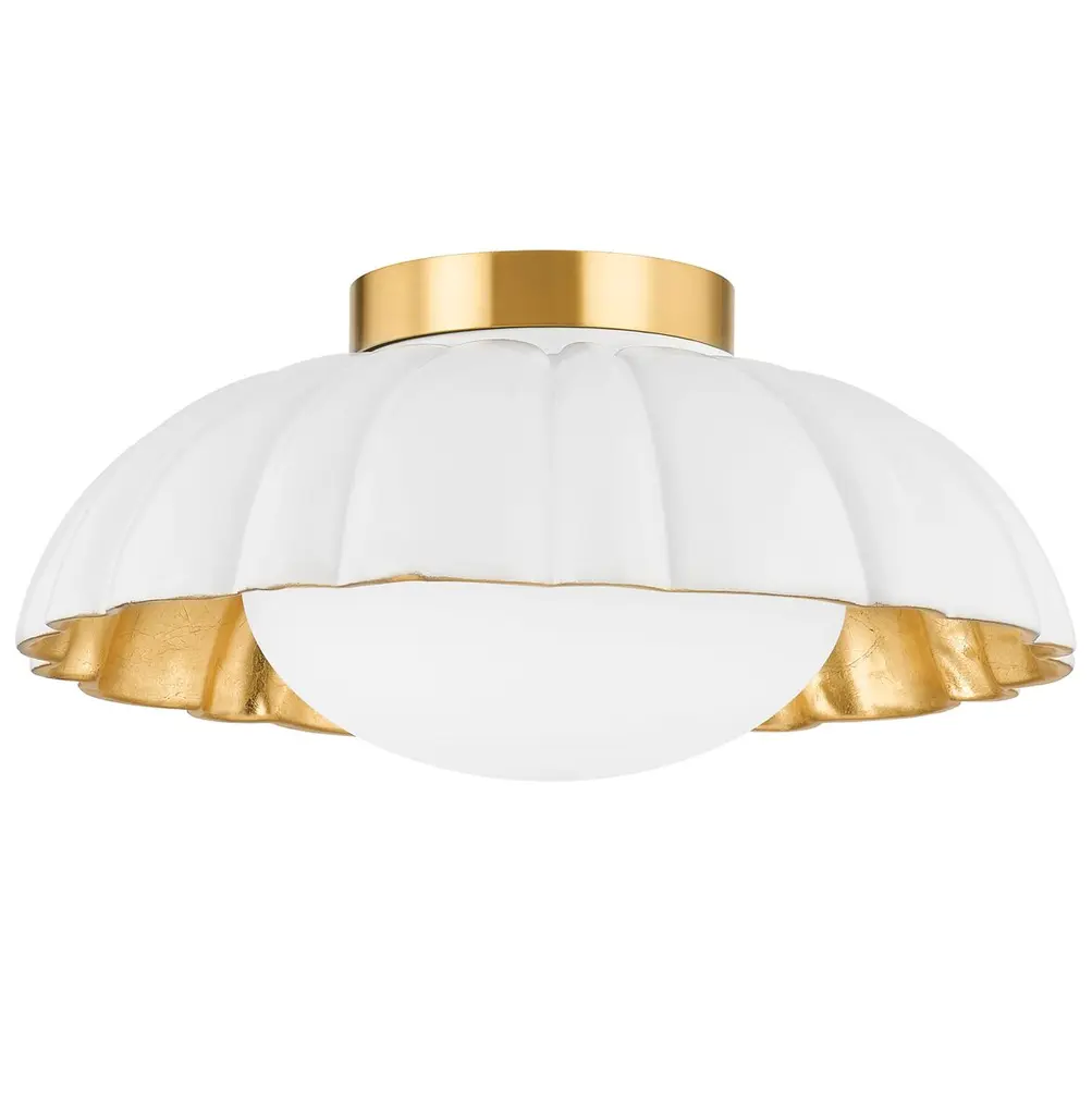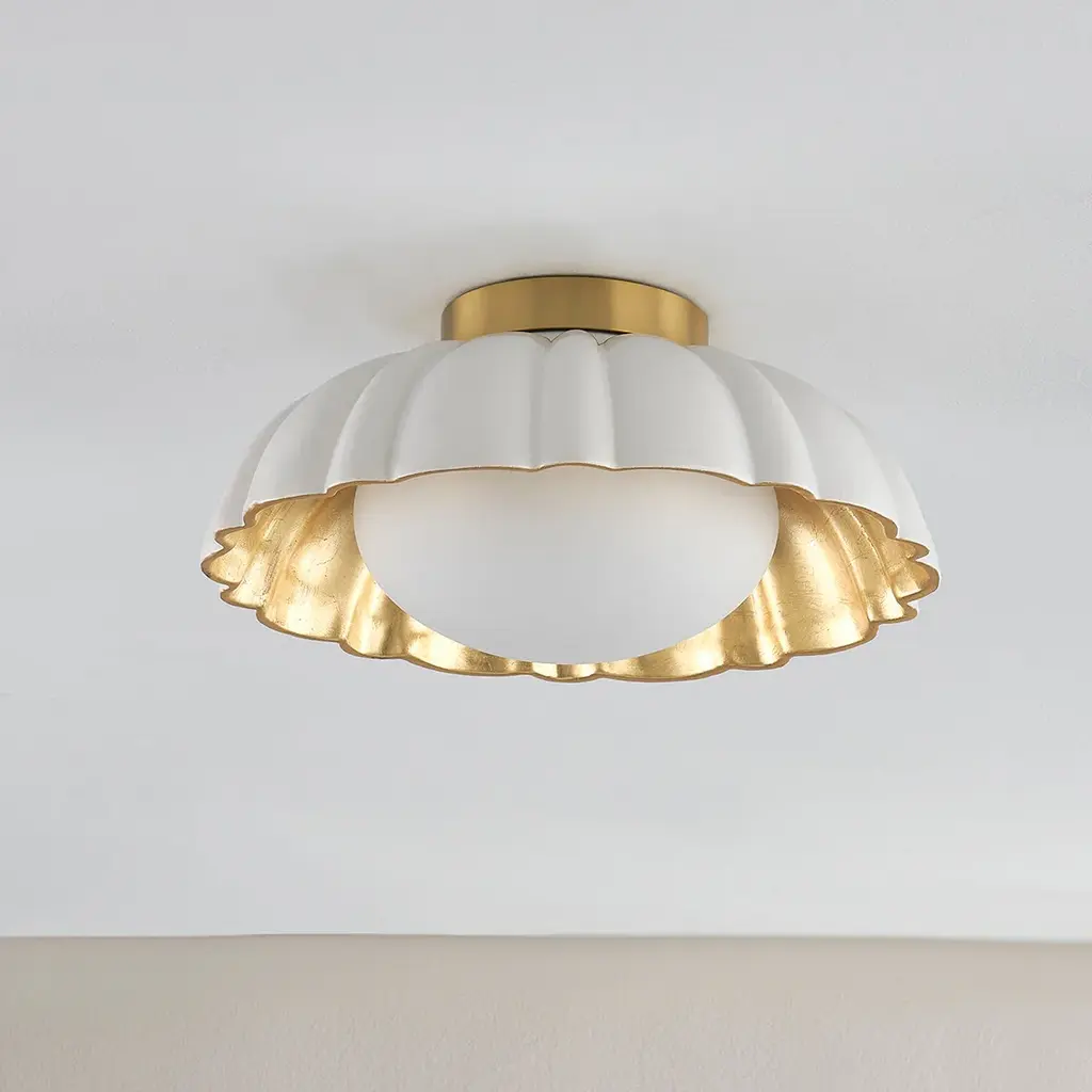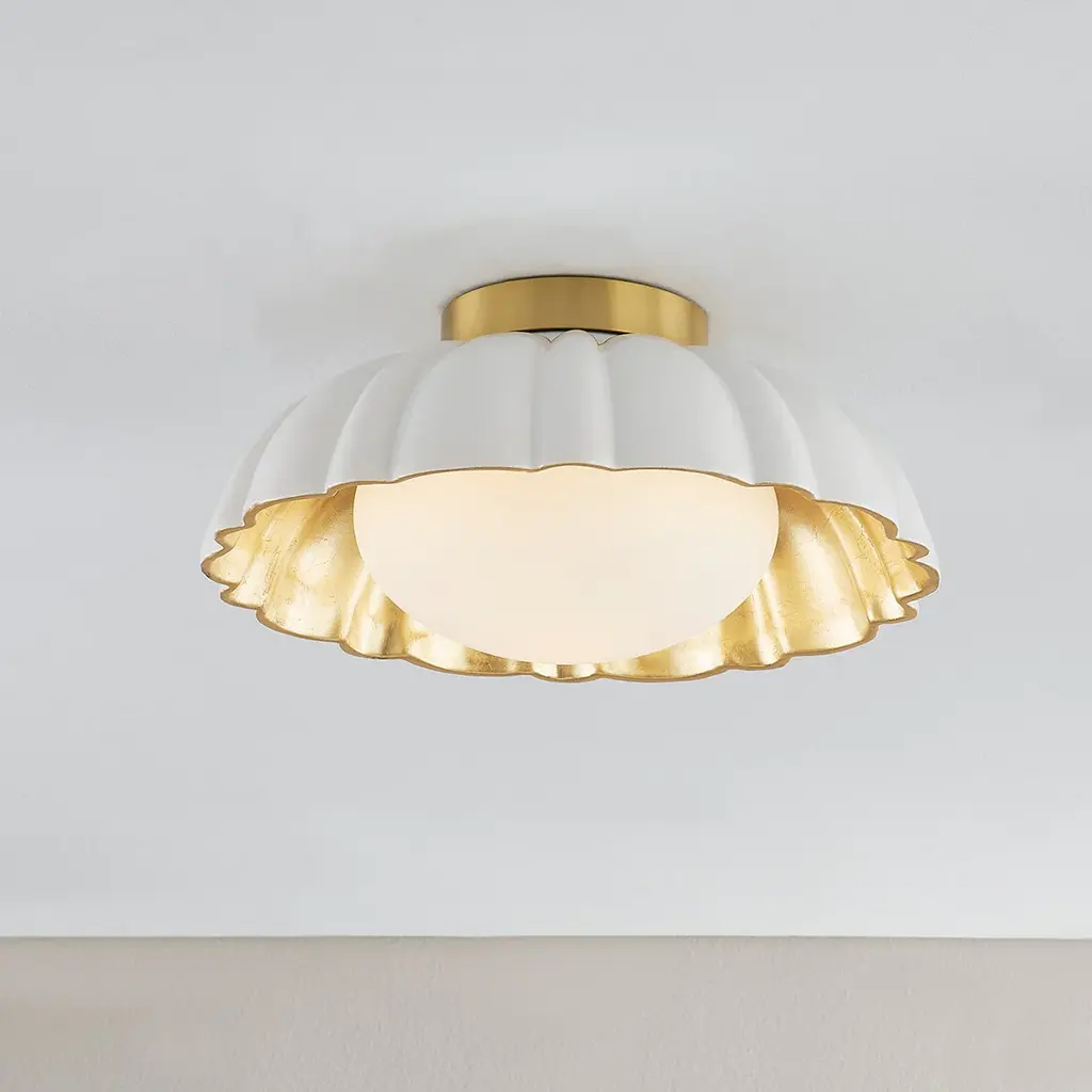 Penelope stands out as a flush mount with flare. The fluted ceramic shade is simply divine, featuring a vintage gold leaf interior that lends an earthiness to the design. An opaque shade houses a single light source, diffusing the light naturally.