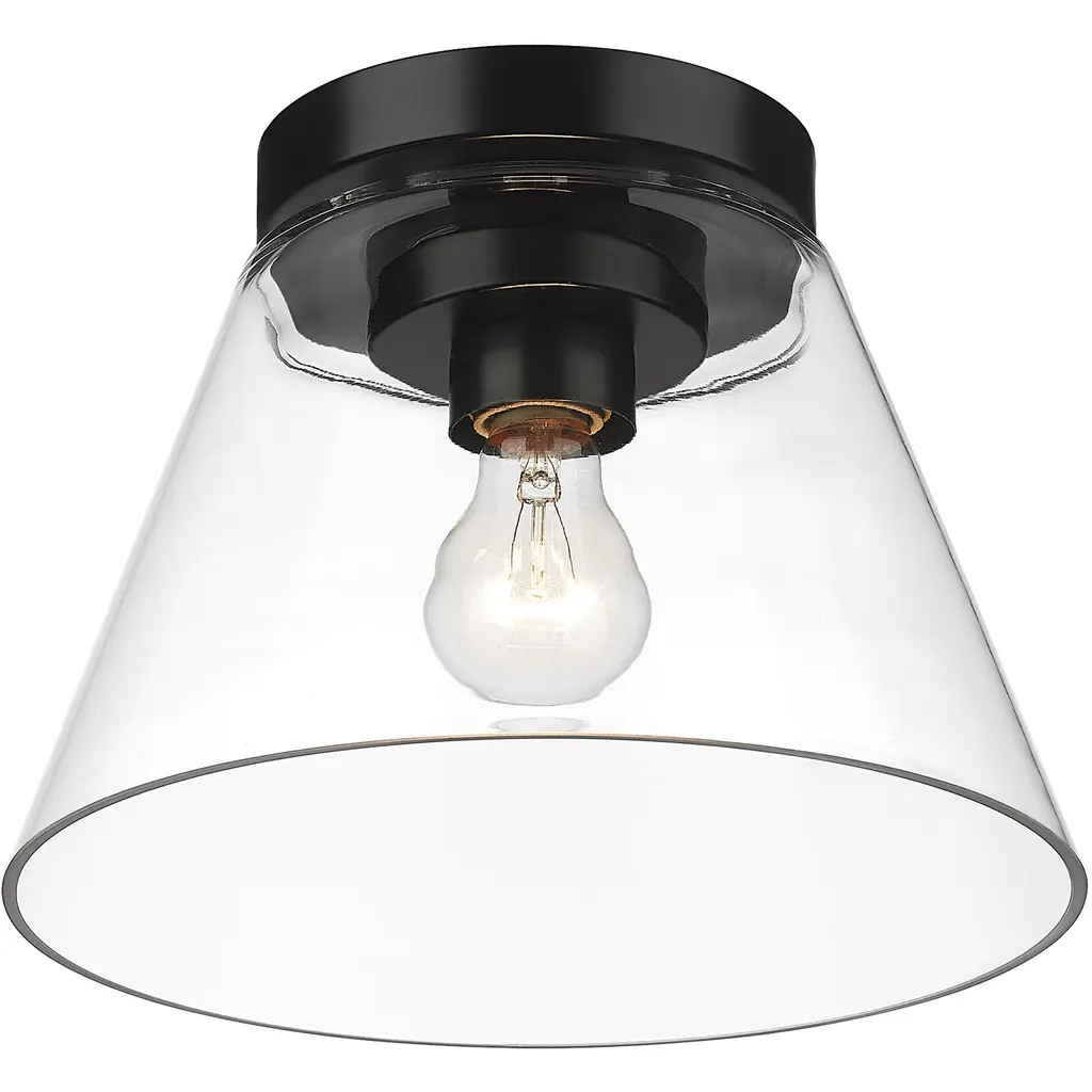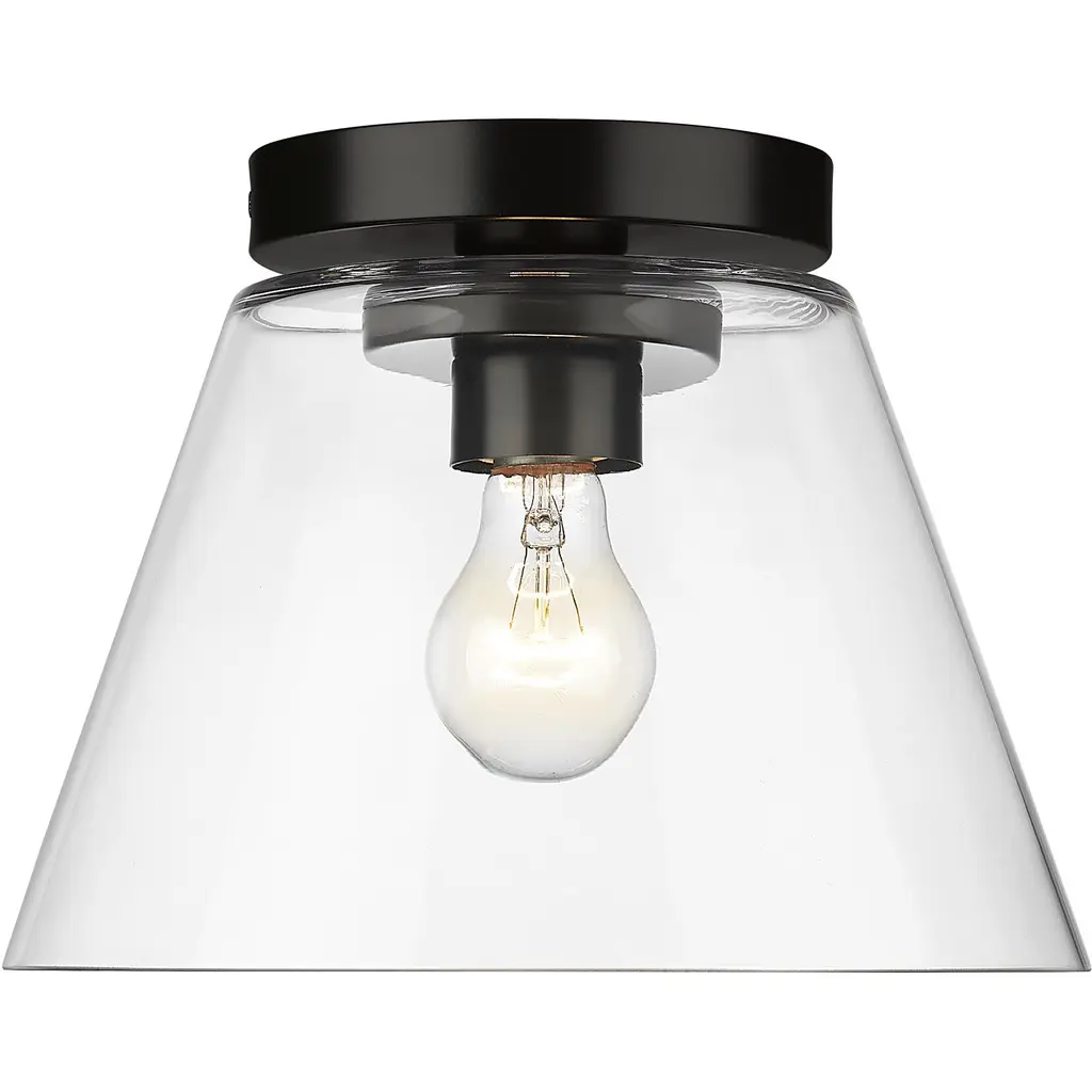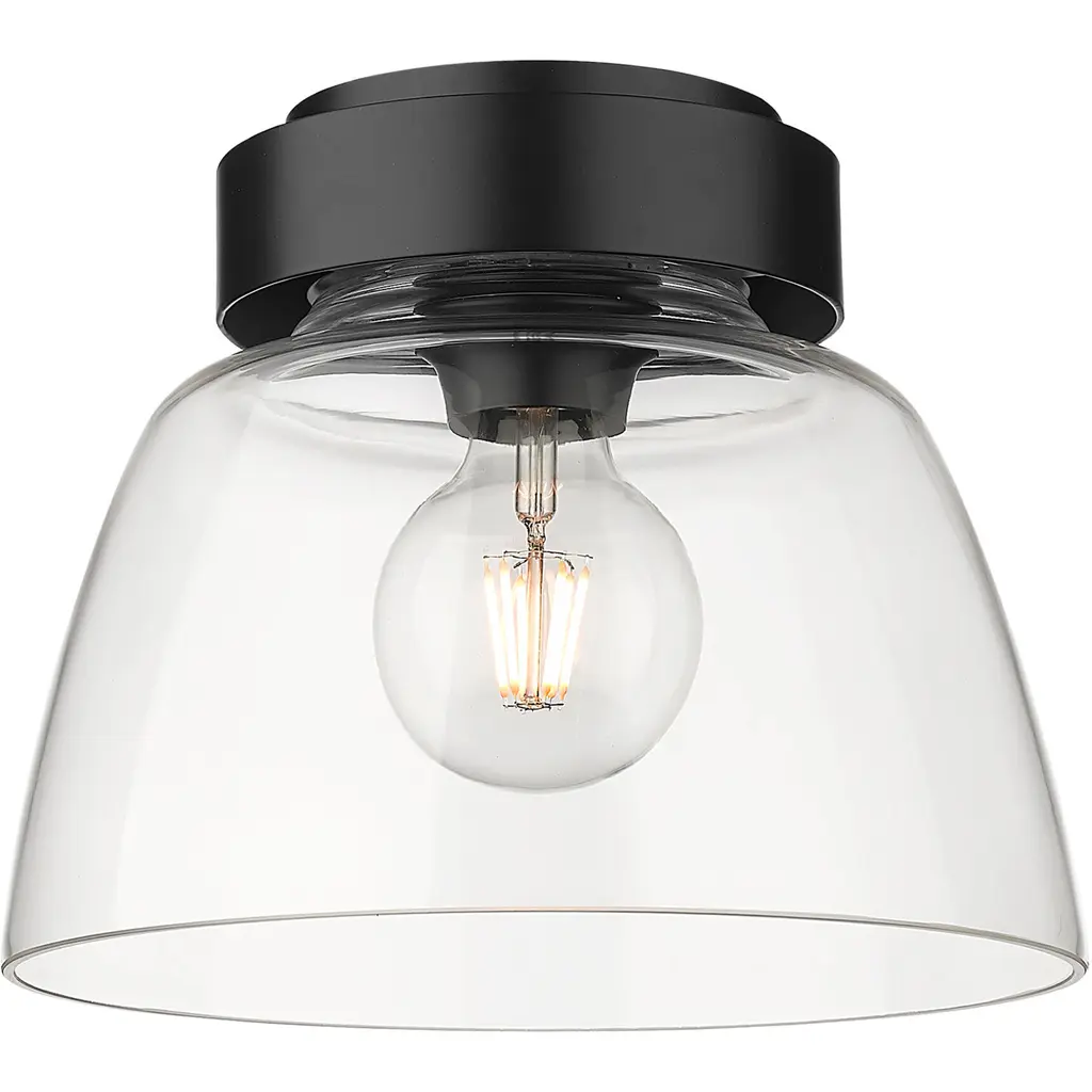 Bring modern elegance into your home with the Golden Lighting Penn 1-light Flush Mount in Matte Black. Featuring a Clear Glass shade and a Matte Black frame, it creates a welcoming atmosphere.The Clear Glass shade offers brilliant, unobstructed light, allowing the beauty of the bulb to shine. Its polished finish complements a variety of decor styles, making it ideal for spaces requiring bright illumination.The Matte Black finish is timeless, providing an understated elegance that harmonizes with almost every aesthetic.Ideal for low ceilings in hallways, closets, laundry areas, and bathrooms, this fixture is Damp Location Rated for covered areas. It requires 1 E26 Medium base bulb (not included) with a maximum wattage of 100.Overall dimensions: 11"W x 8.25"H x 11"D. This fixture combines functionality with style, enhancing your homes ambiance effortlessly.