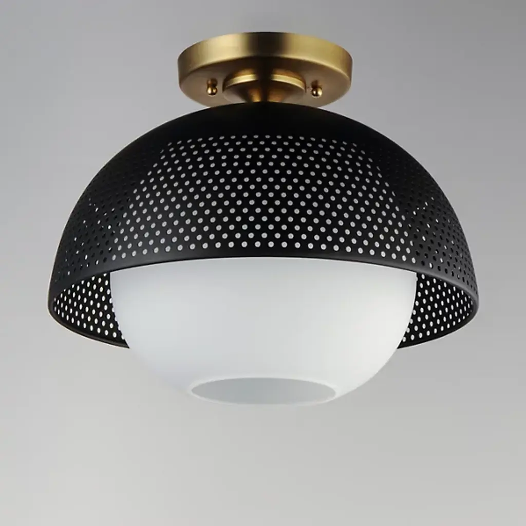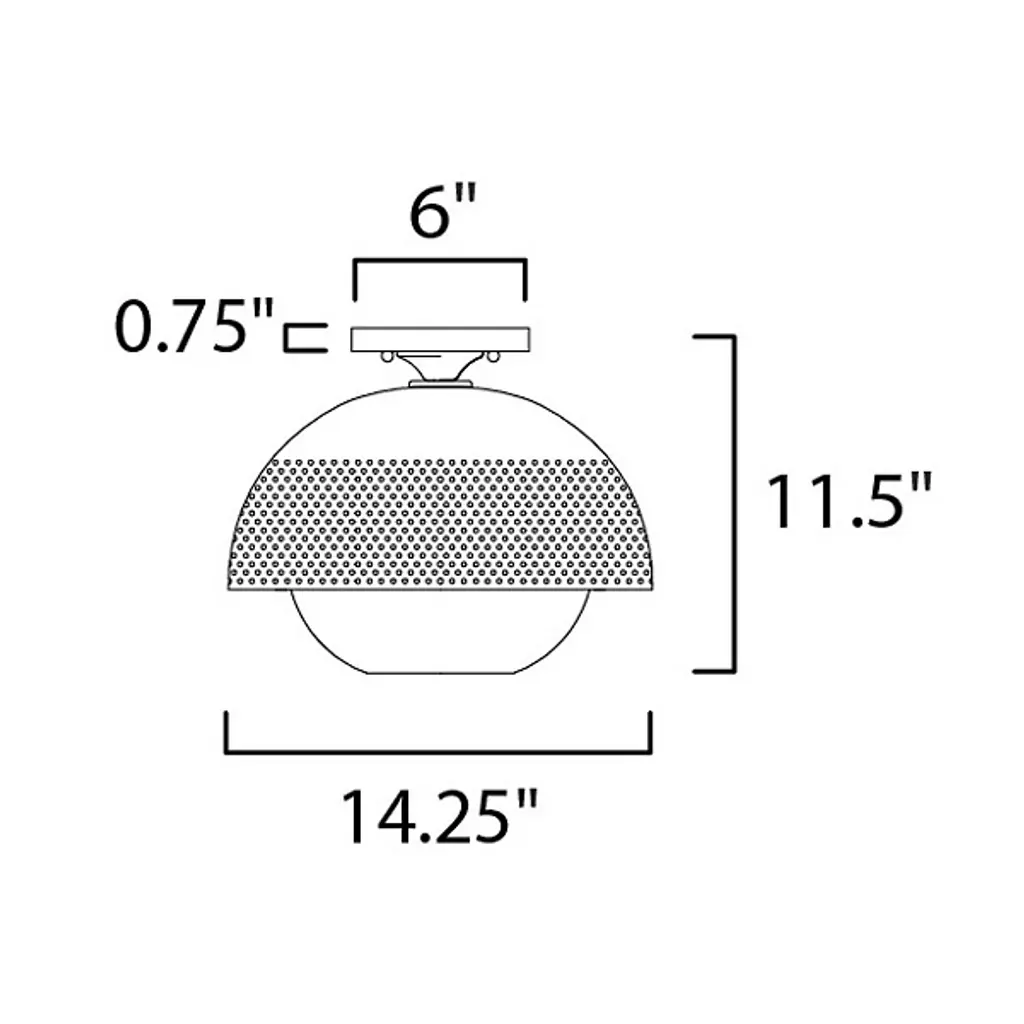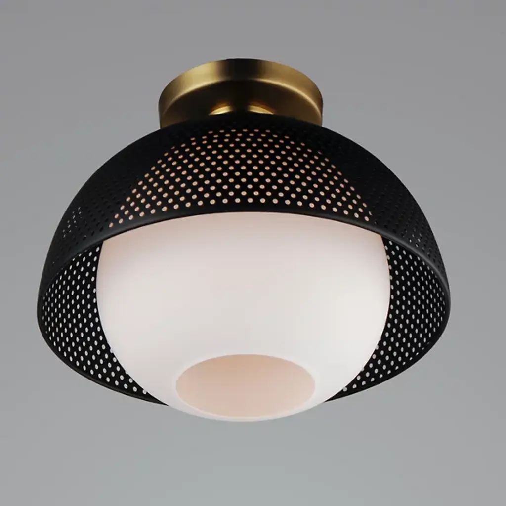 Introduce a unique display of light and shadow to the décor of your home with the Perf Flushmount from Maxim Lighting. Hanging just below the ceiling, this piece showcases a spherical glass shade and a surrounding layer of smooth, spun metal with perforated detail. The result is a dappled effect that spreads over the room when the single bulb within the shade comes to life. The light is bright and even, diffusing through the layers with ease.
