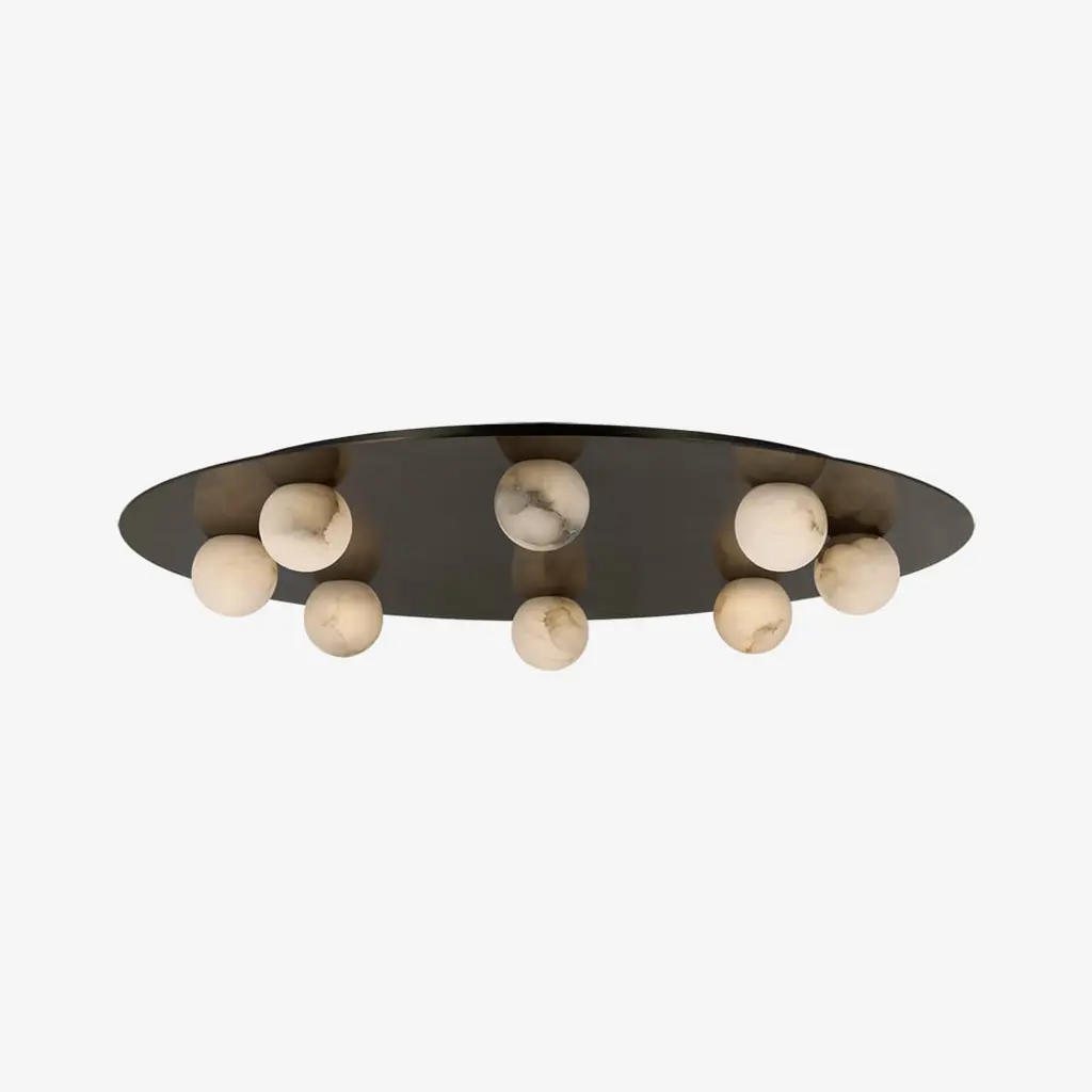 Presented by Visual Comfort Signature, the Pertica LED Flushmount is designed by Kelly Wearstler. With its flat, saucer silhouette crafted from metal, the flushmount holds multiple orbs of alabaster shading along its outer perimeter, creating a mesmerizing composition that catches the eye. Its low-profile design allows it to make a dramatic impact in both small and large spaces alike. It features eco-friendly integrated LED illumination, enveloping your space in a warm and inviting glow.