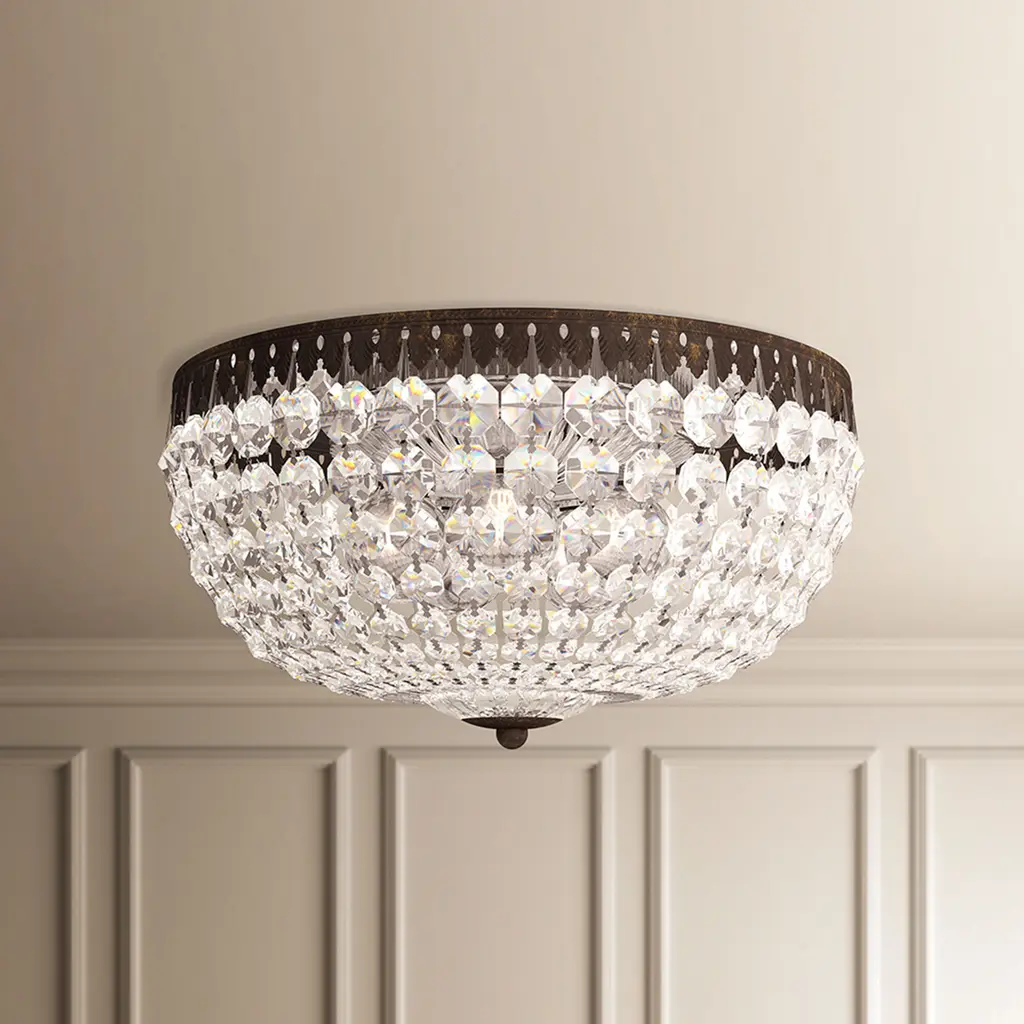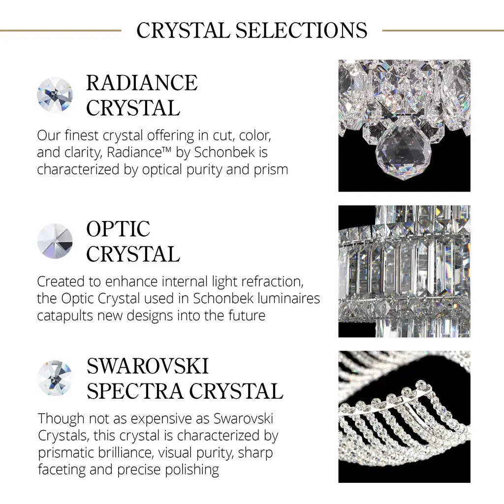 Inspired by the classical crystal basket designs and the purity of neoclassical lines, Petit Crystal features a densely woven crystal surface displaying concentric jewels of descending size that diffuse illumination over spaces below with shimmering vibrancy. Classical crystal basket design with neoclassical lines for a timeless lookDensely woven crystal surface with concentric jewels of descending size for shimmering vibrancyDesigned and manufactured in the U.S.A. with a durable steel frameCrystal basket formed with strands of octagons in 2 crystal trim options: Optic, Radiance, or Swarovski Spectra crystalsOptic crystal offers the future of crystal with precision engineering used in scientific telescopes and medical equipmentSchonbek's premium Radiance Crystal: optically pure, brilliant, lead-free, flawlessly crafted in Europe, and with nearly double the jewel-cut facets of traditional bohemian crystal
