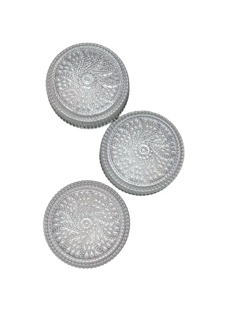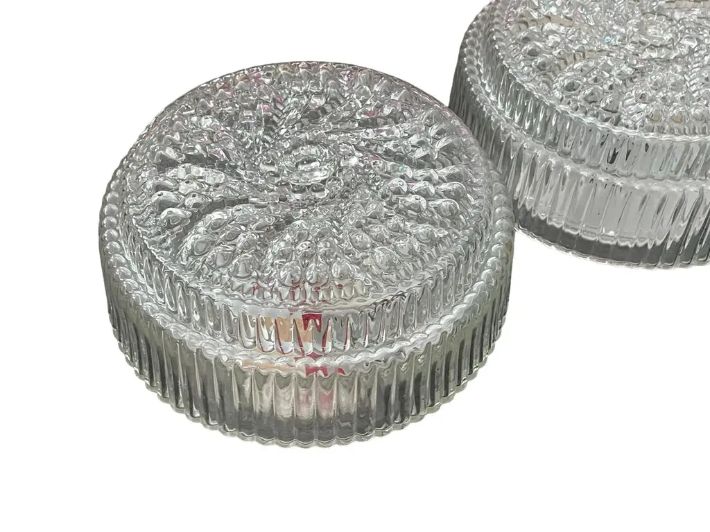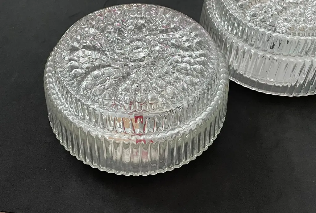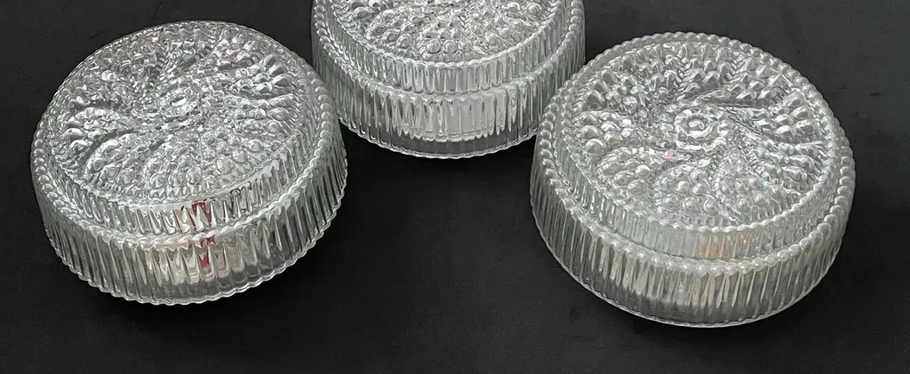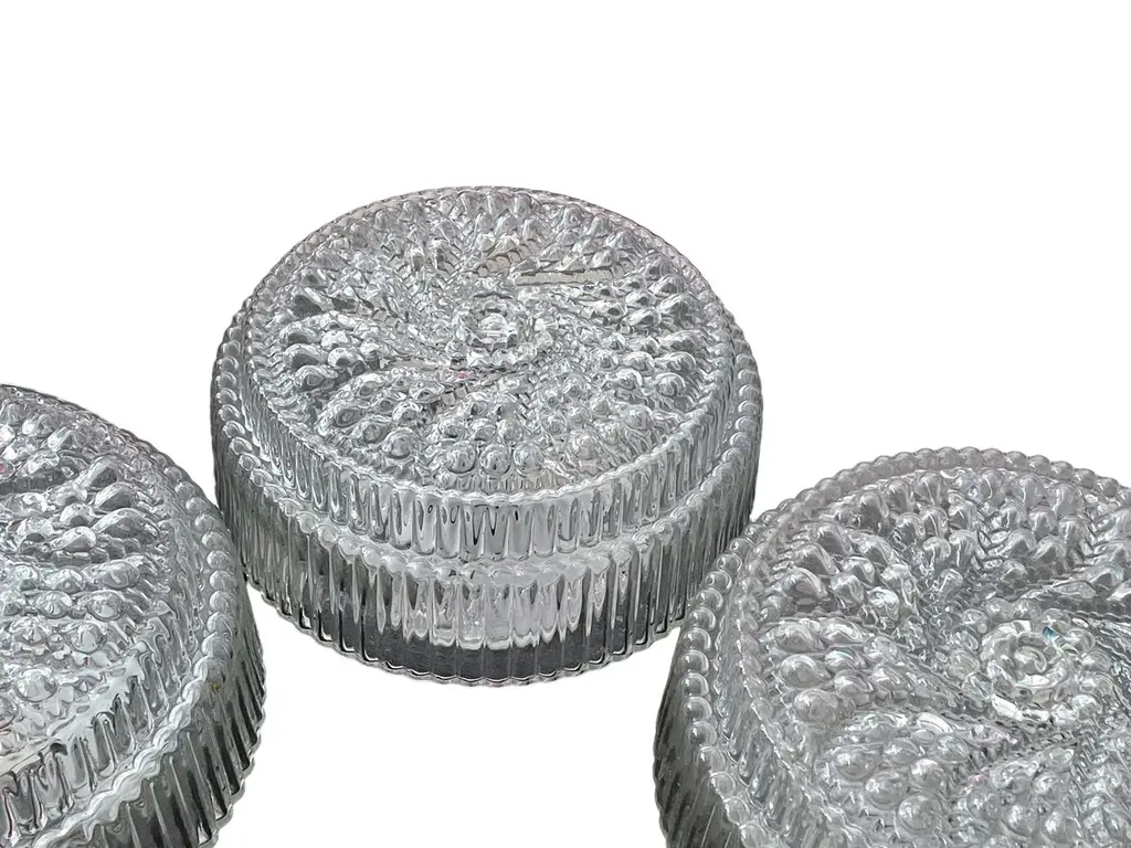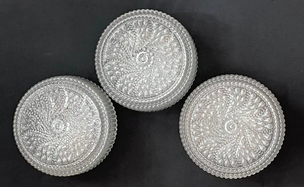 A gorgeous set of flush mount by Hustadt Leuchten Germany. Heavy thick glass on a metal fixture. Some oxidation the mounting metal plate but not visible when attached to the ceiling. Each Fixture requires one European E14 / 110 Volt Candelabra bulb, up to 40 watts. A nice addition to any room. Three available each sold individually.