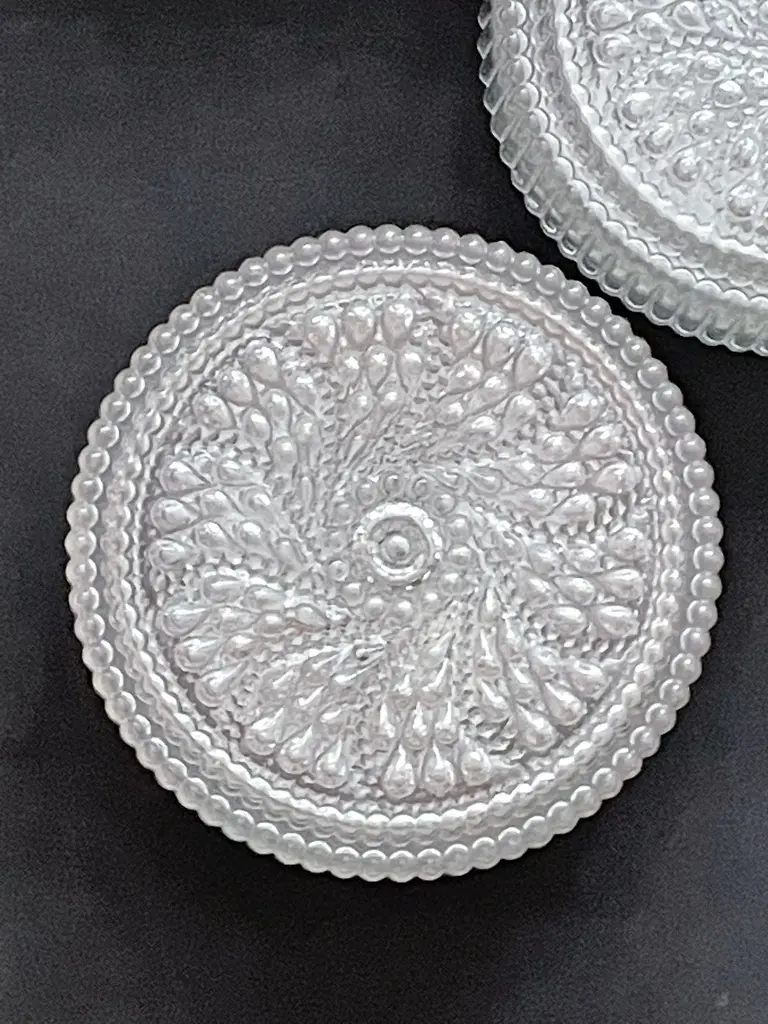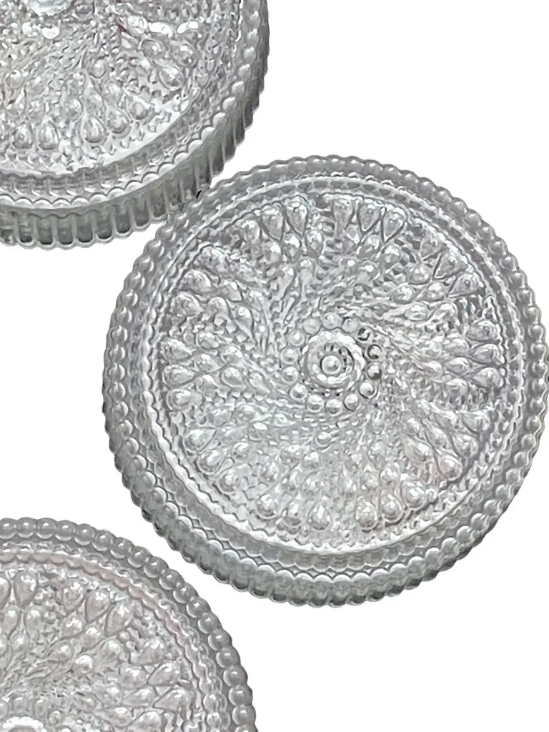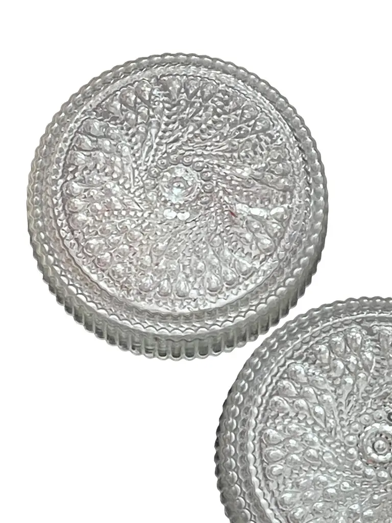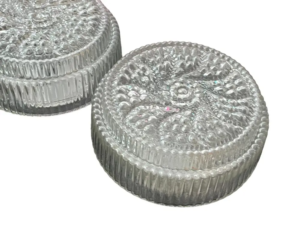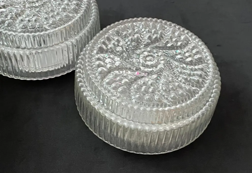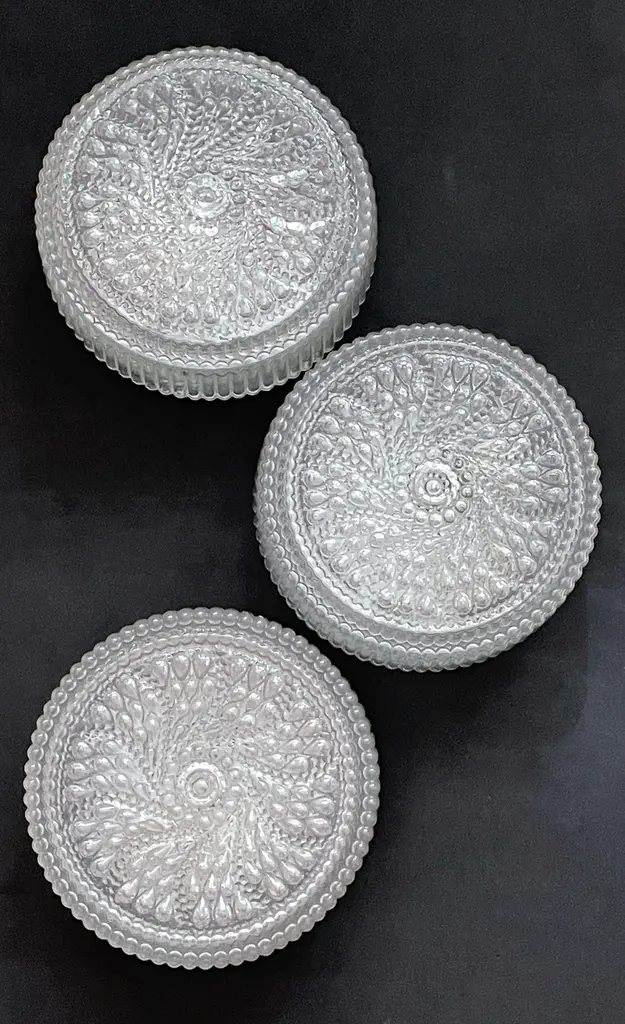 A gorgeous set of flush mount by Hustadt Leuchten Germany. Heavy thick glass on a metal fixture. Some oxidation the mounting metal plate but not visible when attached to the ceiling. Each Fixture requires one European E14 / 110 Volt Candelabra bulb, up to 40 watts. A nice addition to any room. Three available each sold individually.