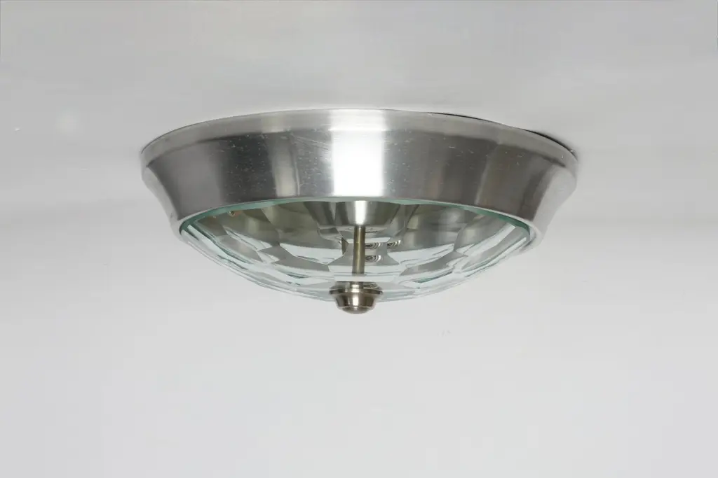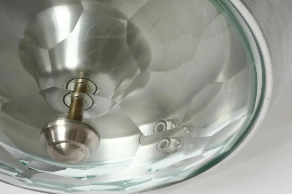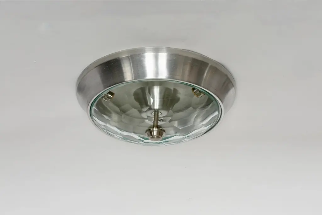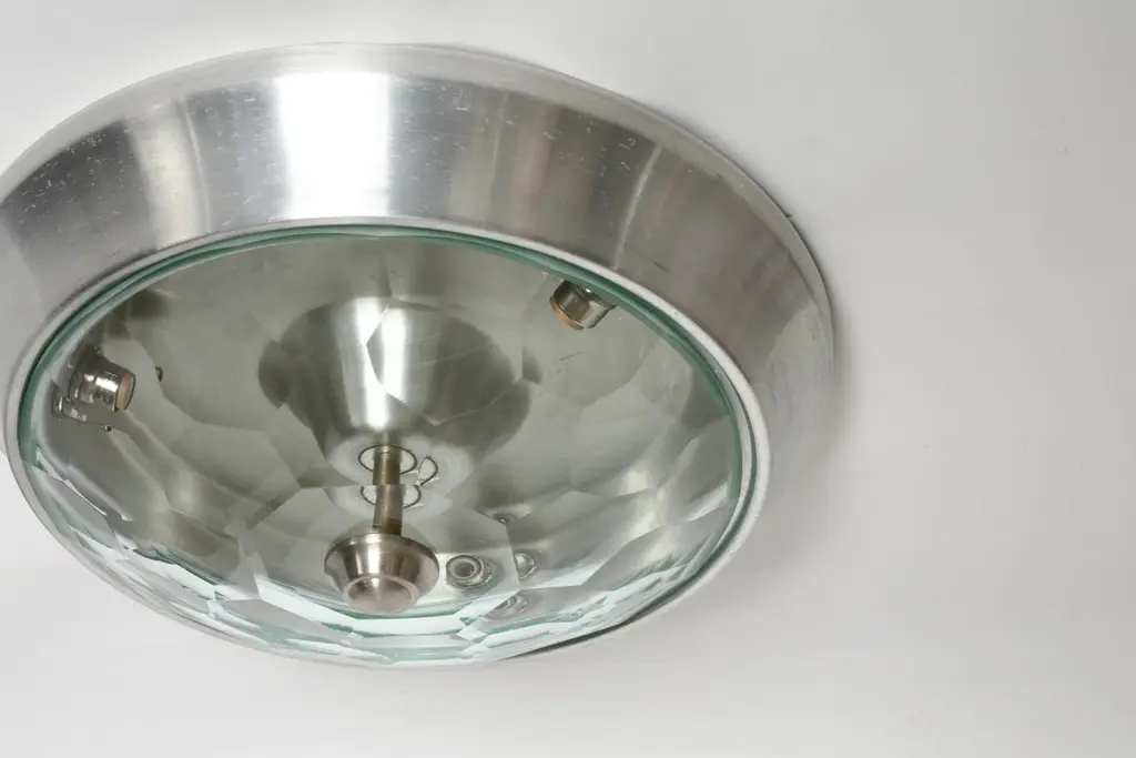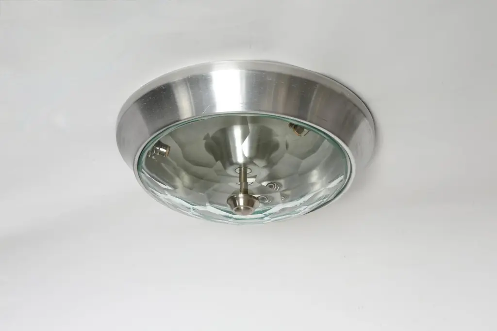 Pia Guidetti Crippa for Lumi flush mount ceiling lightMade in Italy, 1960sFaceted glass shades, aluminum frames.Takes 3 candelabra sockets each. Rewired for US.Price is for one light.3 fixtures are available.FREE US rewiring upon request.FREE US Continental shipping.NO TARIFFS, Duties or Customs fees on US orders.We are located in the US.We take pride in bringing vintage fixtures to their full glory again.At Illustris Lighting our main focus is to deliver lighting fixtures to our clients in ready to install condition. Every item in our collection goes through strict condition inspection and receives careful restoration if it’s needed.We work with highly skilled restorers, the very best in the business. They are experts in European lighting and happy to do custom modifications, exquisite patinas and give the vintage lights their second lease on life.Every single fixture comes with a complimentary US rewiring and adapted to US standards.