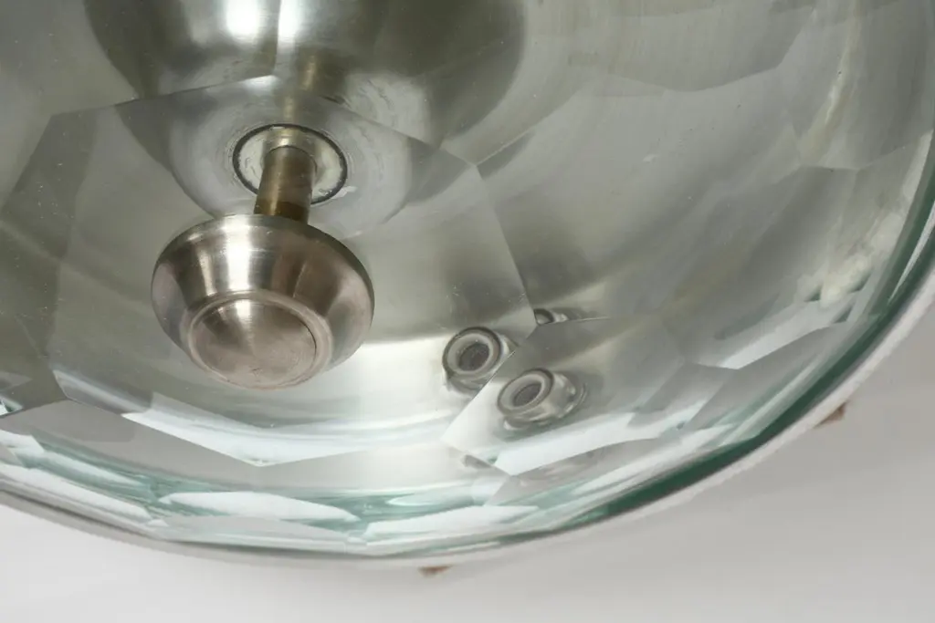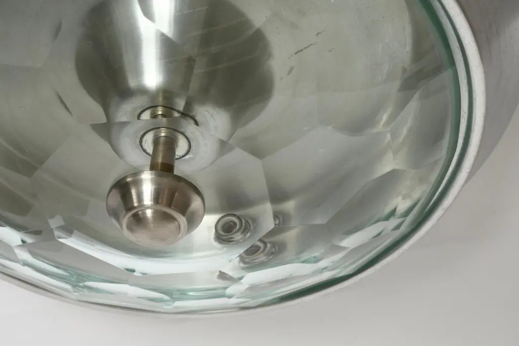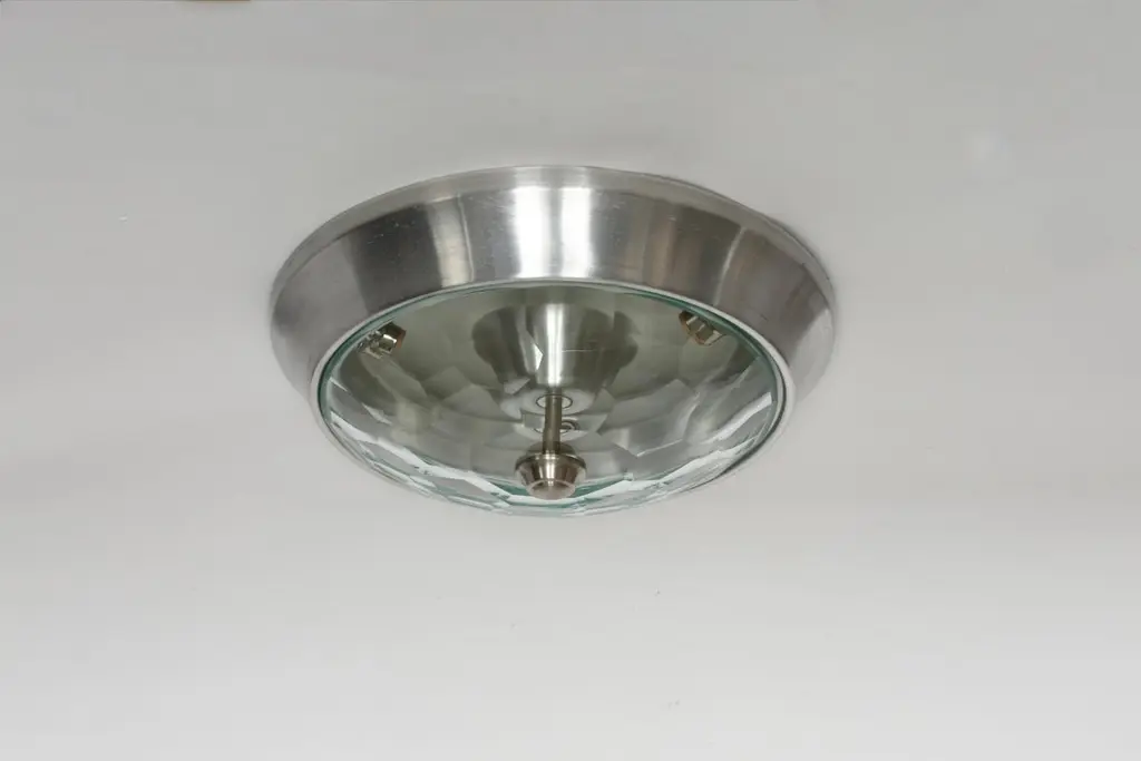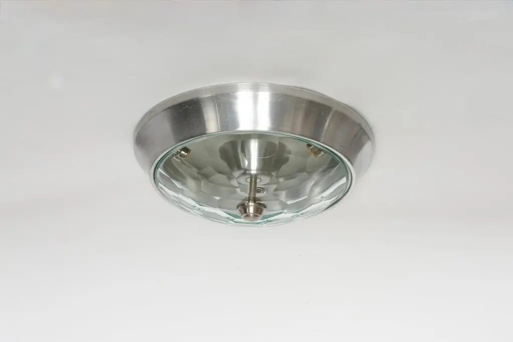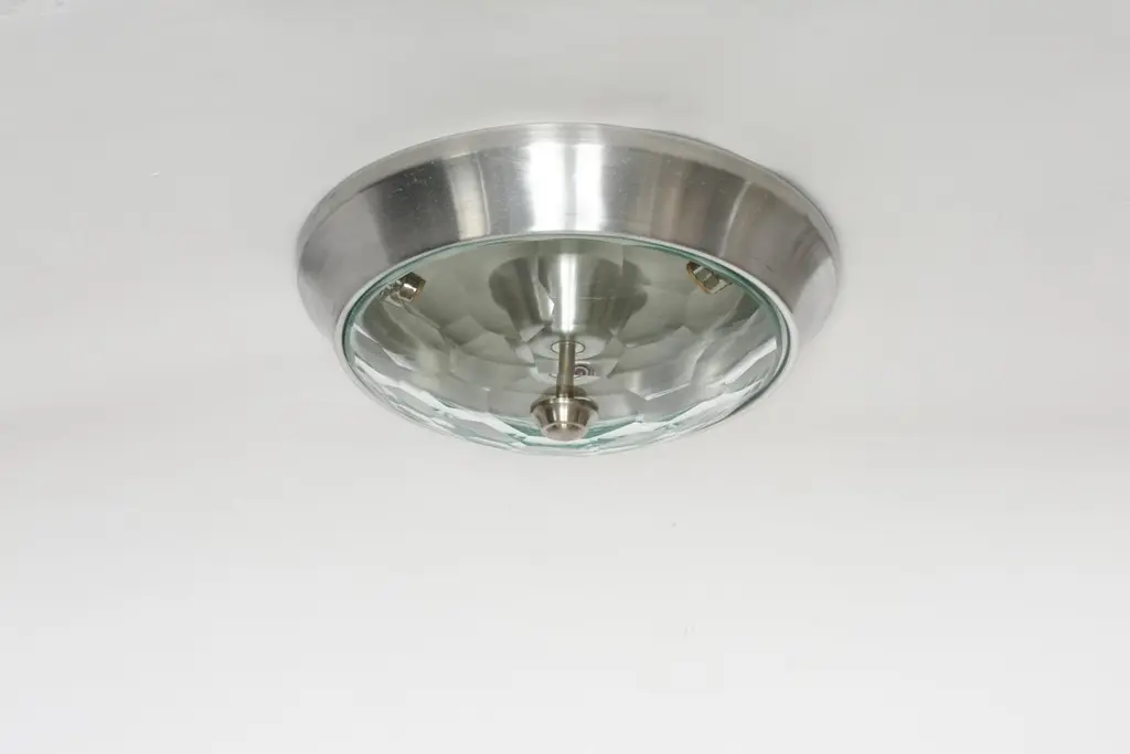 Pia Guidetti Crippa for Lumi flush mount ceiling light.Made in Italy, 1960sFaceted glass shades, aluminum frames.Takes 3 candelabra sockets each. Rewired for US.Price is for one light.3 fixtures are available.FREE US rewiring upon request.FREE US Continental shipping.NO TARIFFS, Duties or Customs fees on US orders.We are located in the US.We take pride in bringing vintage fixtures to their full glory again.At Illustris Lighting our main focus is to deliver lighting fixtures to our clients in ready to install condition. Every item in our collection goes through strict condition inspection and receives careful restoration if it’s needed.We work with highly skilled restorers, the very best in the business. They are experts in European lighting and happy to do custom modifications, exquisite patinas and give the vintage lights their second lease on life.Every single fixture comes with a complimentary US rewiring and adapted to US standards.