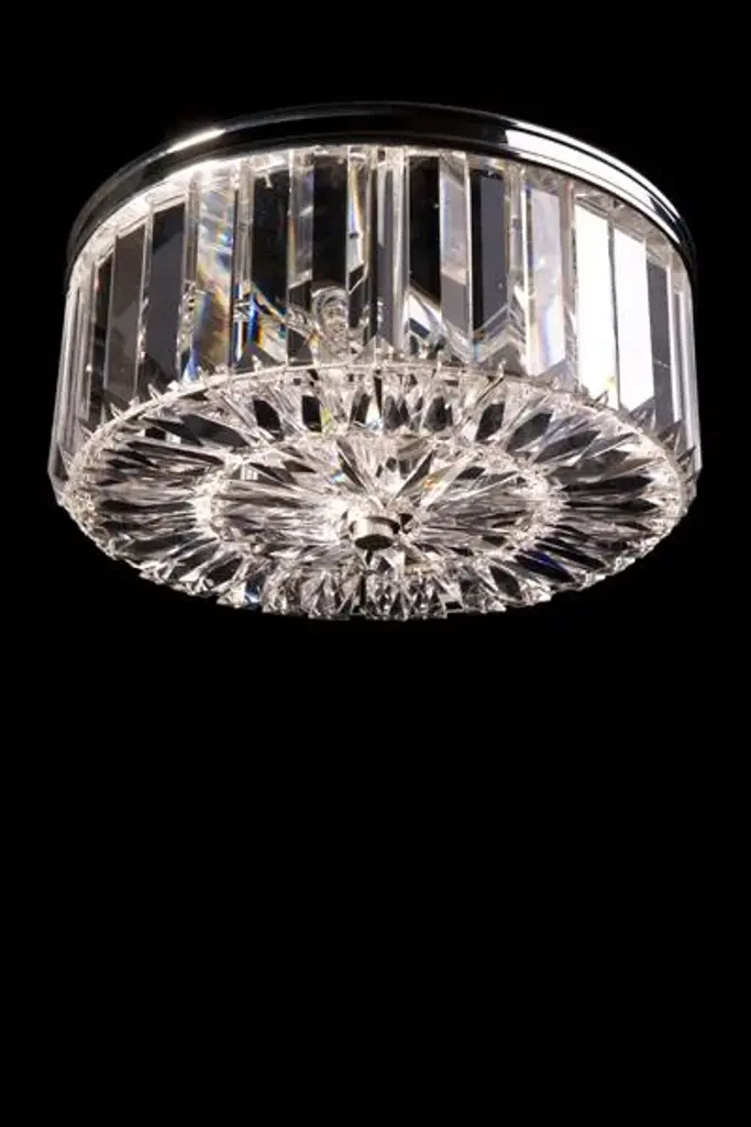 Cut crystal flush mount, 4 inch baguette crystals on outside, patterned crystal on bottom, Cast rim surround on top of fixture.