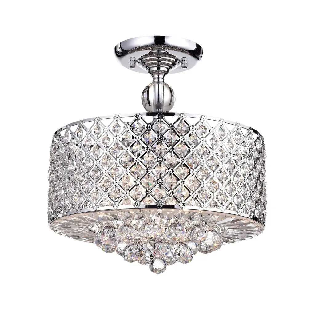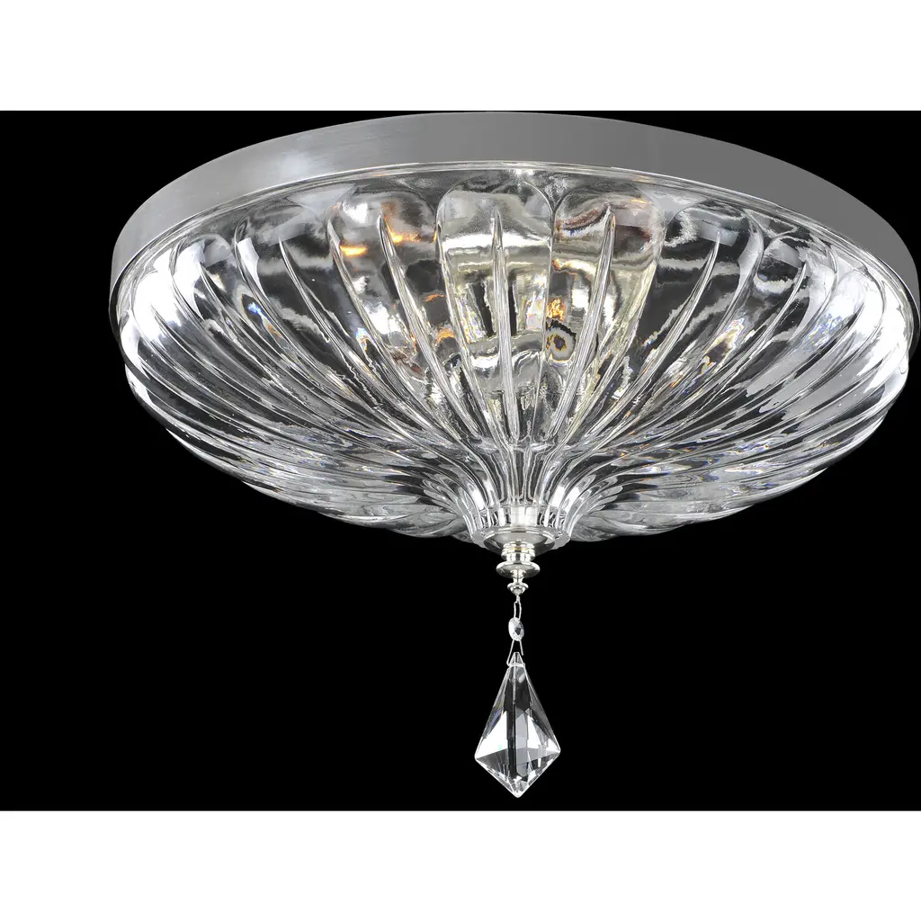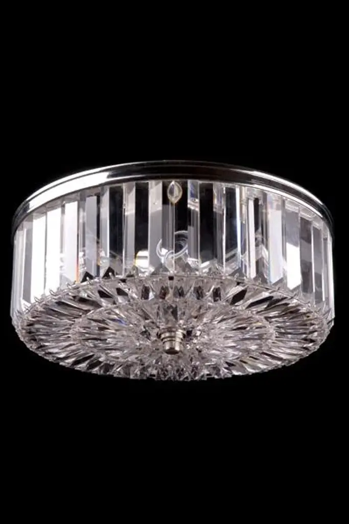 Cut crystal flush mount, 4 inch baguette crystals on outside, patterned crystal on bottom, Cast rim surround on top of fixture.
