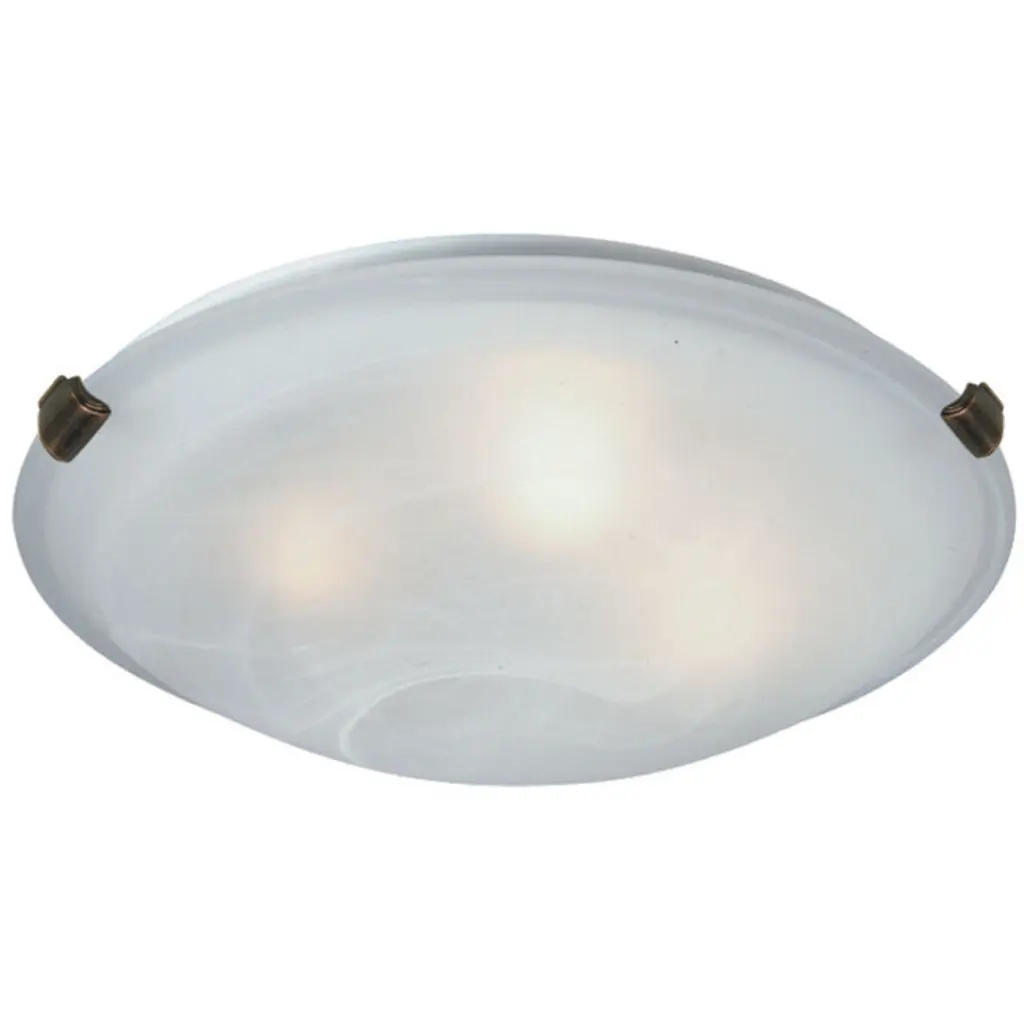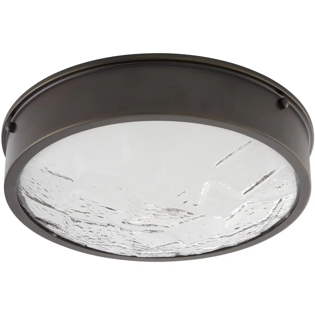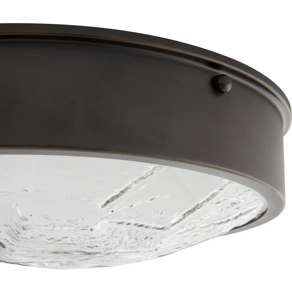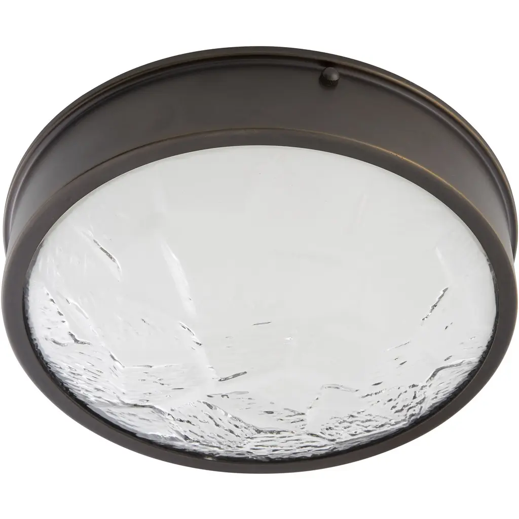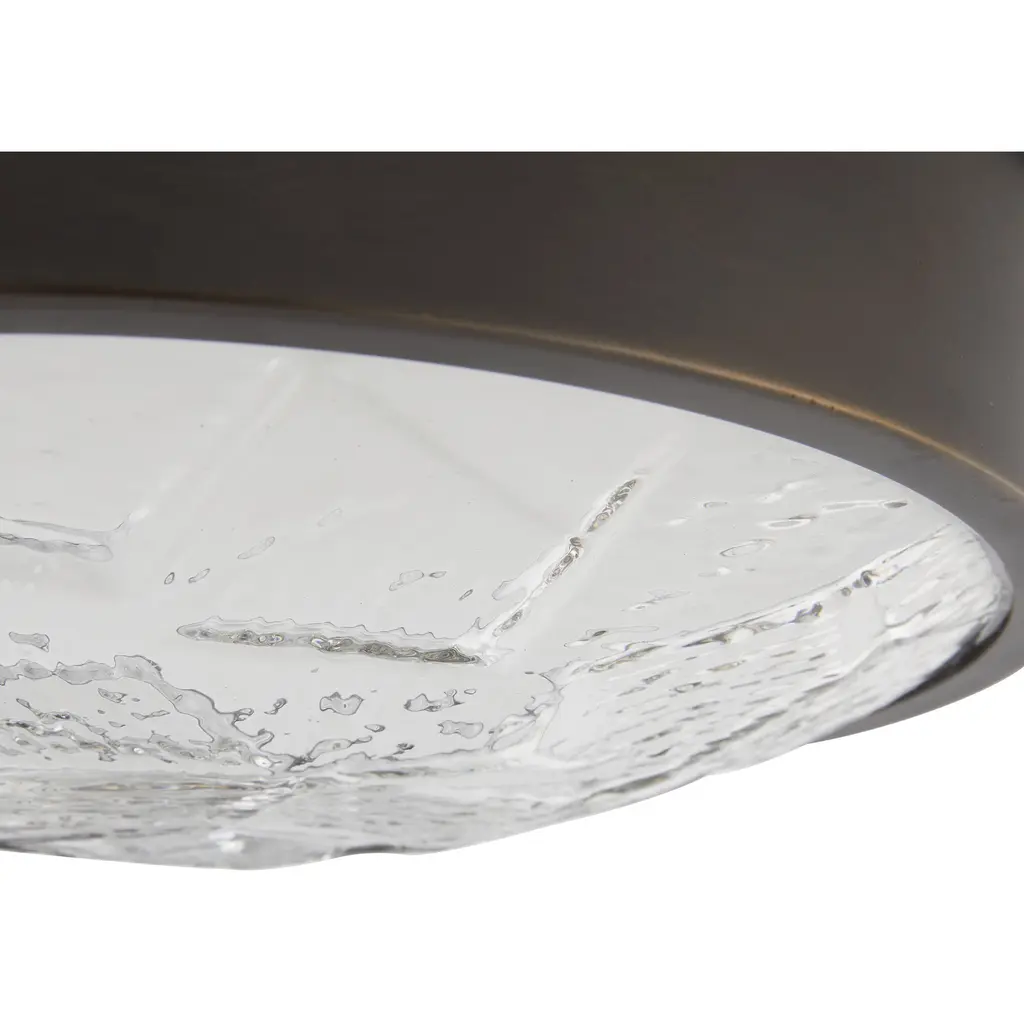 The glass shade of this flushmount fixture is reminiscent of glass making in the 20th century. The molded clear glass and with the english bronze steel frame updates the typical flushmount fixture and brings style to any room, hallway, bathroom or closet. Finish will vary.